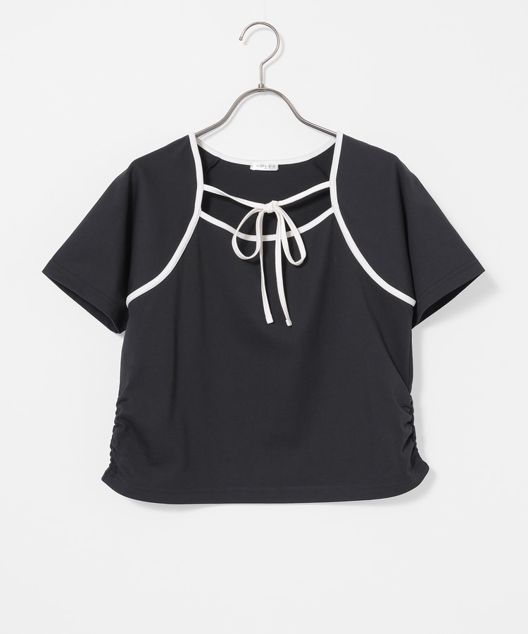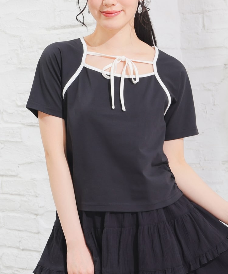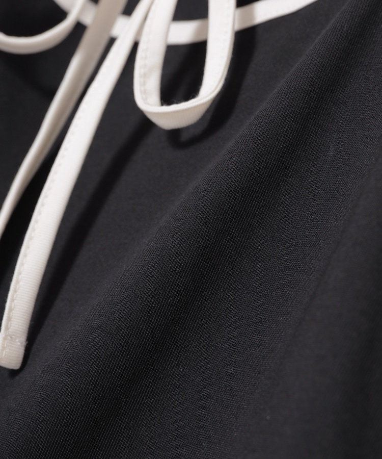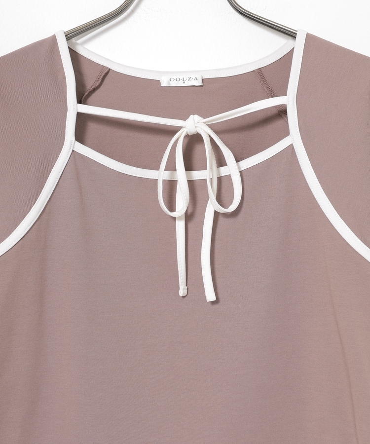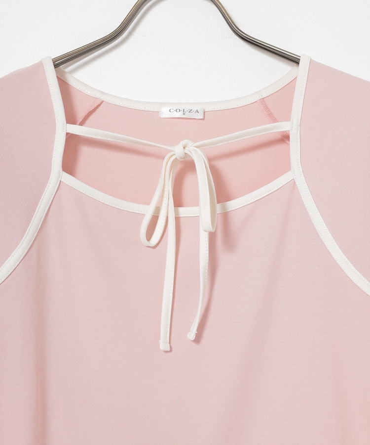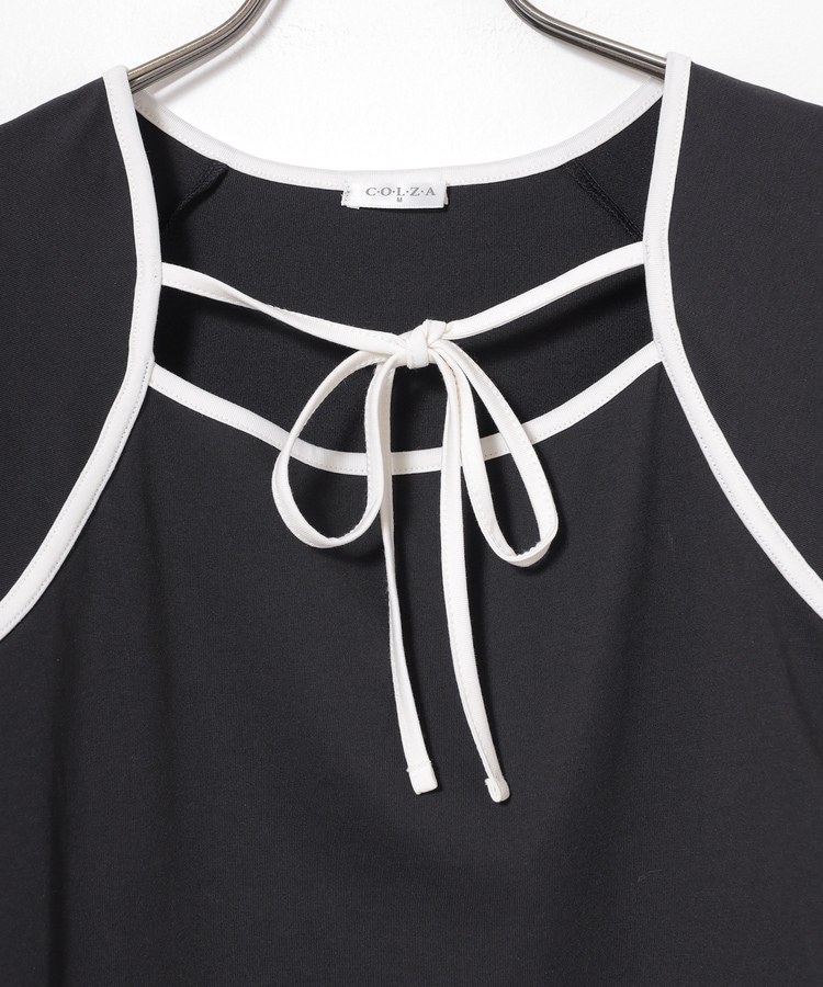 衿ぐりの配色パイピングとホルターリボンが可愛い、1枚で着映えるデザイン。