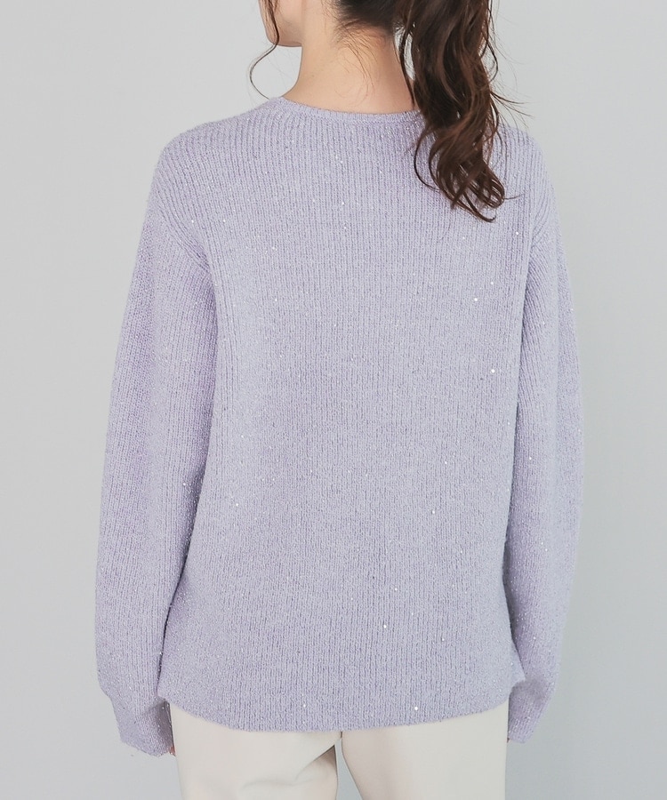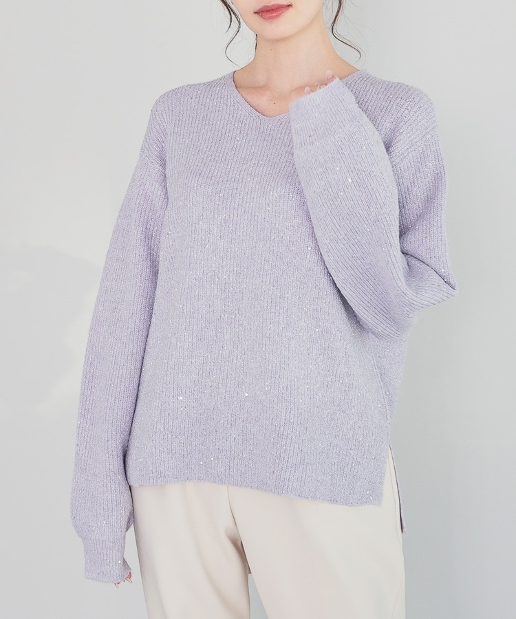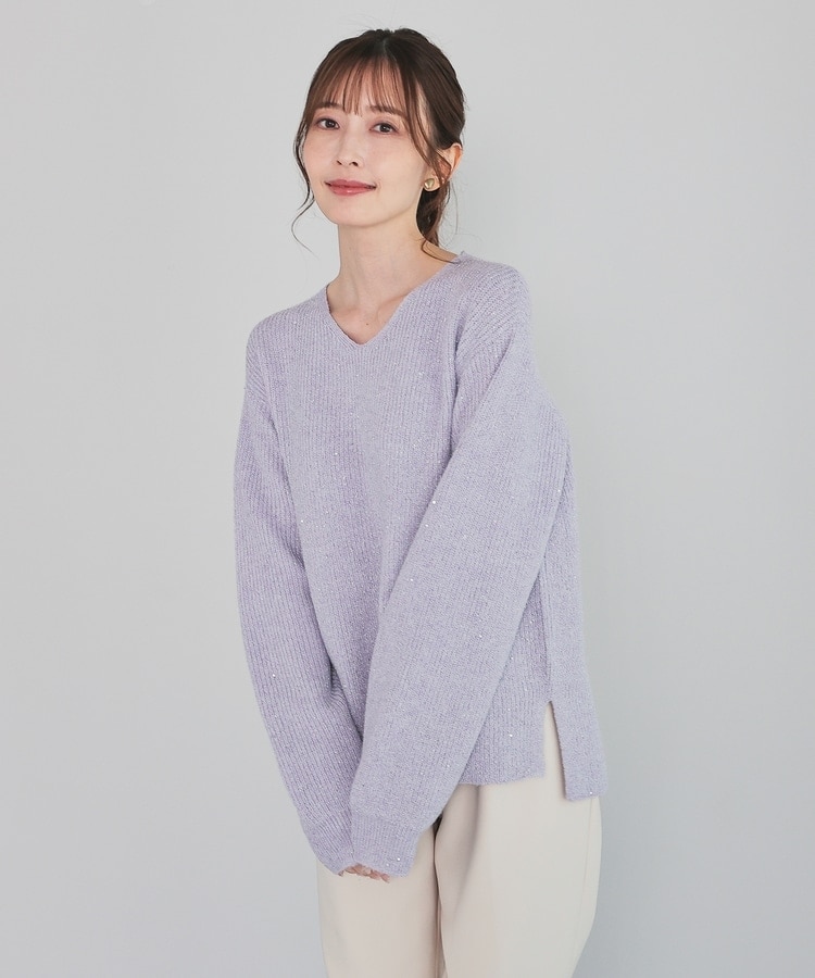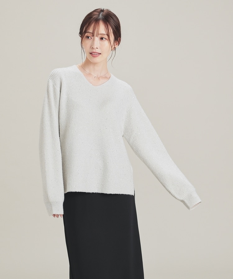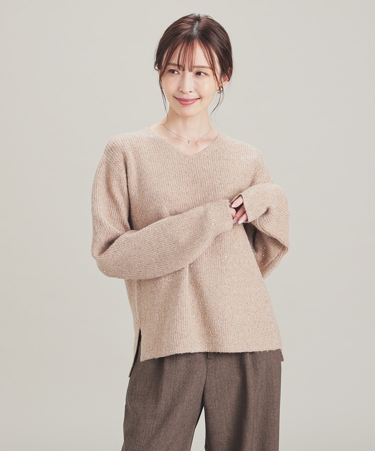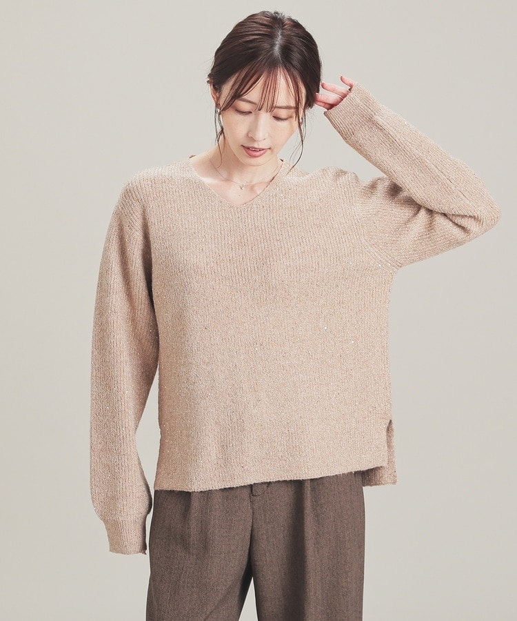 顔周りをすっきりみせるシンプルなVネックデザインに、トレンドのスパンコール付きラメ糸で華やかさをプラス。