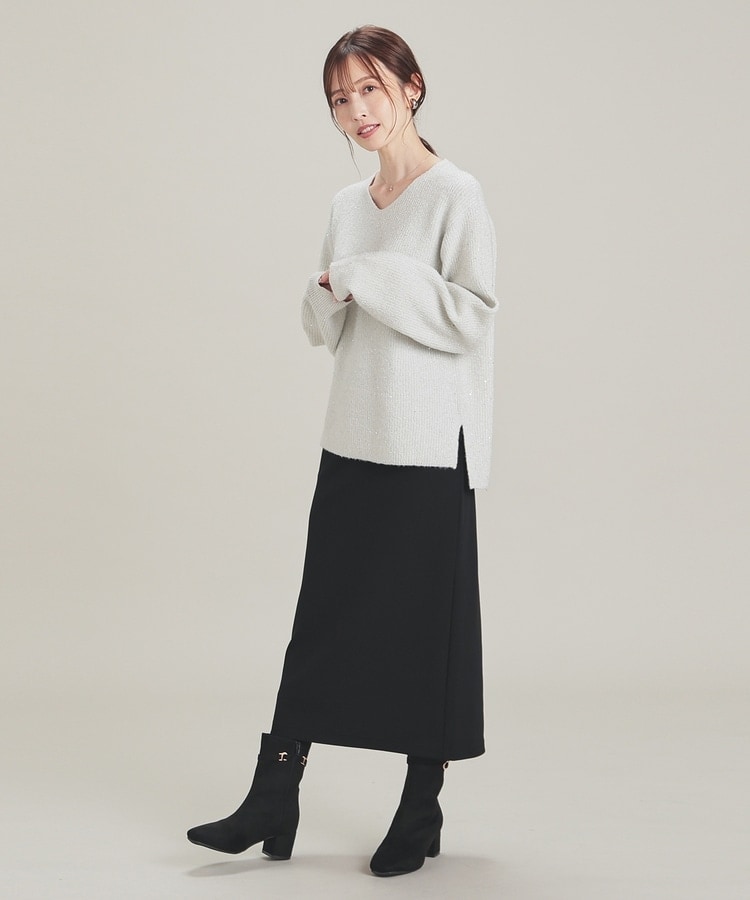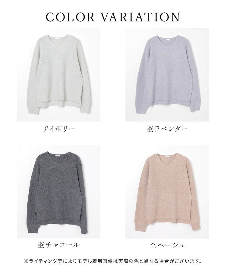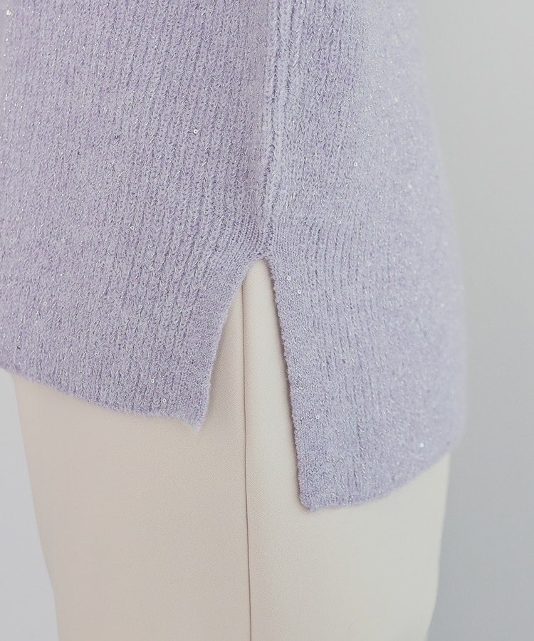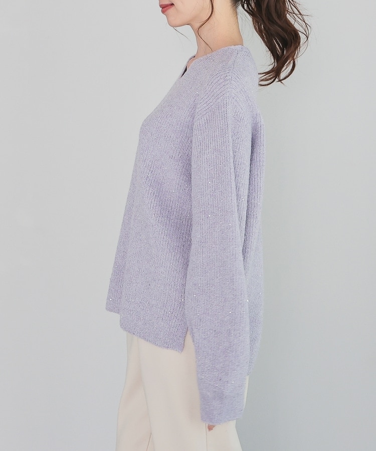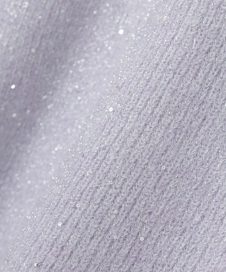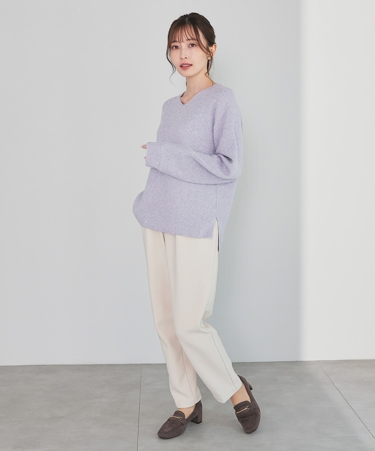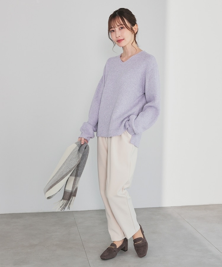 顔周りをすっきりみせるシンプルなVネックデザインに、トレンドのスパンコール付きラメ糸で華やかさをプラス。