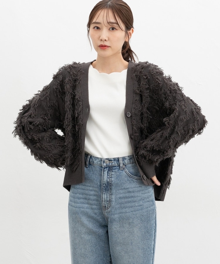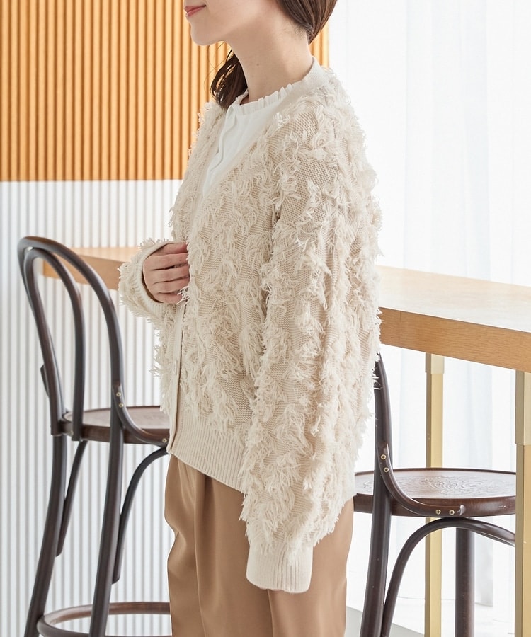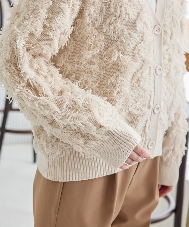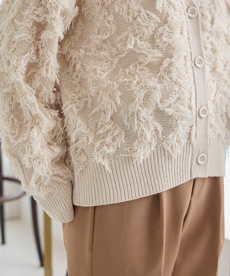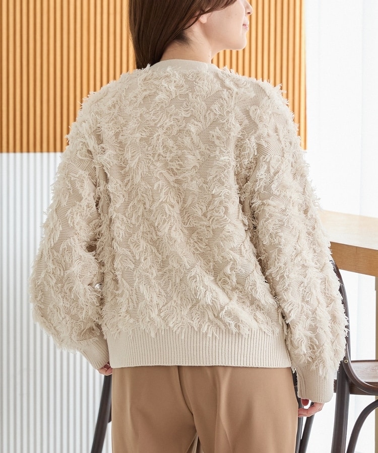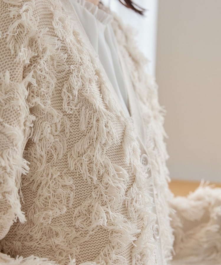 立体感のある柔らかな毛足のフリンジ編ニット素材。