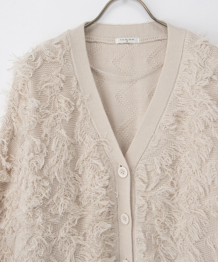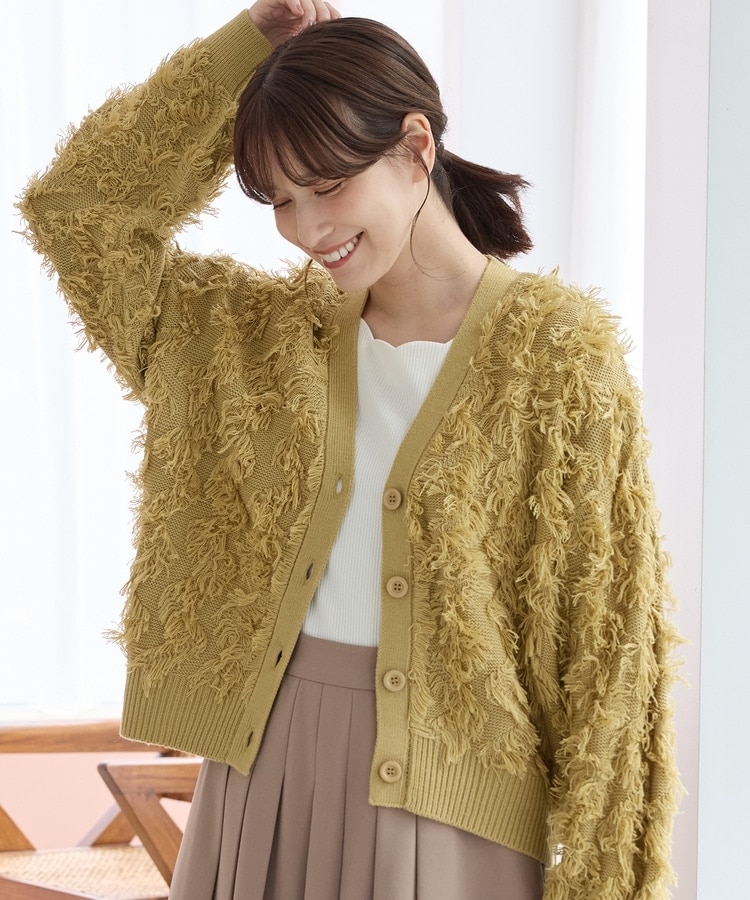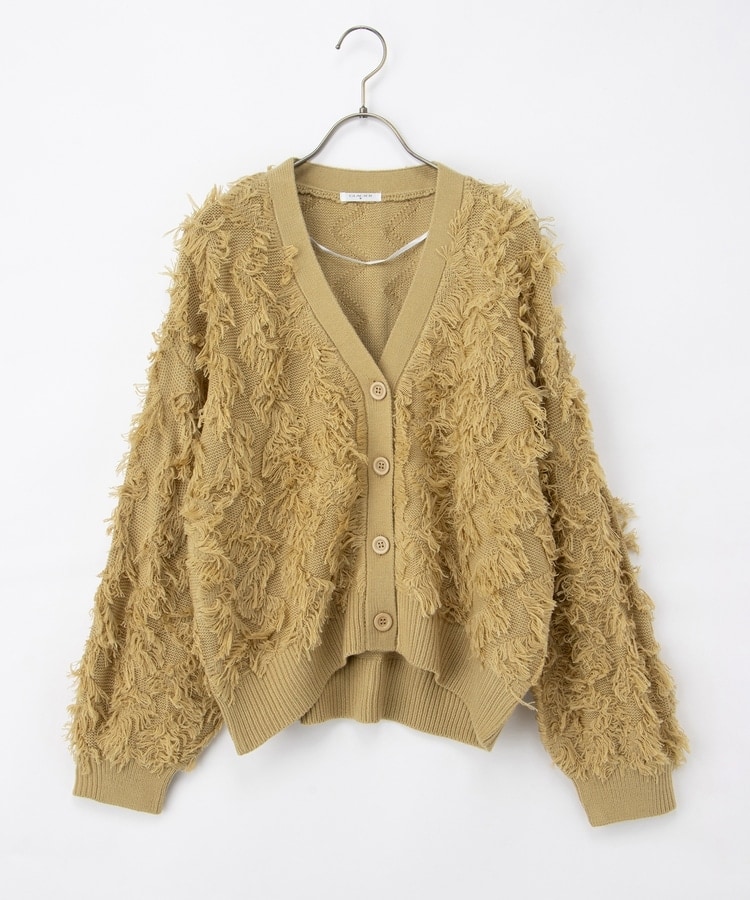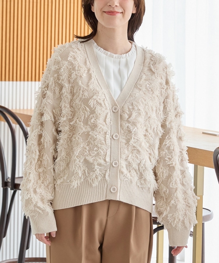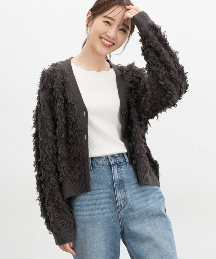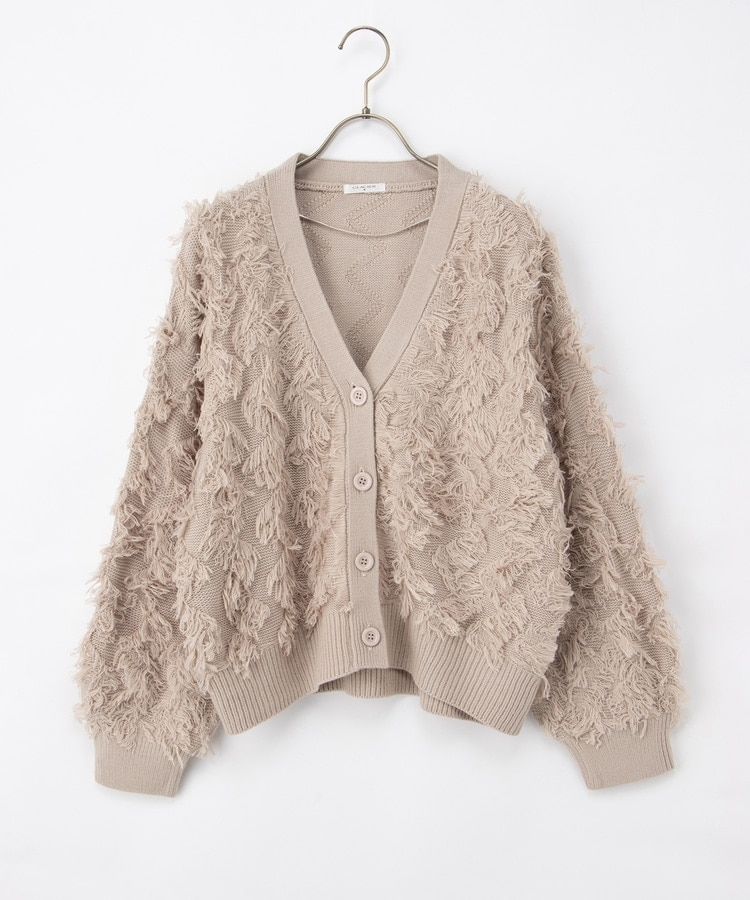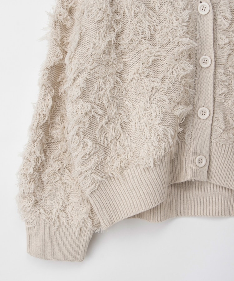立体感のある柔らかな毛足のフリンジ編ニット素材。