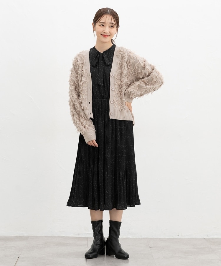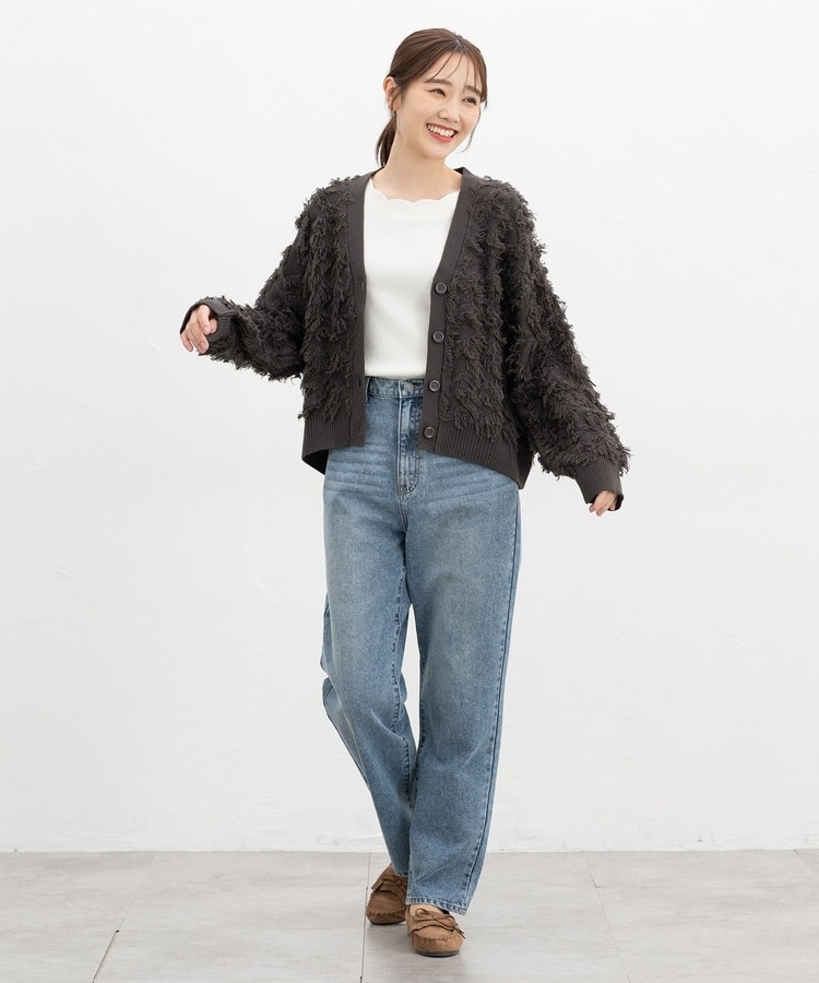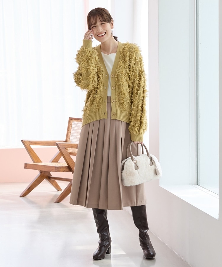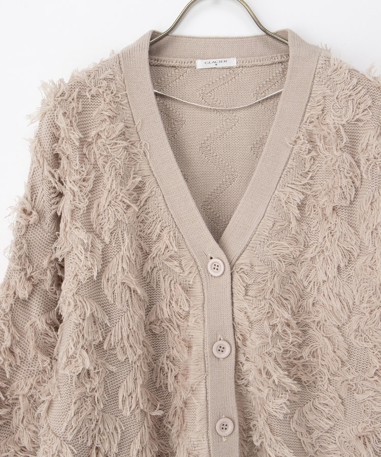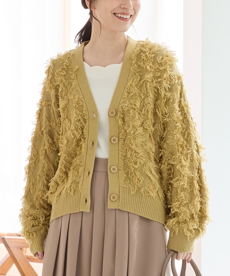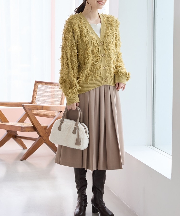 立体感のある柔らかな毛足のフリンジ編ニット素材。