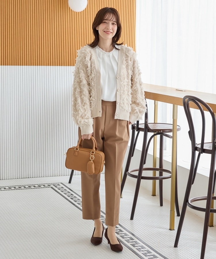 ナロースカートのなどきれいめなボトムスと合わせた、フェミニンスタイルもおすすめ。