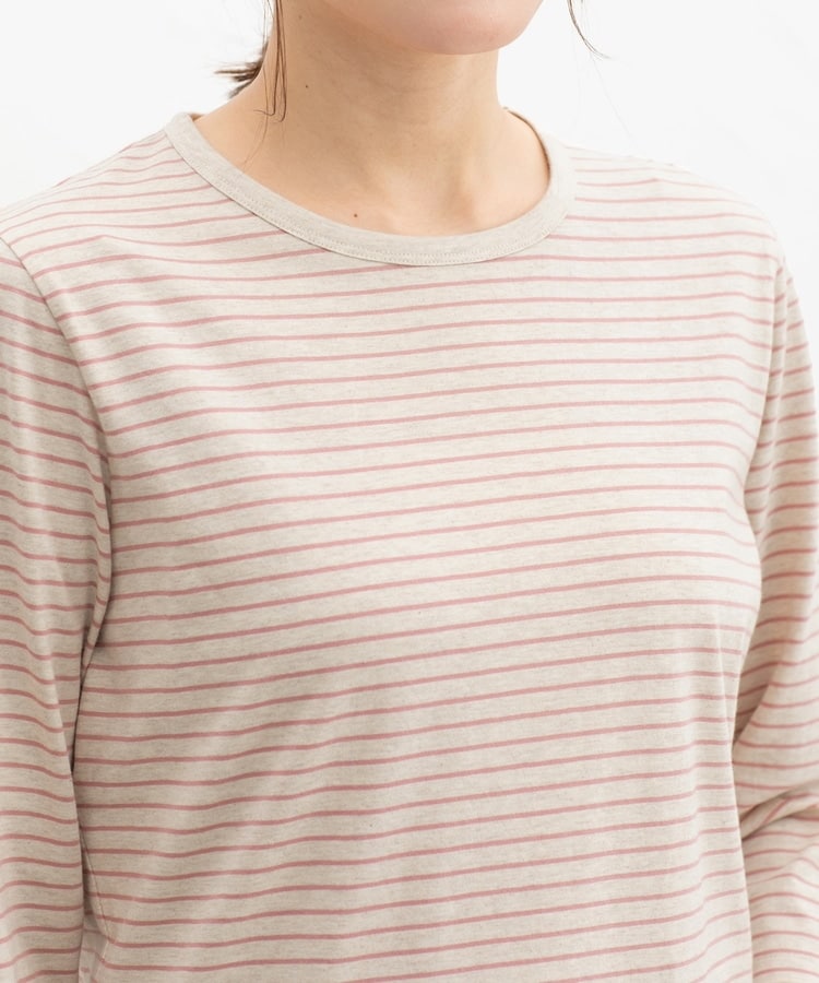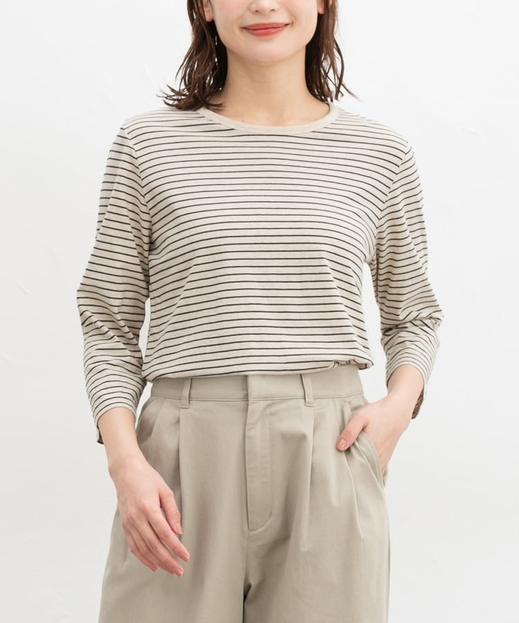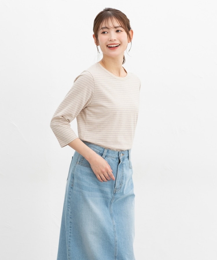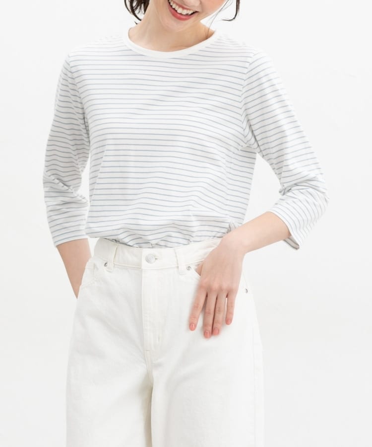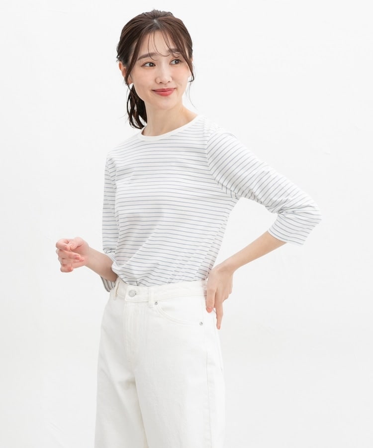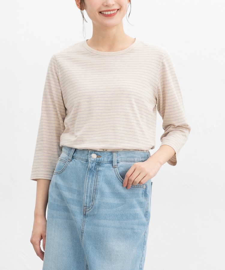 ベーシックで優しい印象の、開きすぎないクルーネックデザイン。