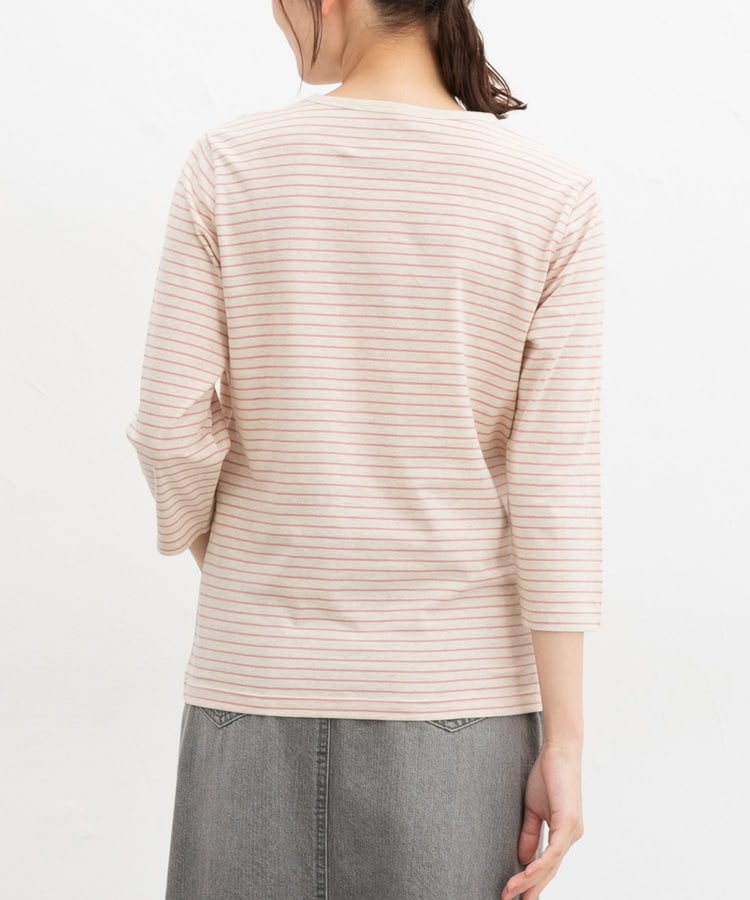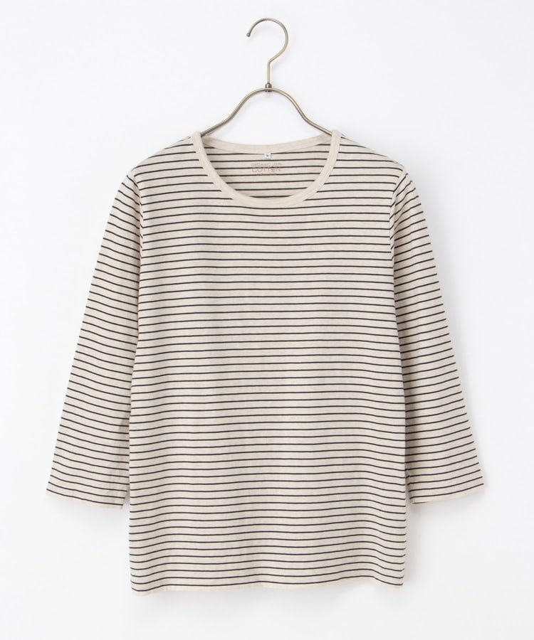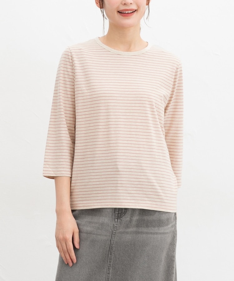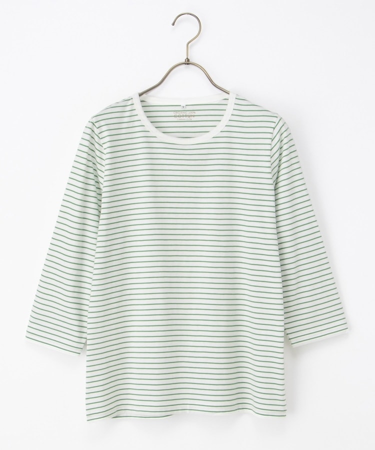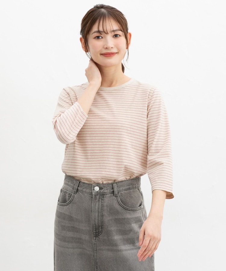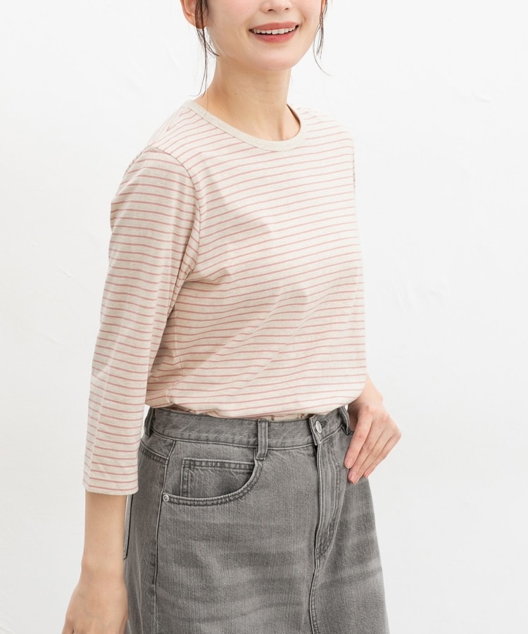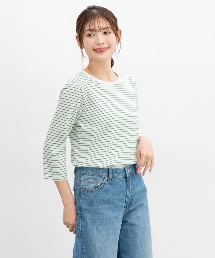 ベーシックで優しい印象の、開きすぎないクルーネックデザイン。