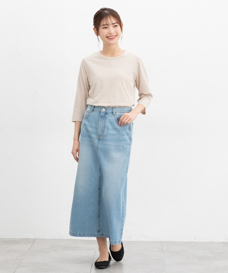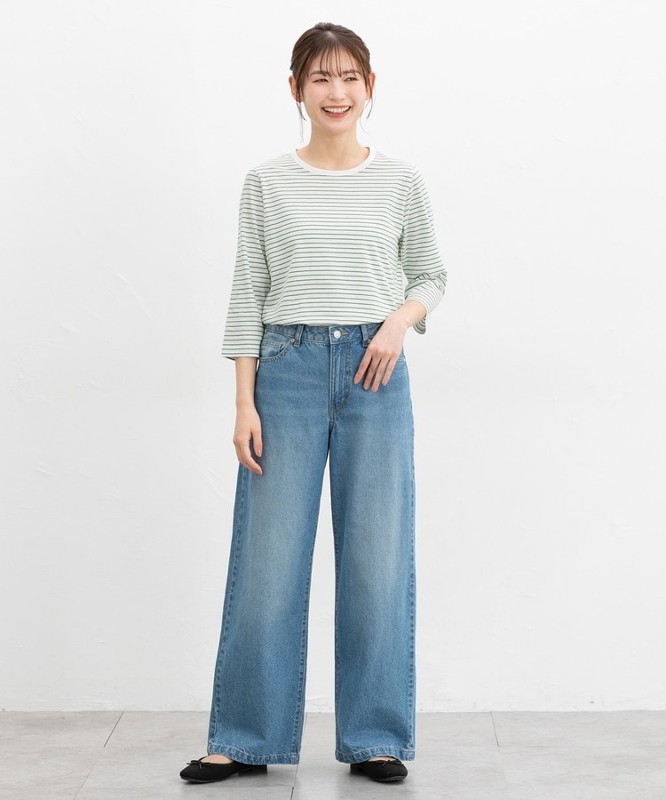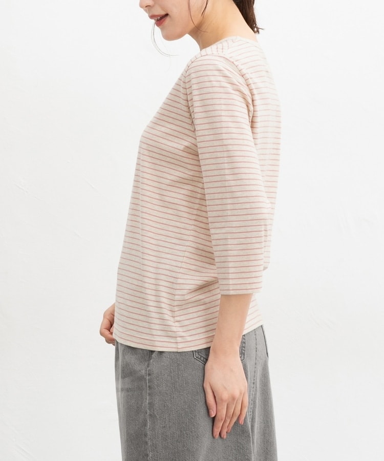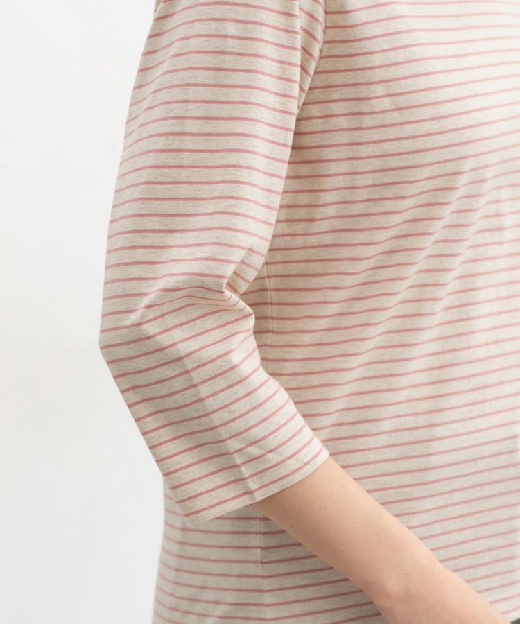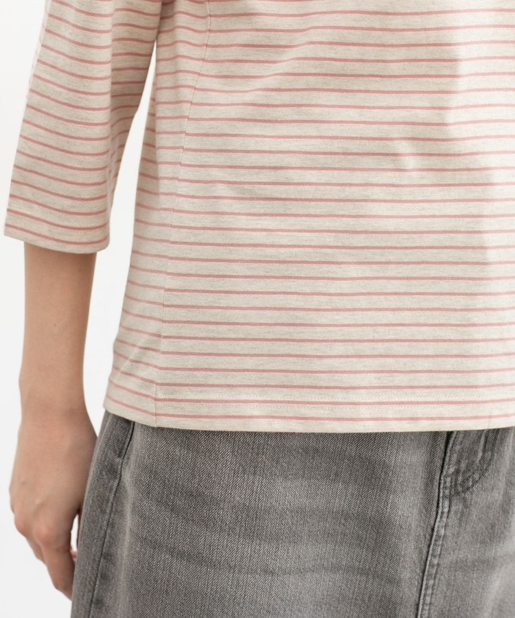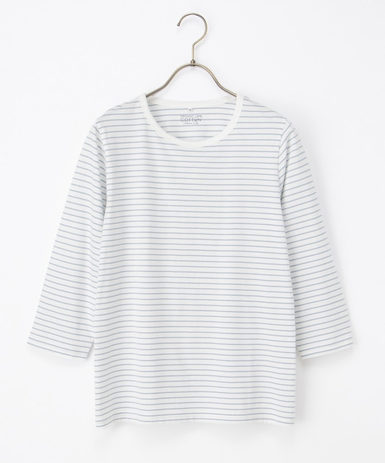 ベーシックで優しい印象の、開きすぎないクルーネックデザイン。