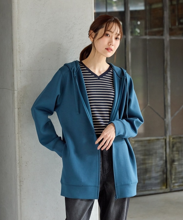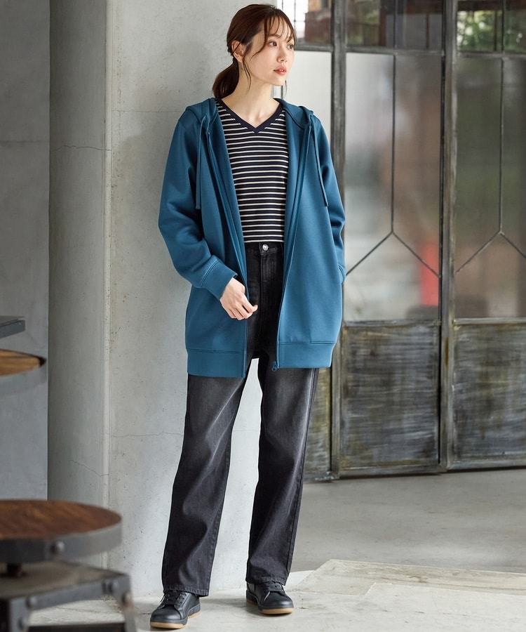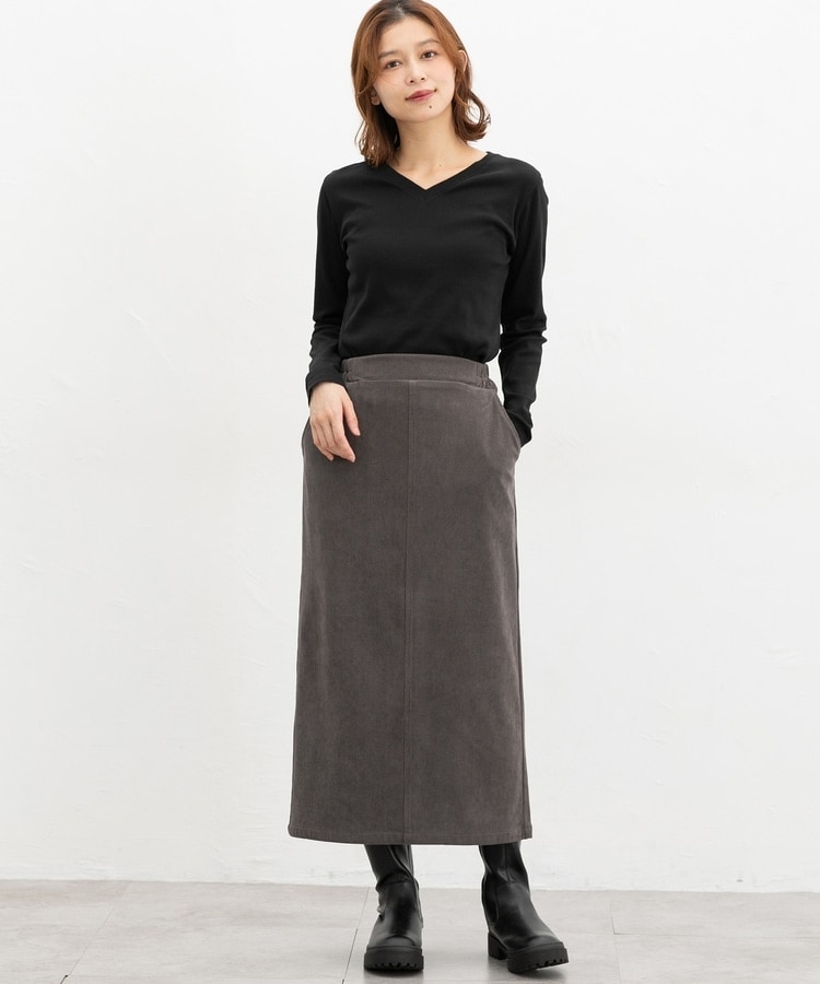 腰回りが隠れる丈感の、体にフィットするすっきりシルエットながら、動きに合わせて伸縮するフライス編みで快適な着心地。