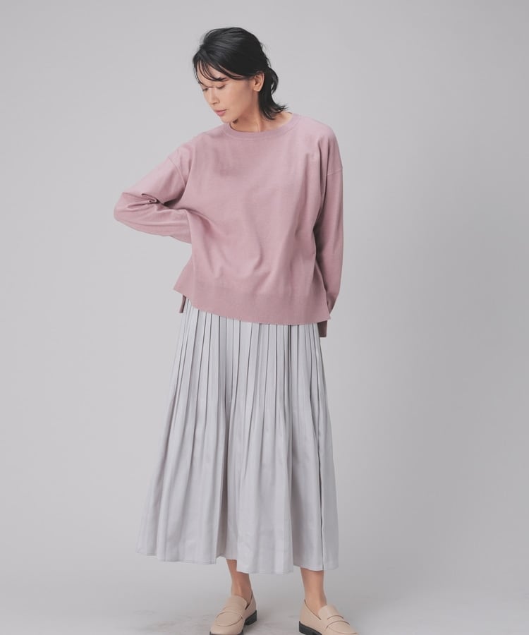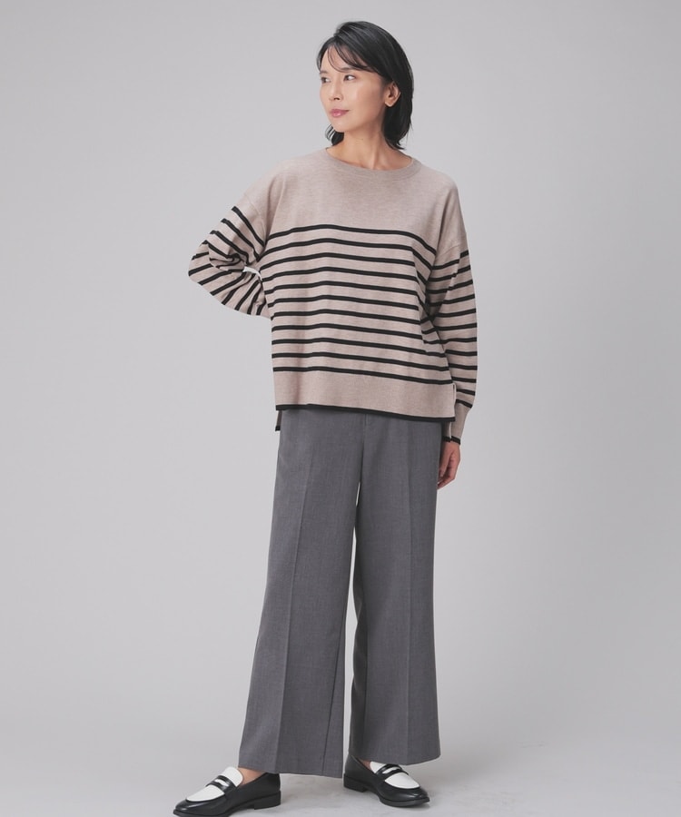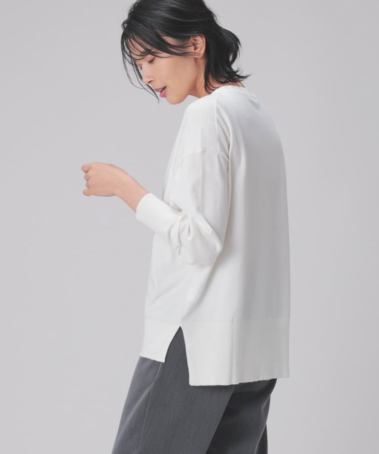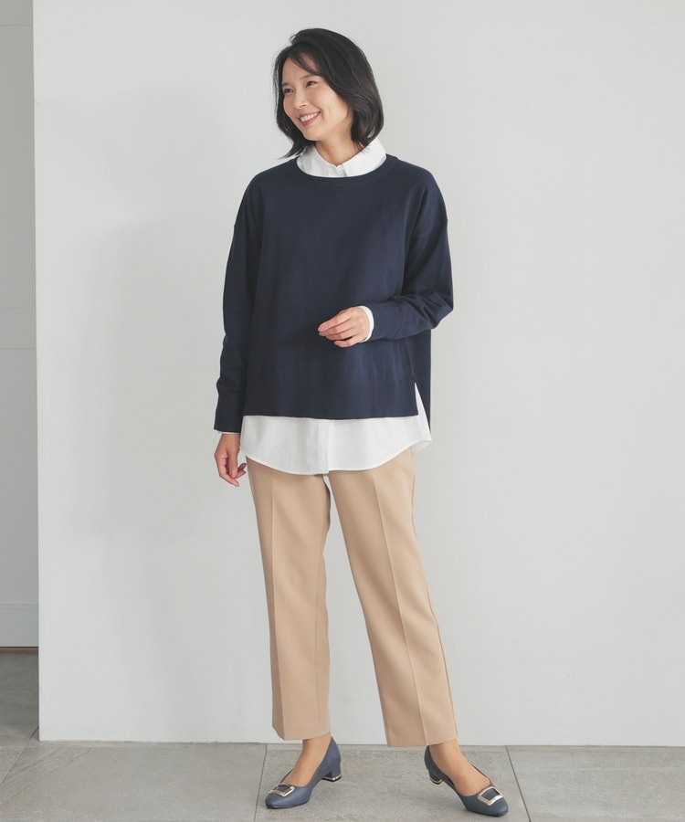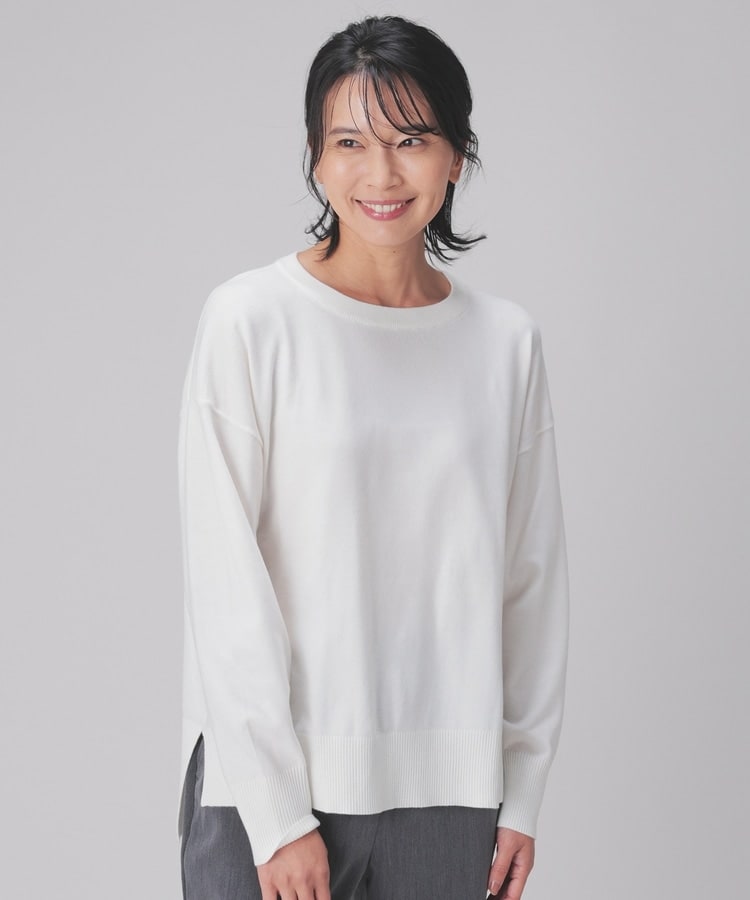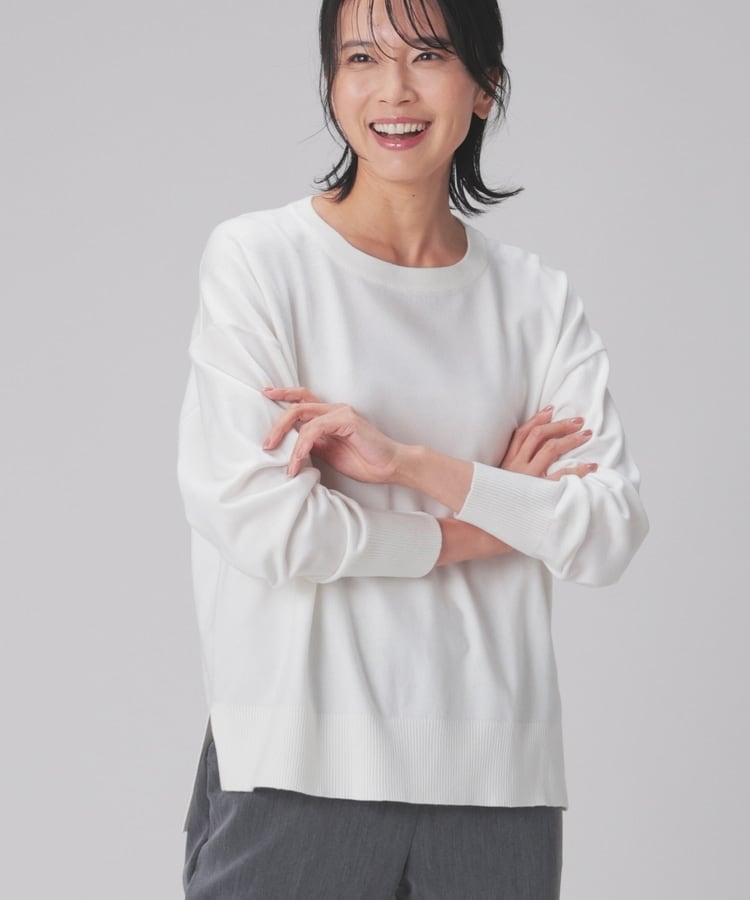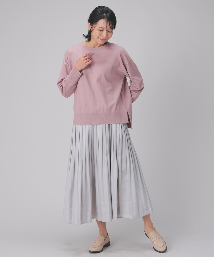 ゆったり幅と腰回りが隠れる丈感で体型をカバーしつつ、落ち感のある編地ですっきり見えも◎