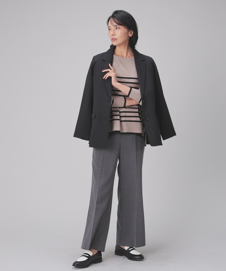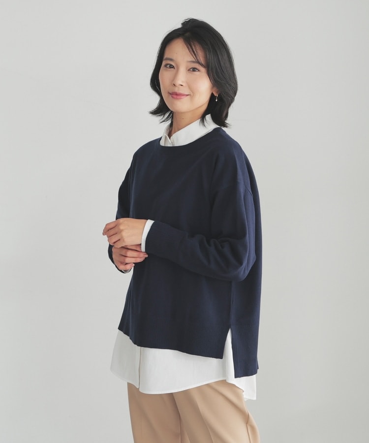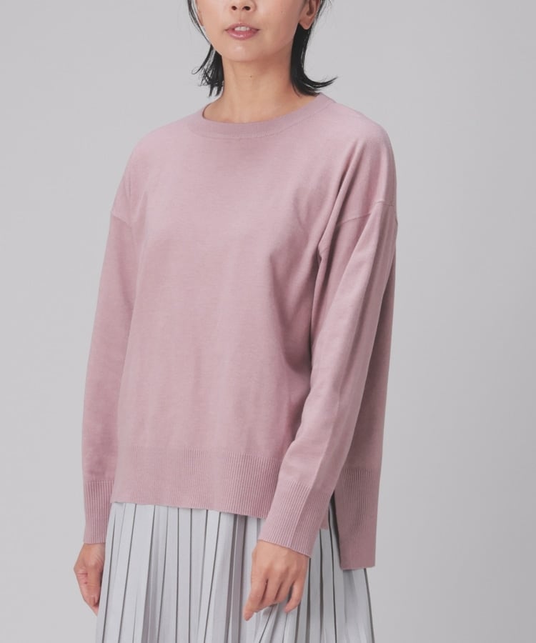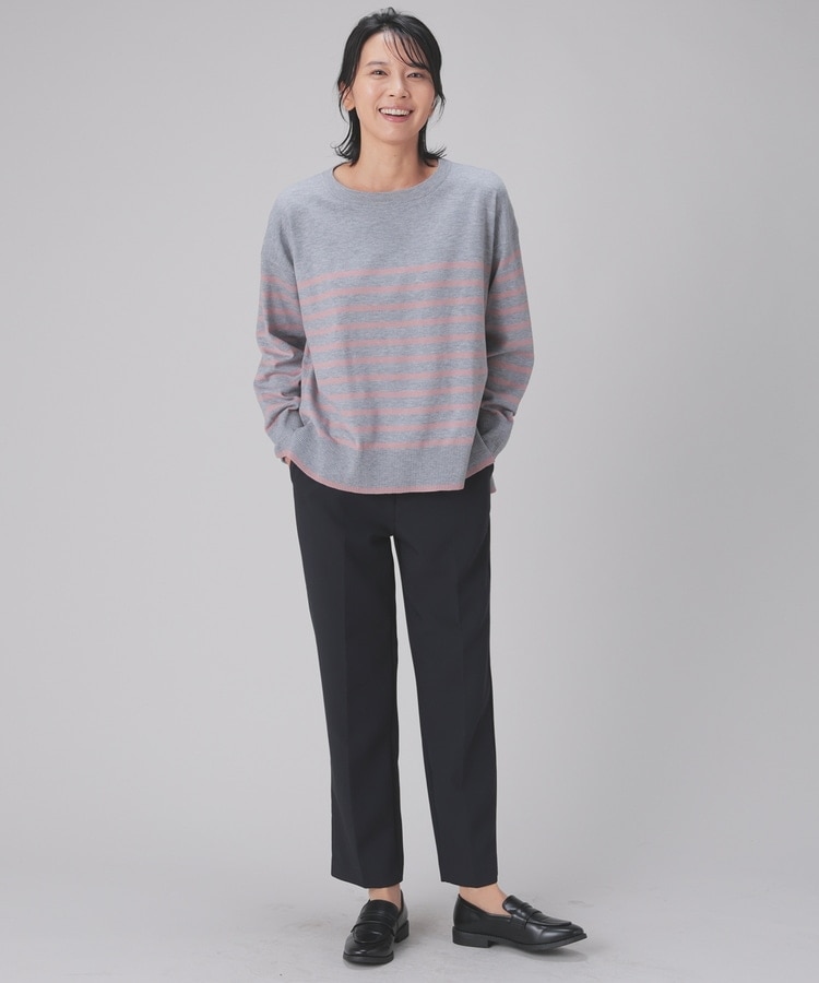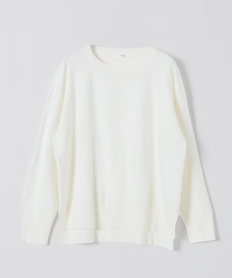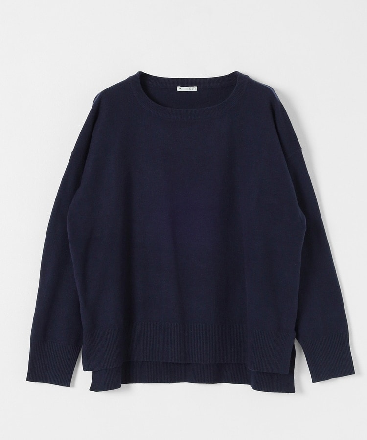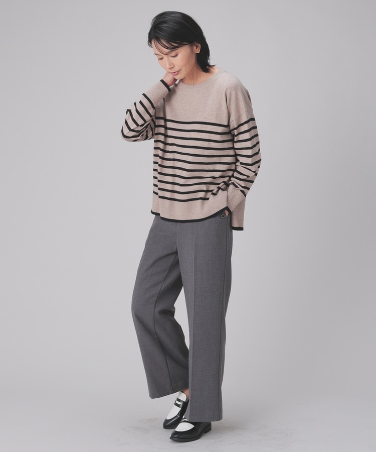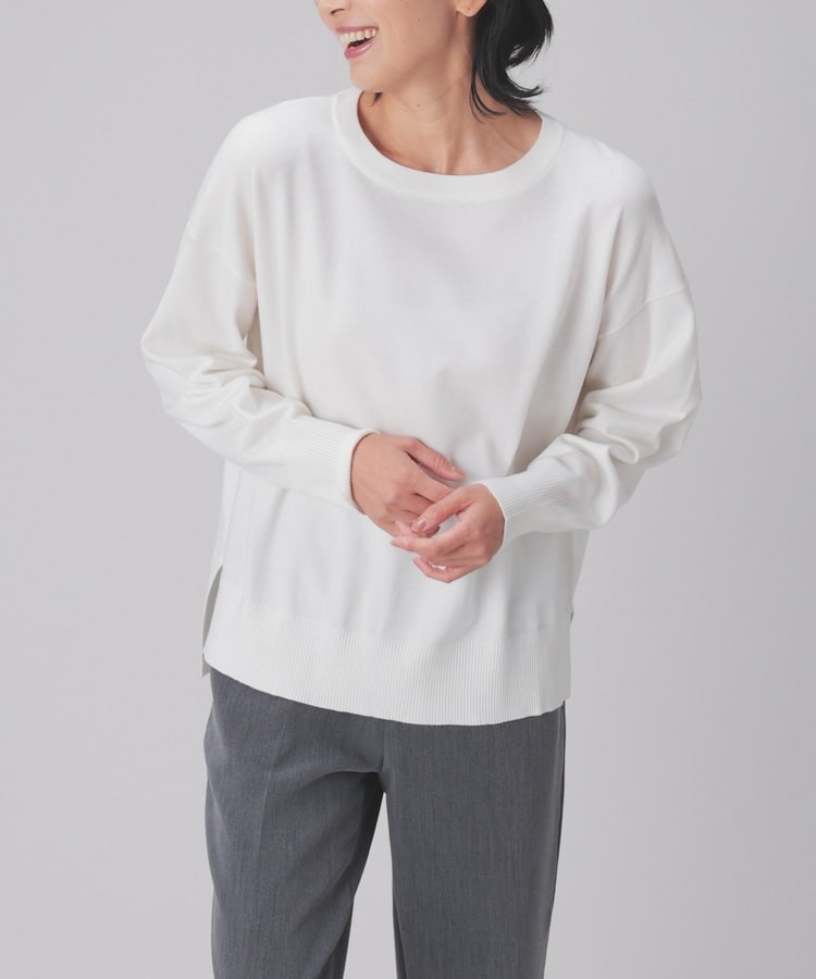 ゆったり幅と腰回りが隠れる丈感で体型をカバーしつつ、落ち感のある編地ですっきり見えも◎