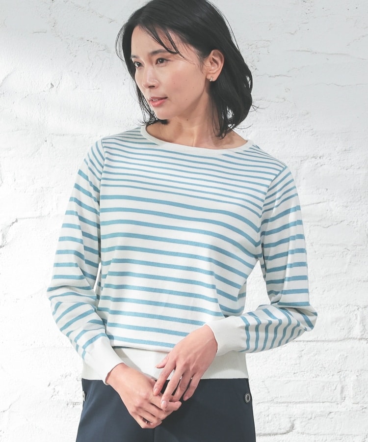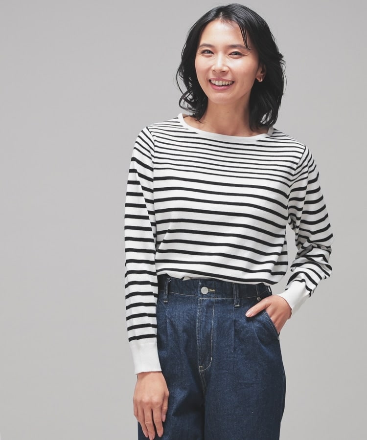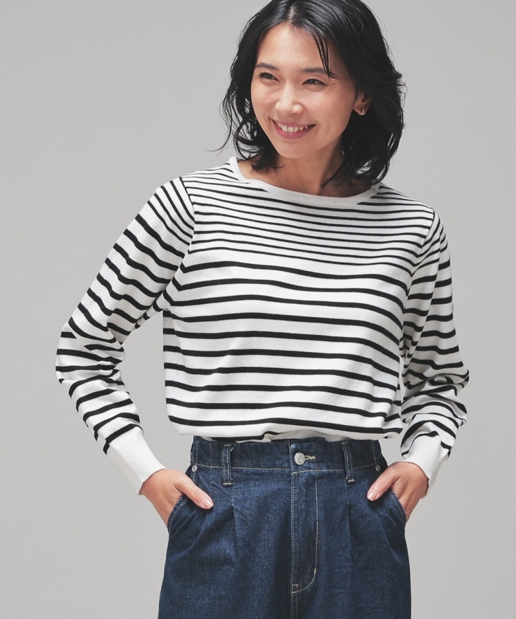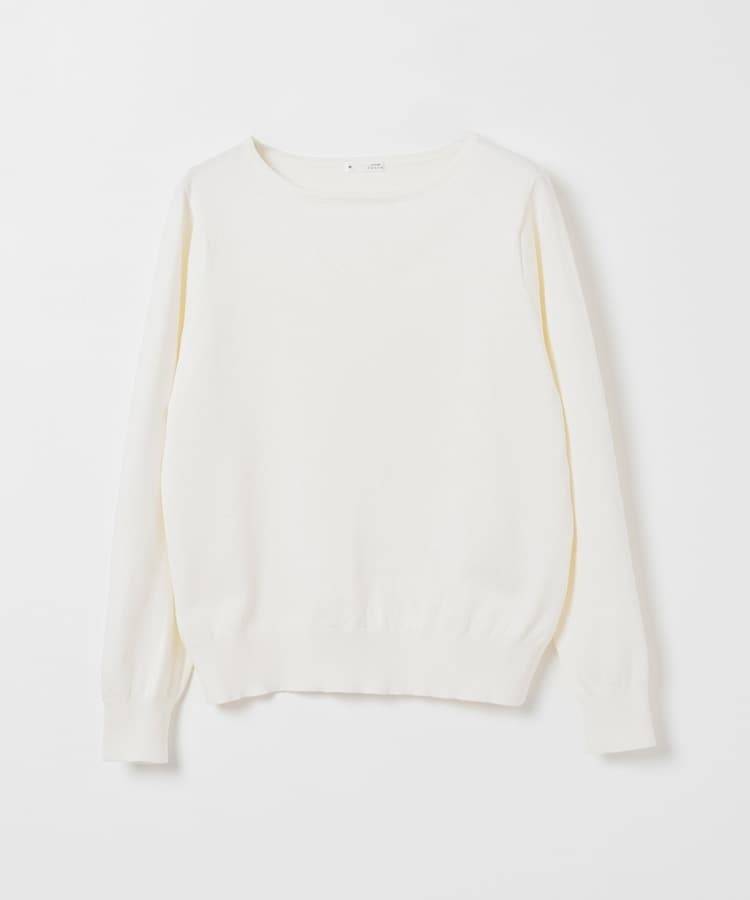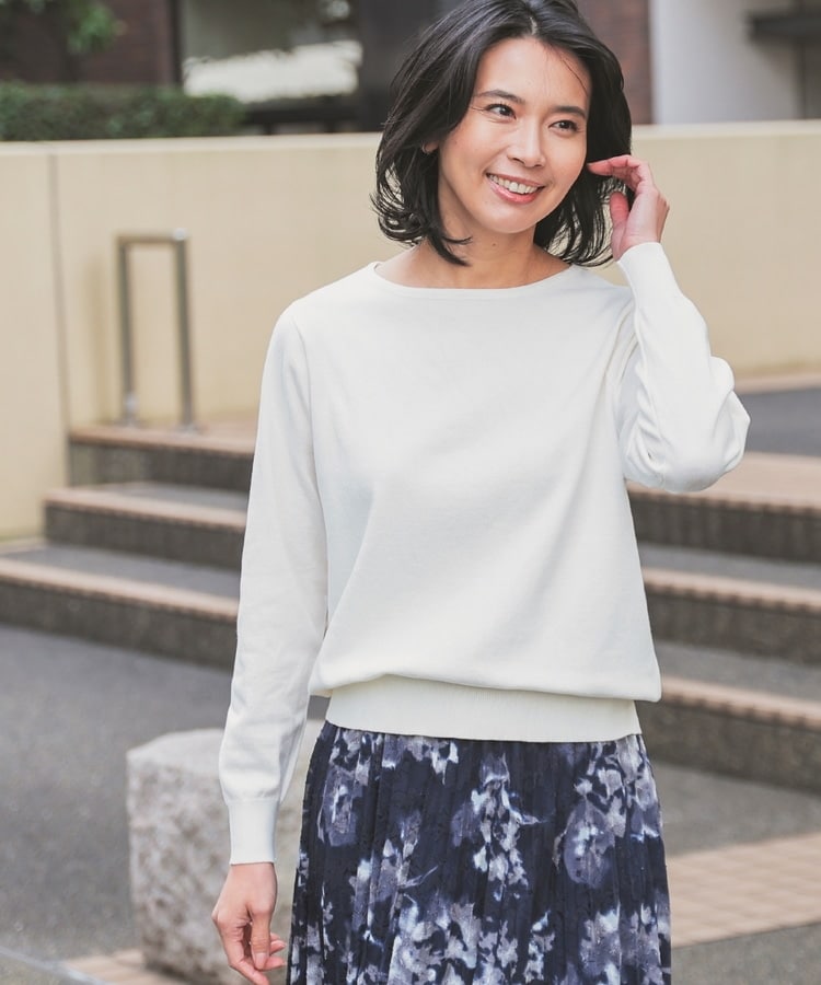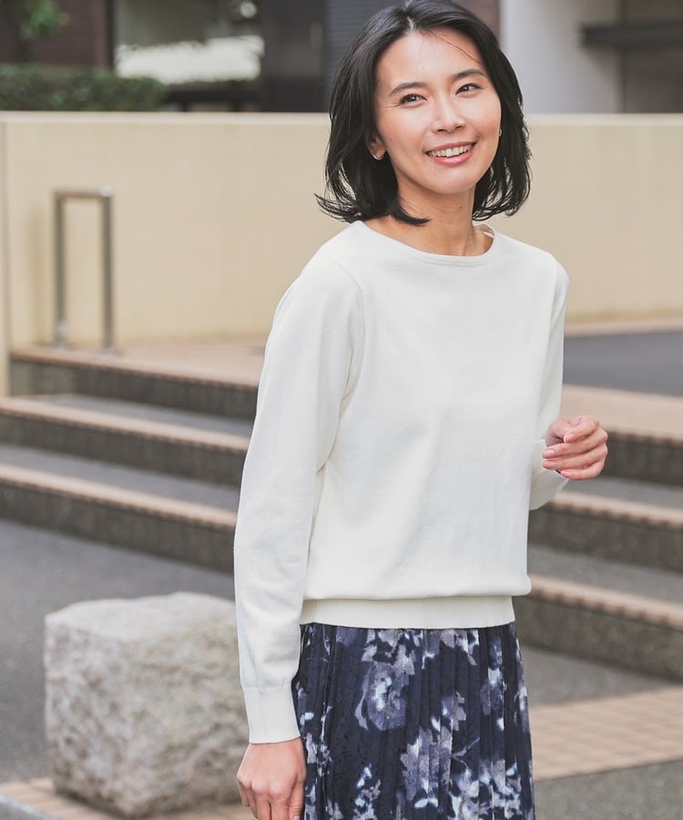 顔まわりをスッキリ見せるボートネックのシンプルデザイン。