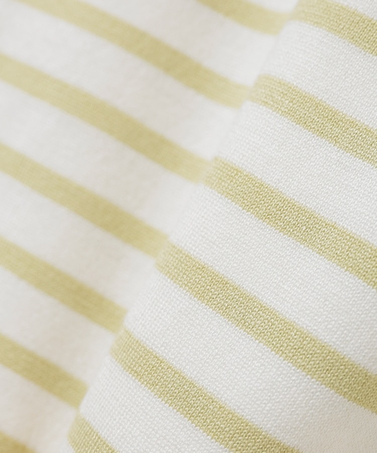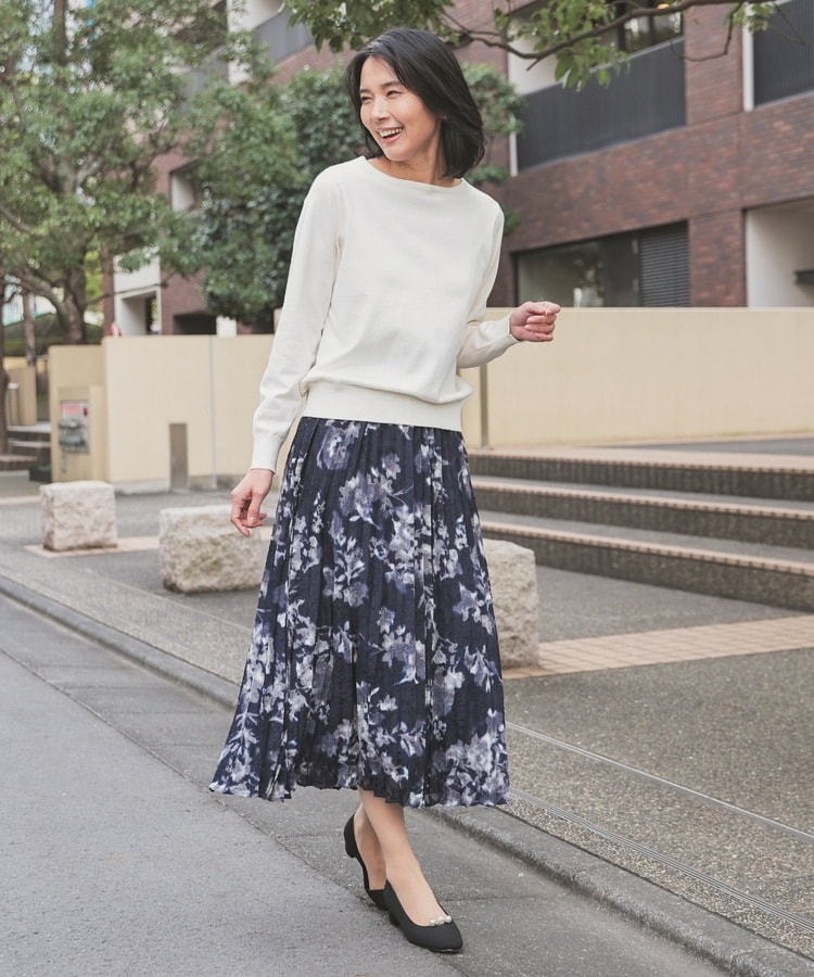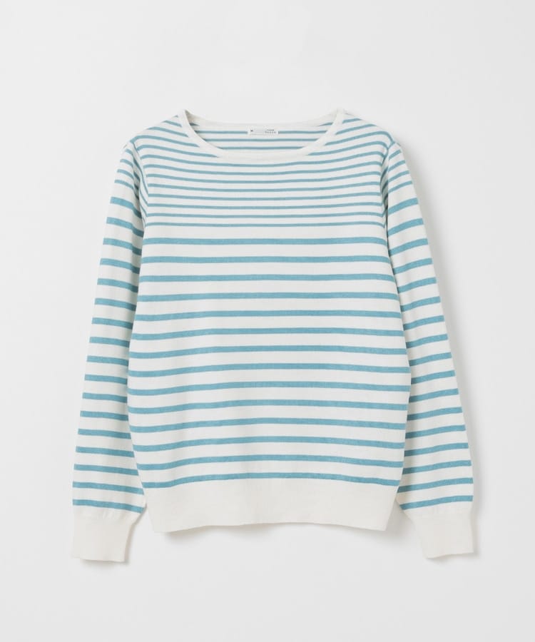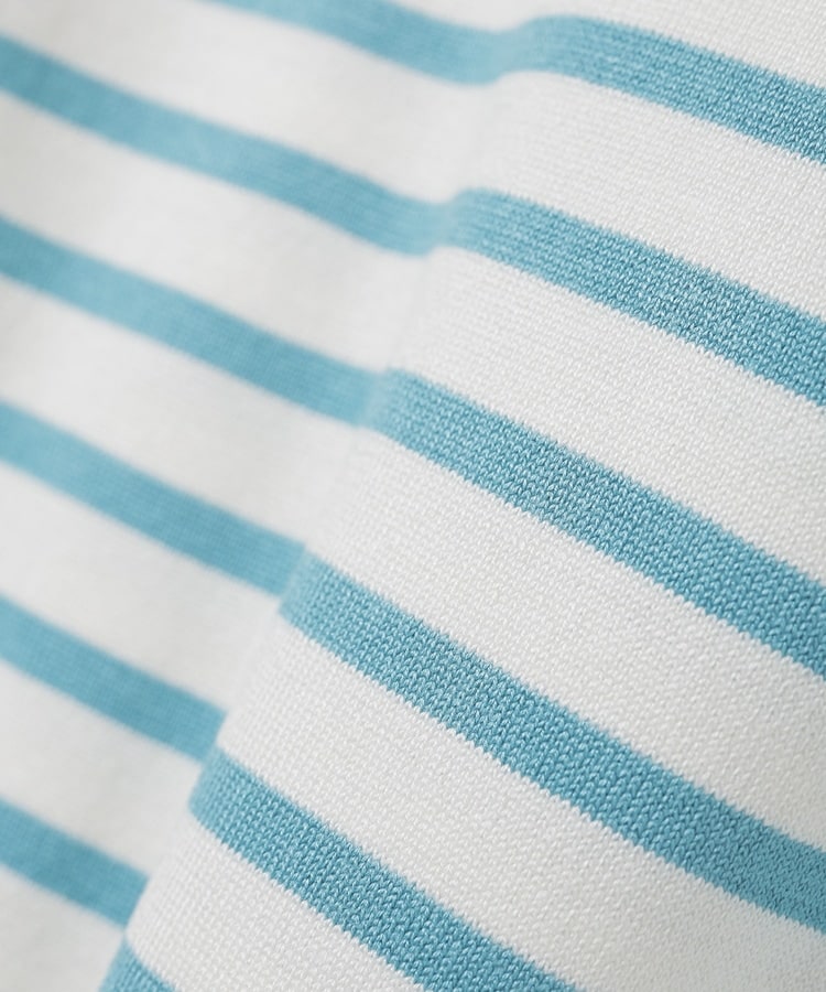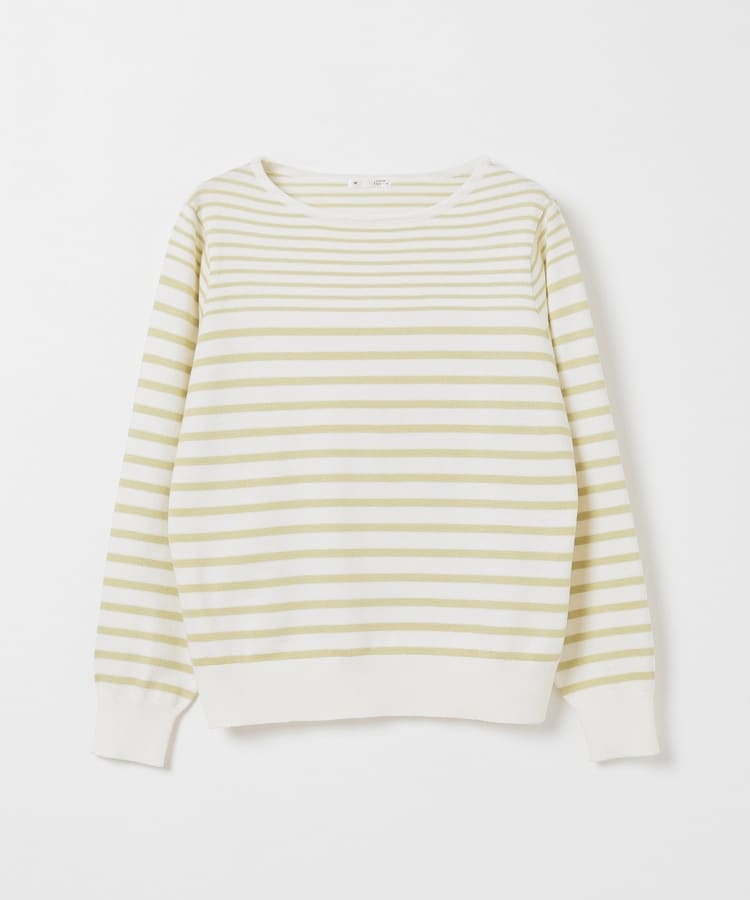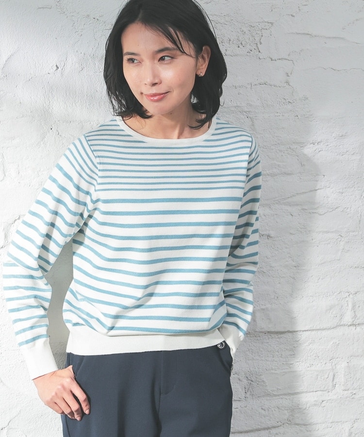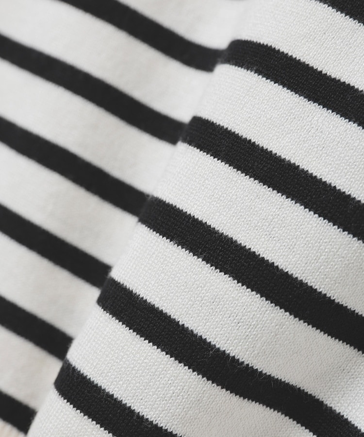 顔まわりをスッキリ見せるボートネックのシンプルデザイン。