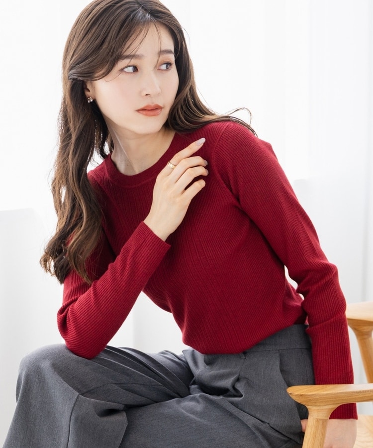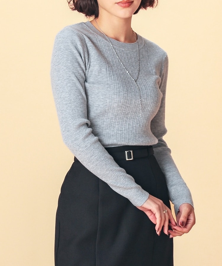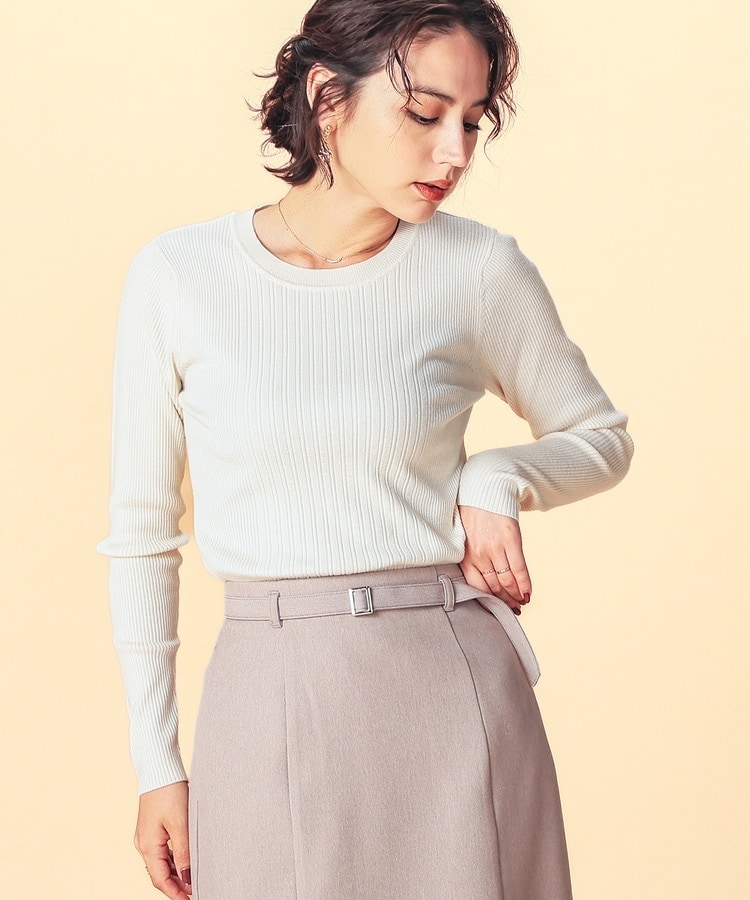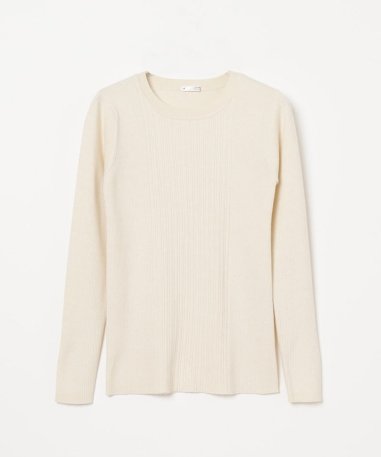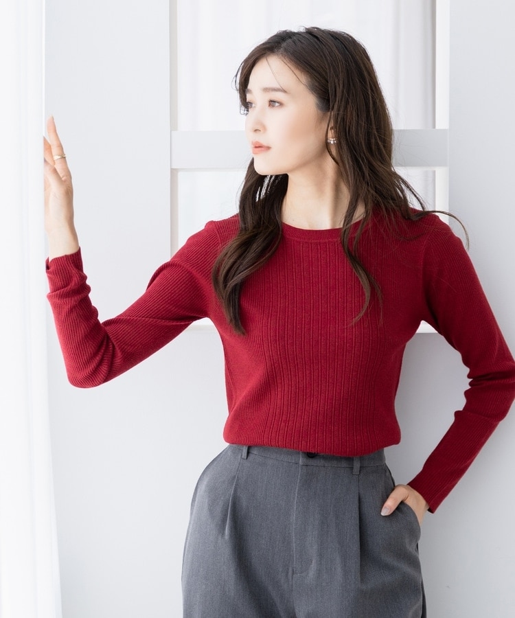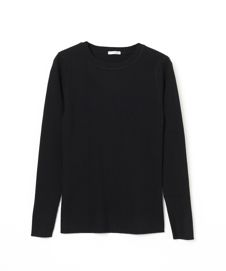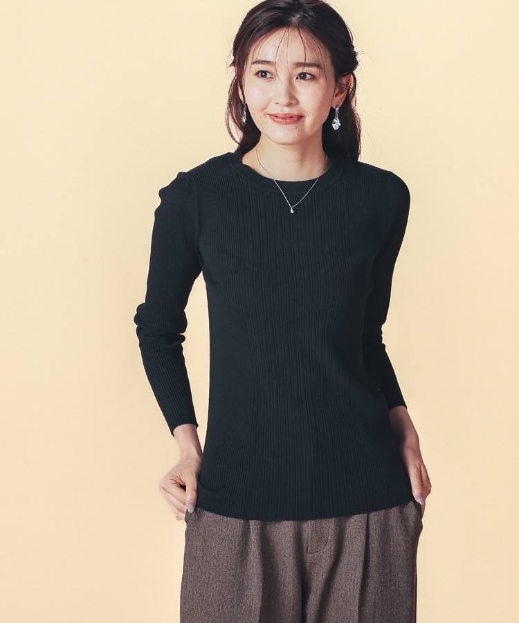 シンプルなシルエットに、リブの間隔を変化させた変則編みでアクセントをプラスした、細見え効果もあるデザイン。