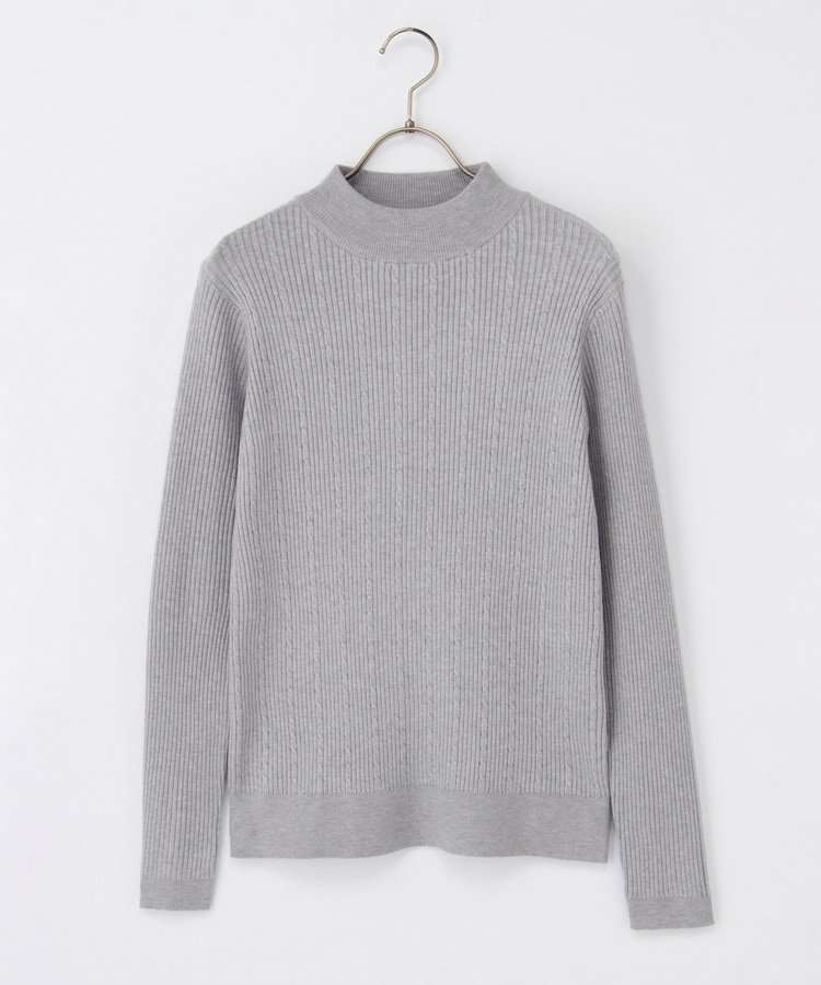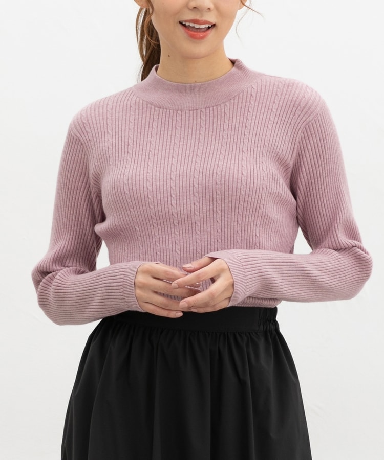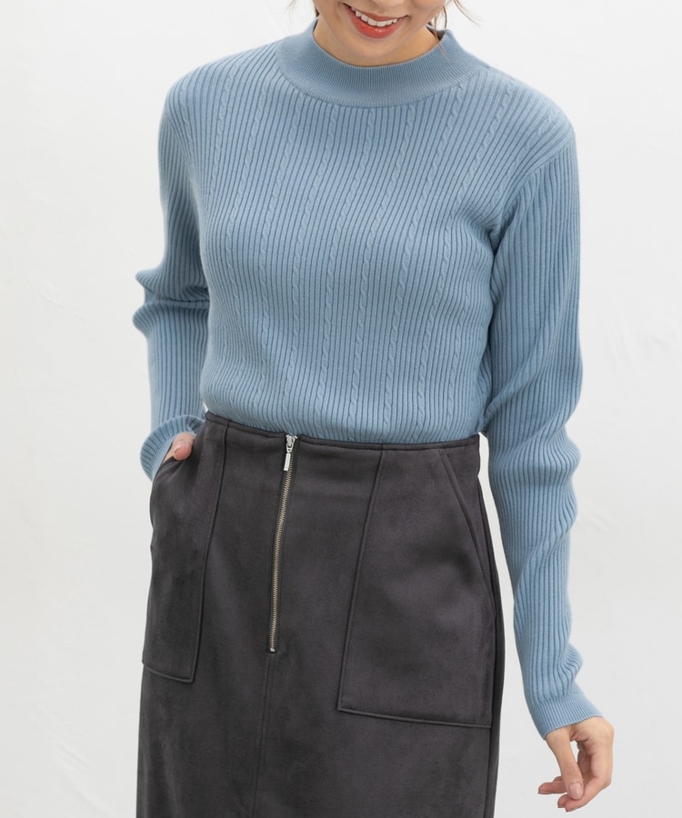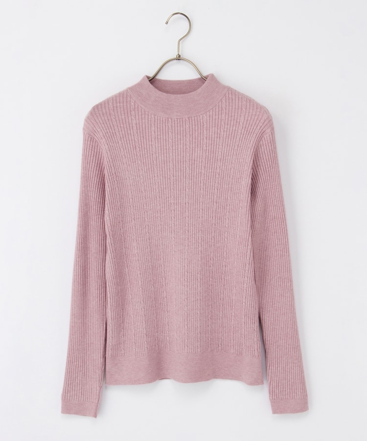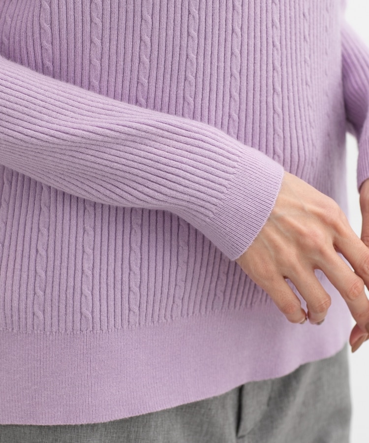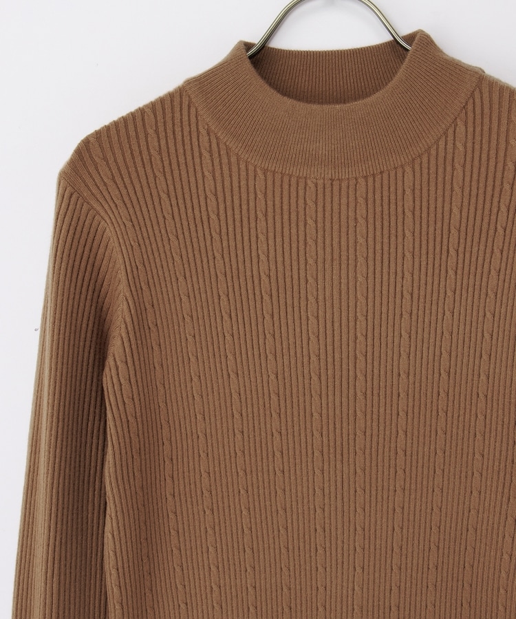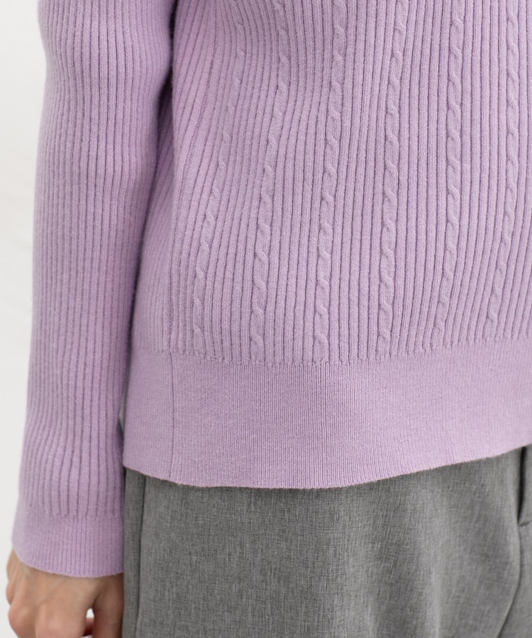 首元までカバーしてあったかなハイネックで、縦目のリブ+細ケーブルの編み柄がお洒落なデザイン。