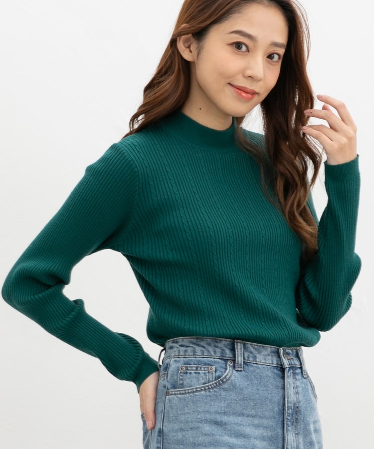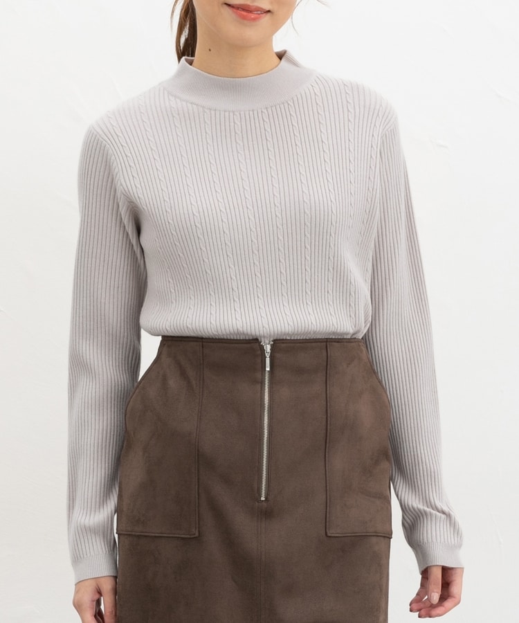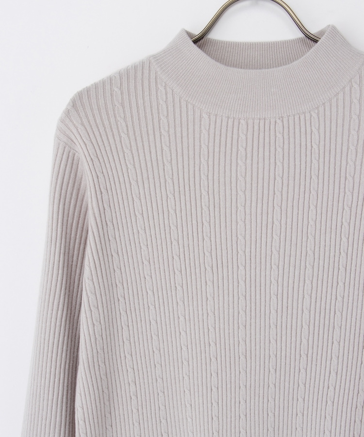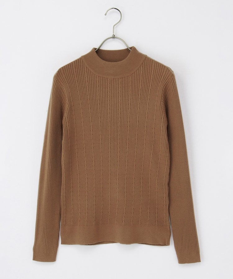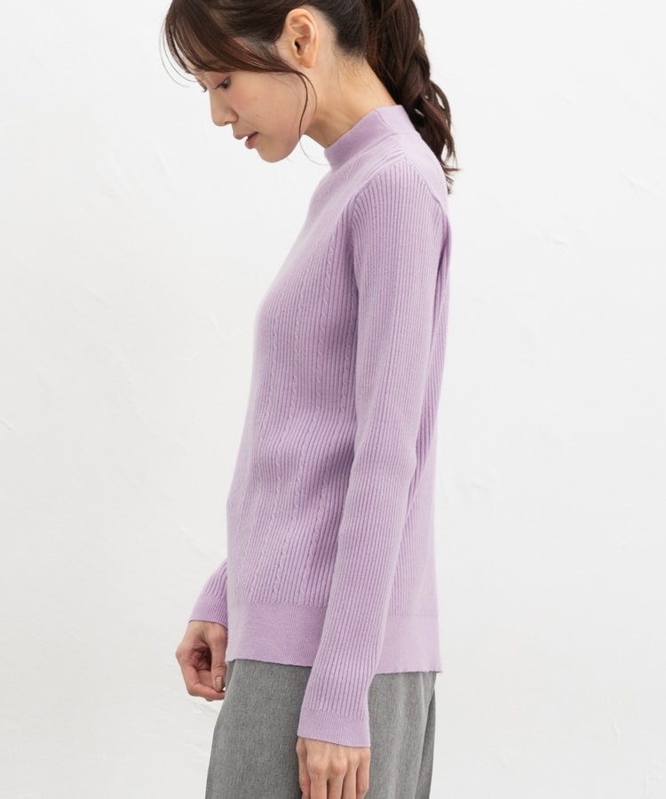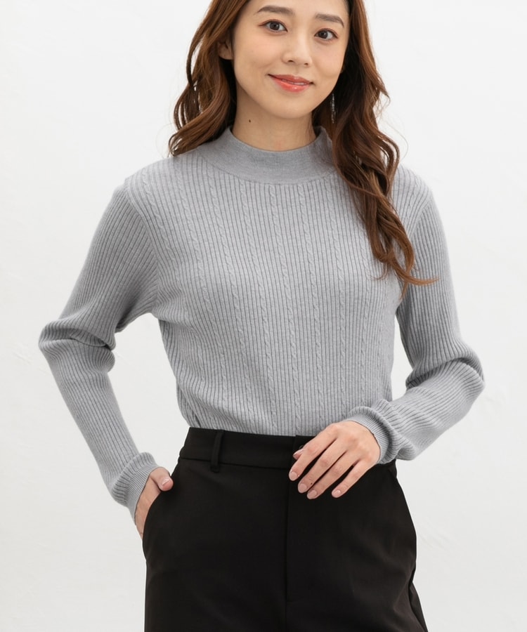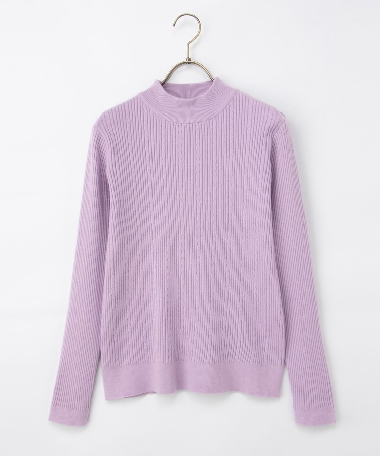 首元までカバーしてあったかなハイネックで、縦目のリブ+細ケーブルの編み柄がお洒落なデザイン。