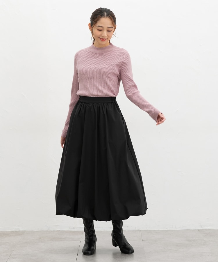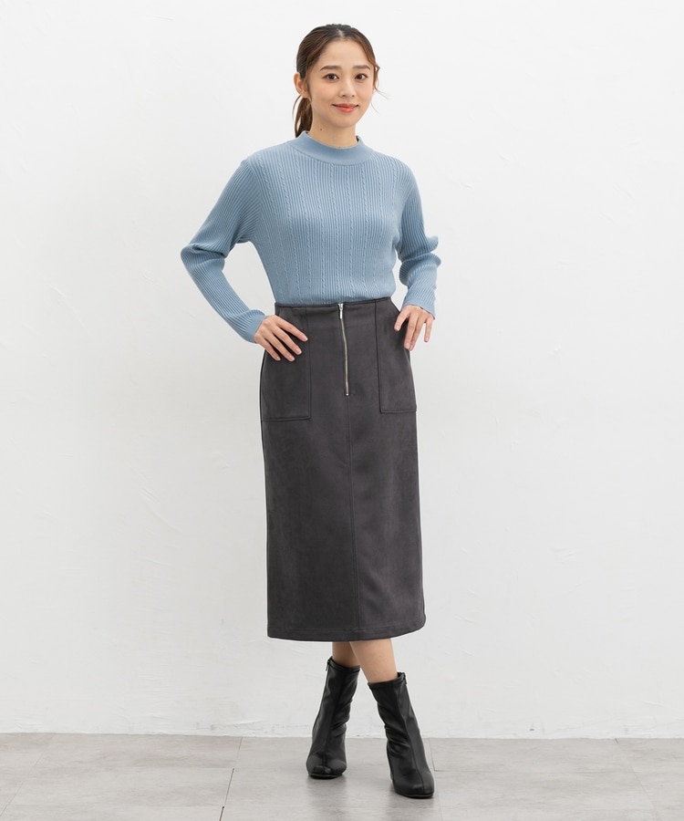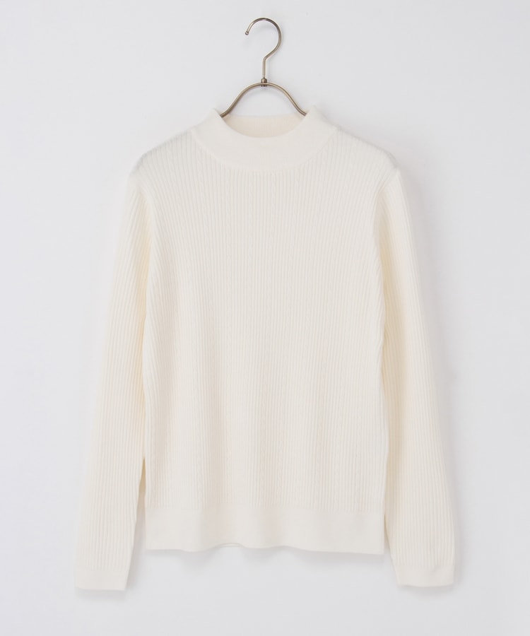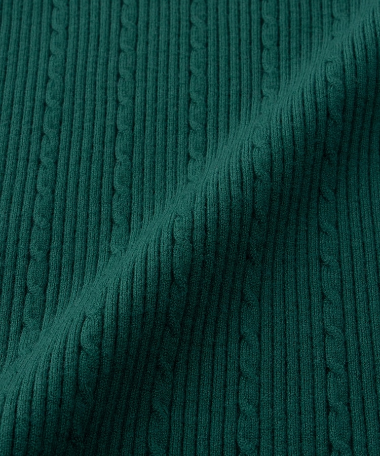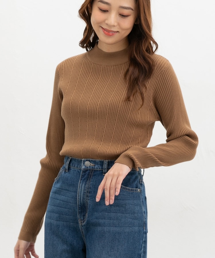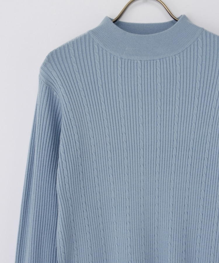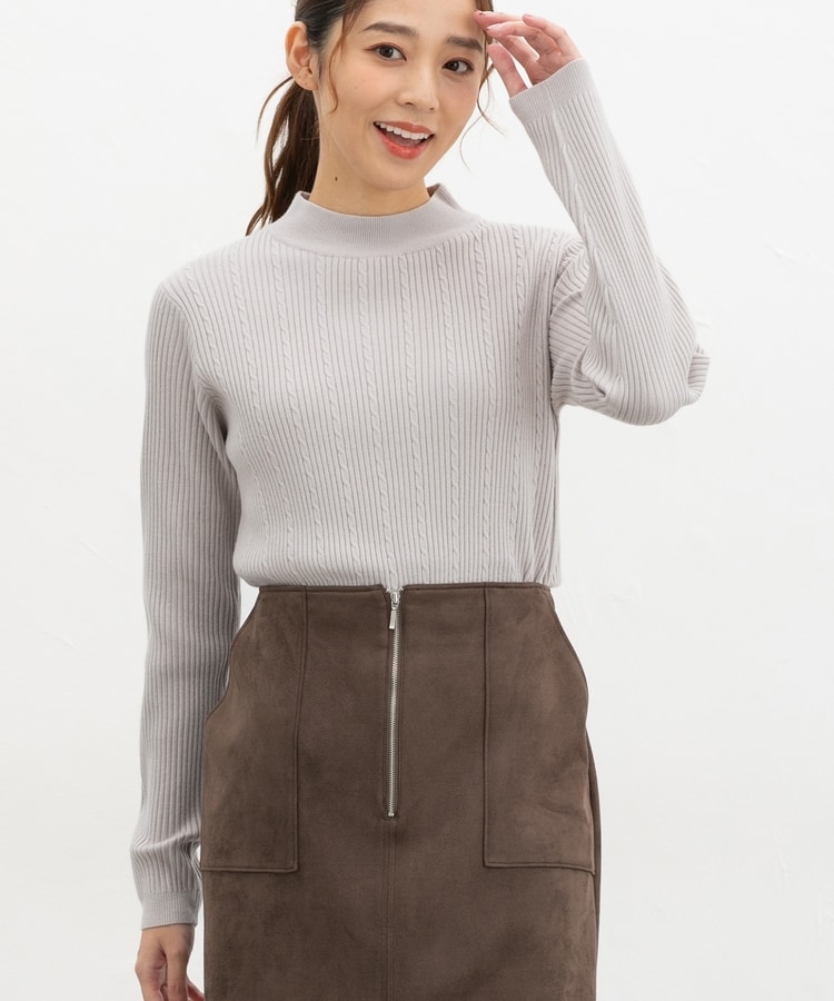 首元までカバーしてあったかなハイネックで、縦目のリブ+細ケーブルの編み柄がお洒落なデザイン。