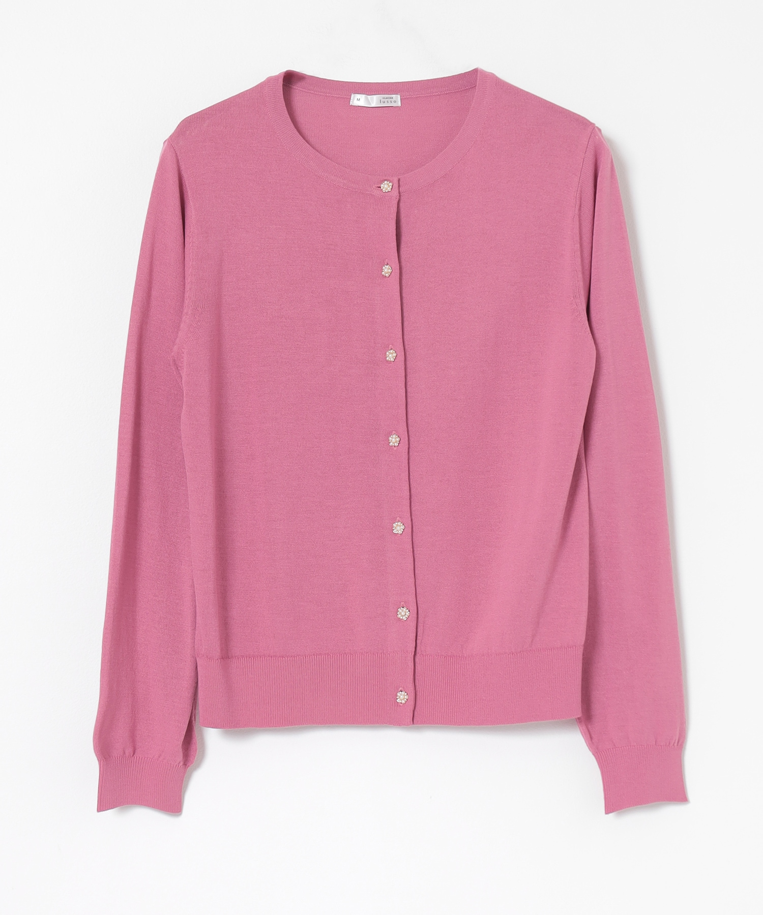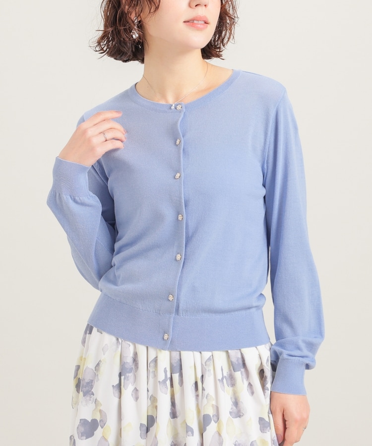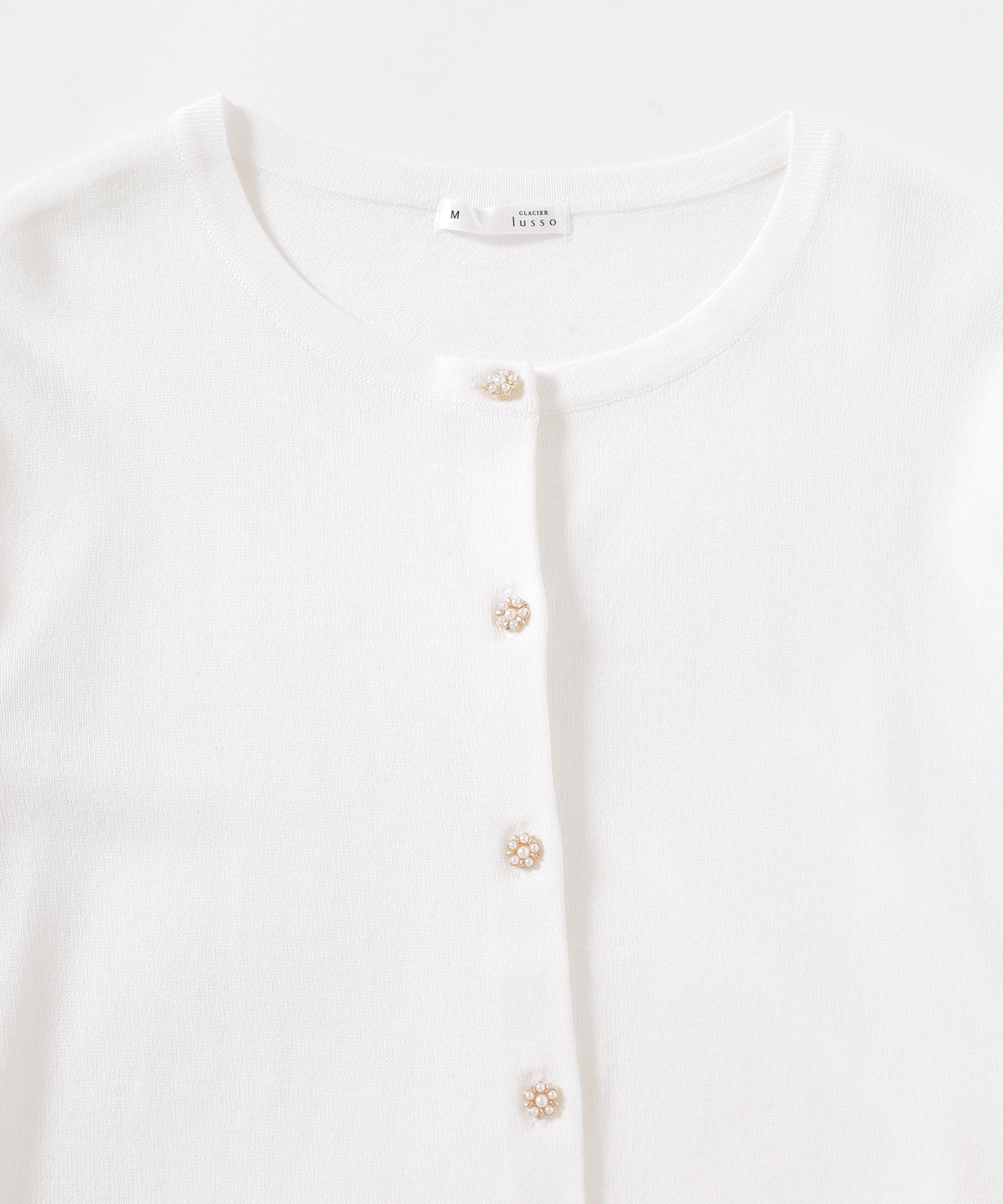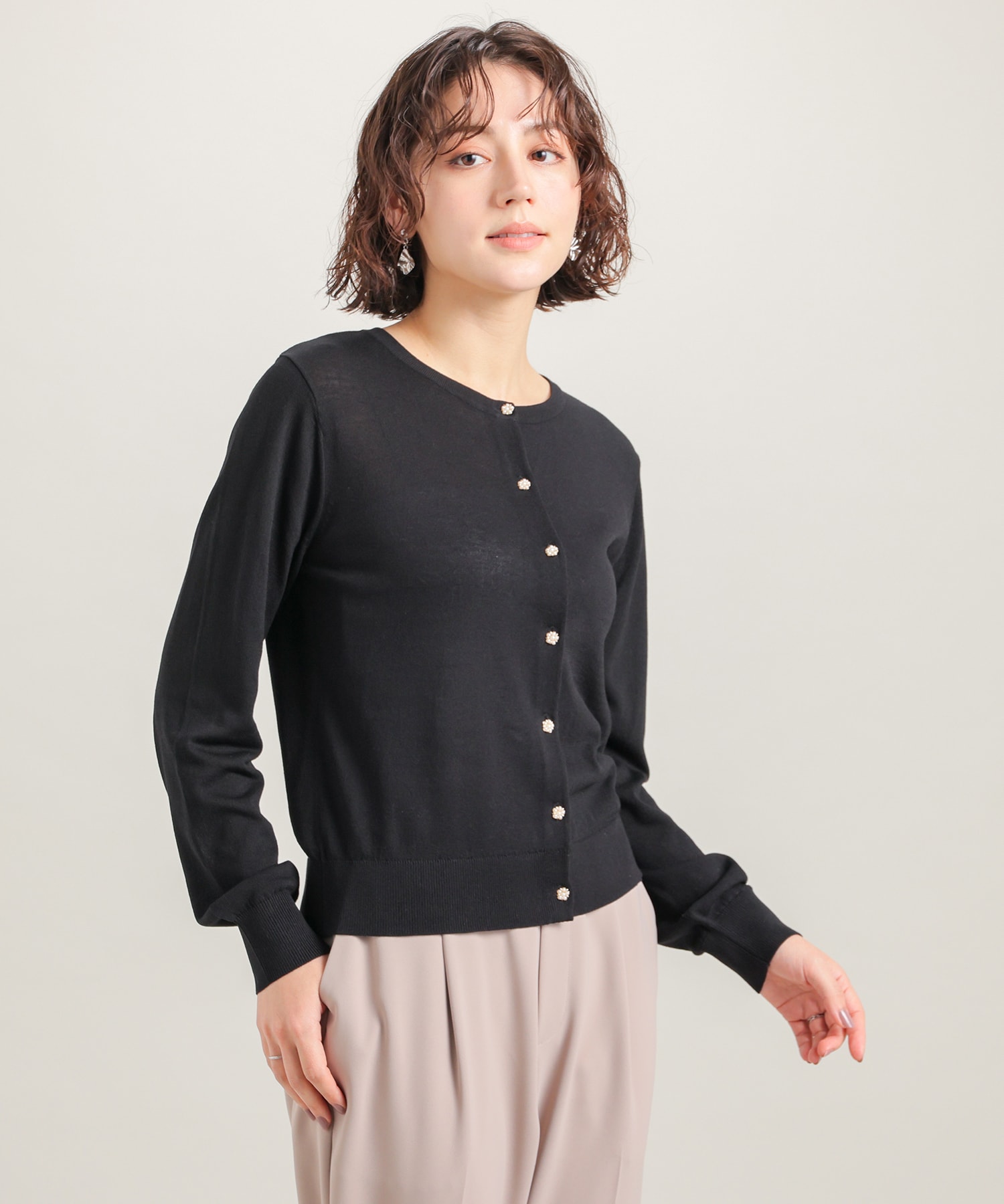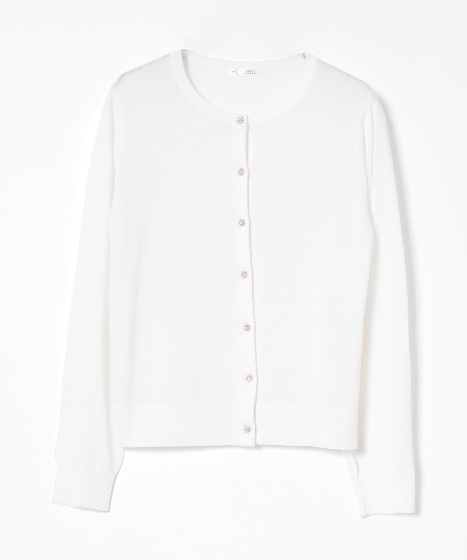 クルーネックのシンプルデザインに、ビジューボタンで華やかさをプラス。