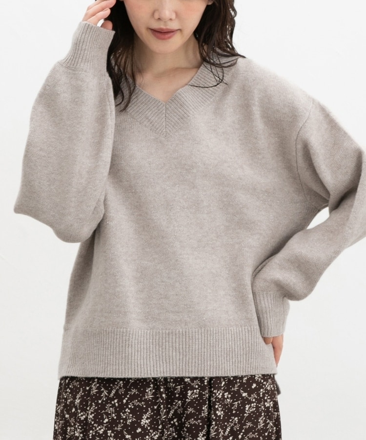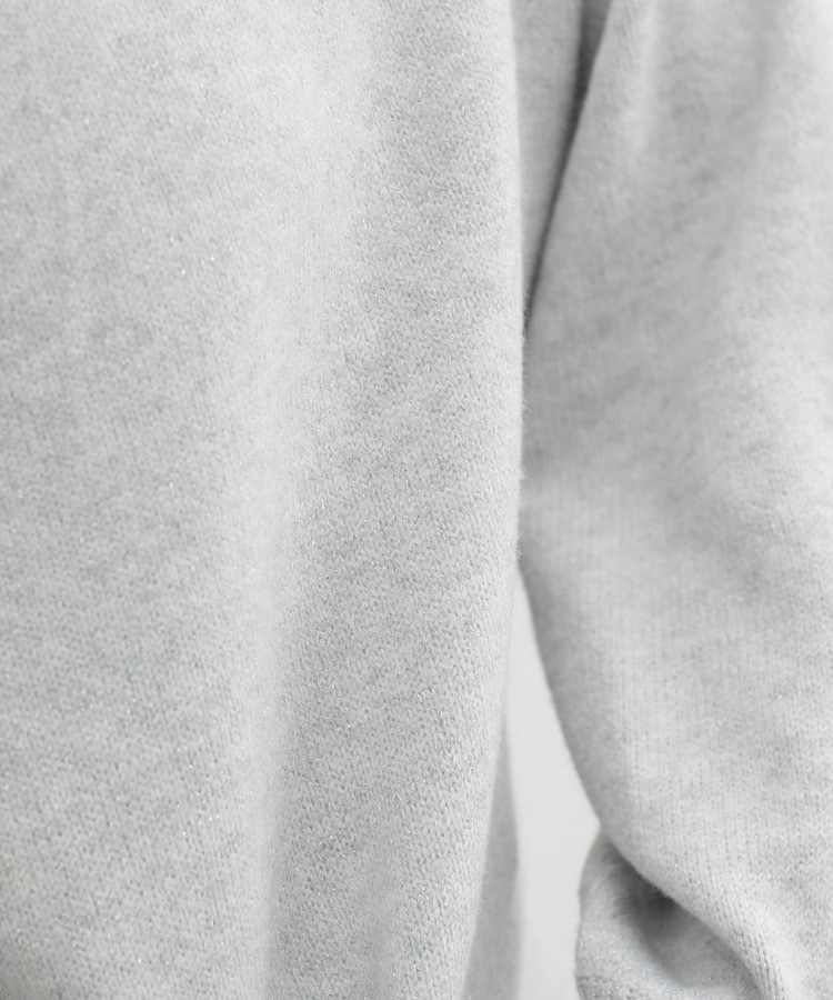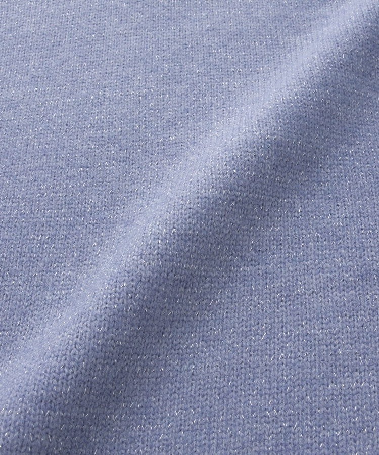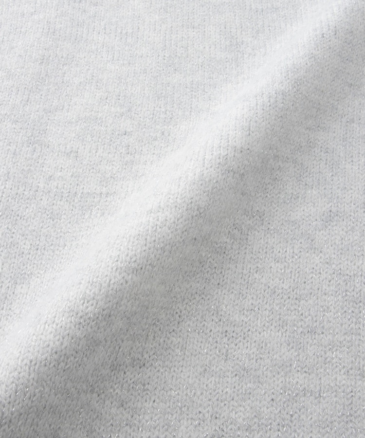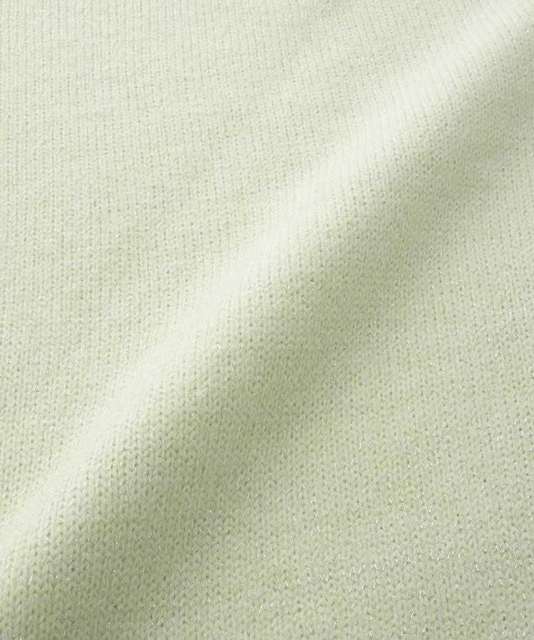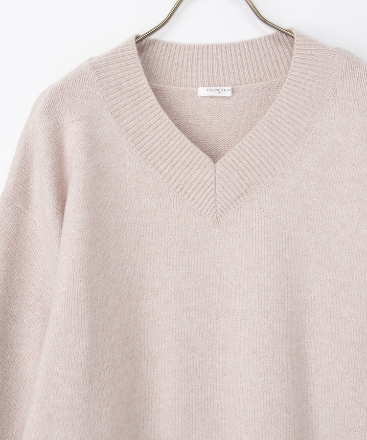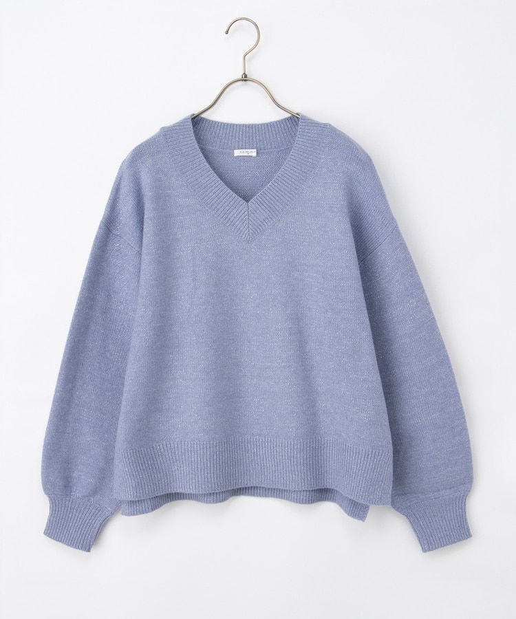 顔周りをすっきり見せるVネックのシンプルデザインに、程よい光沢感のラメで華やかさをプラス。