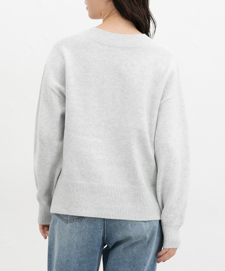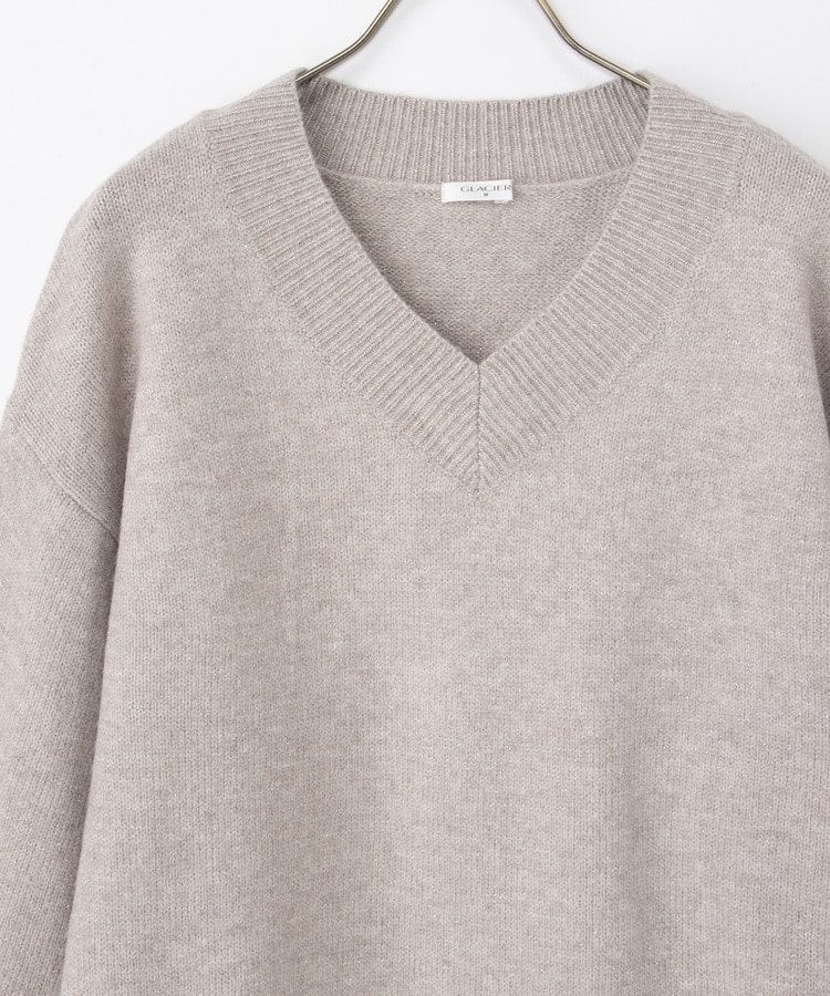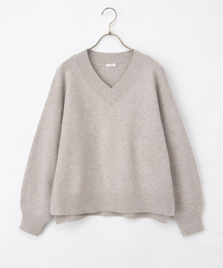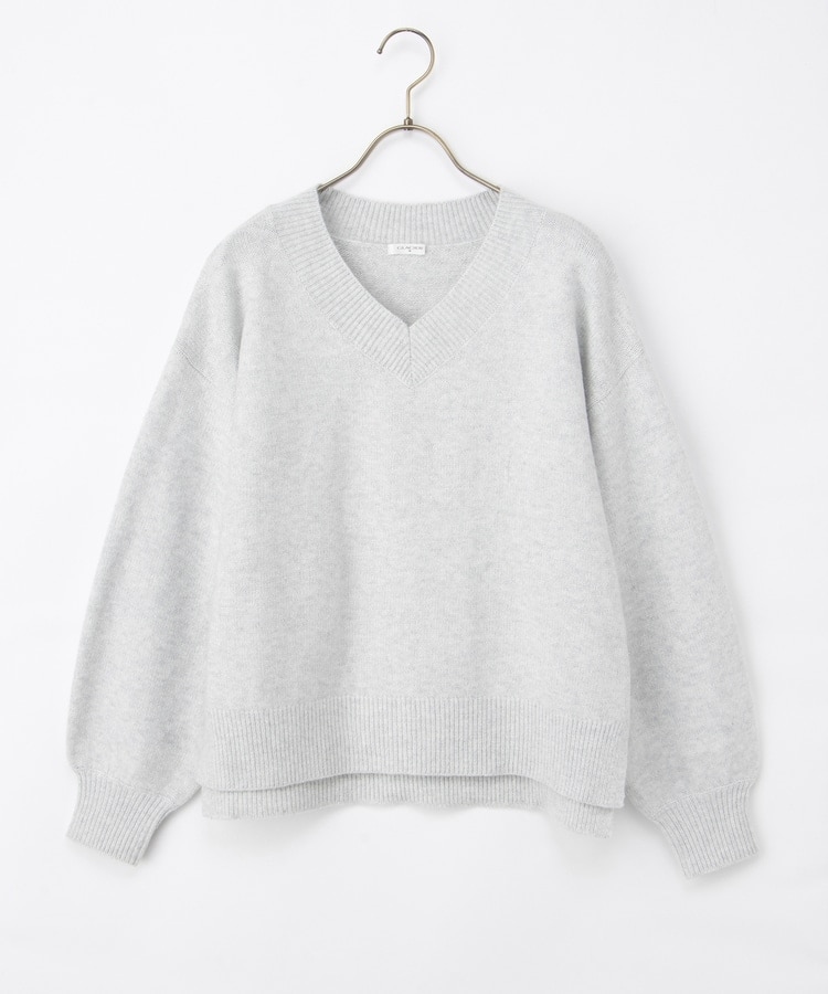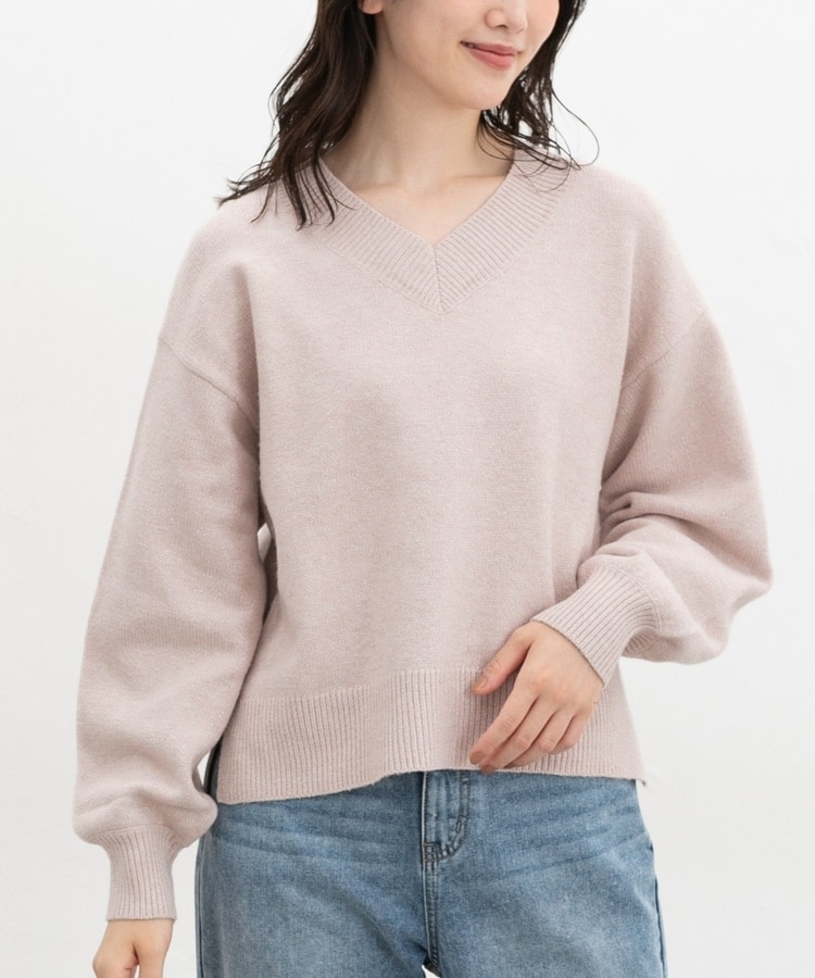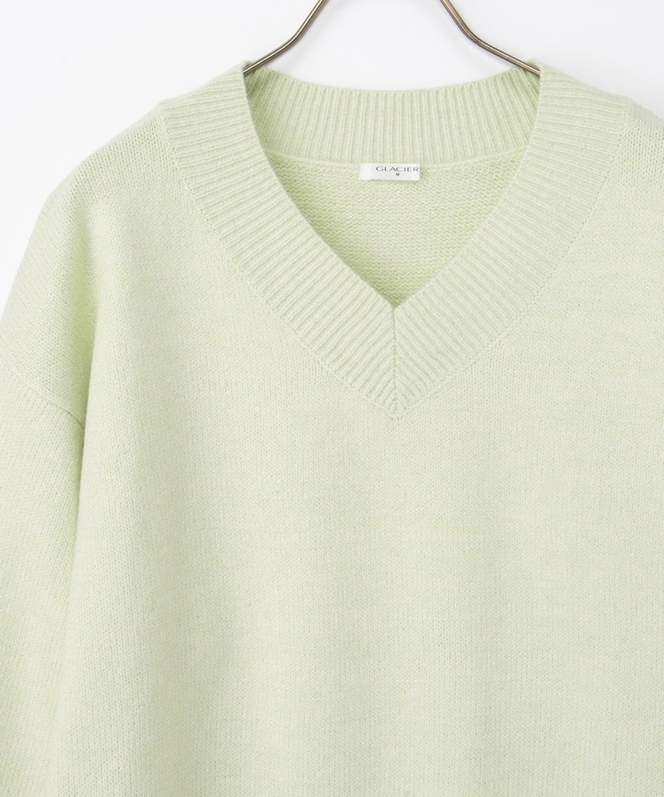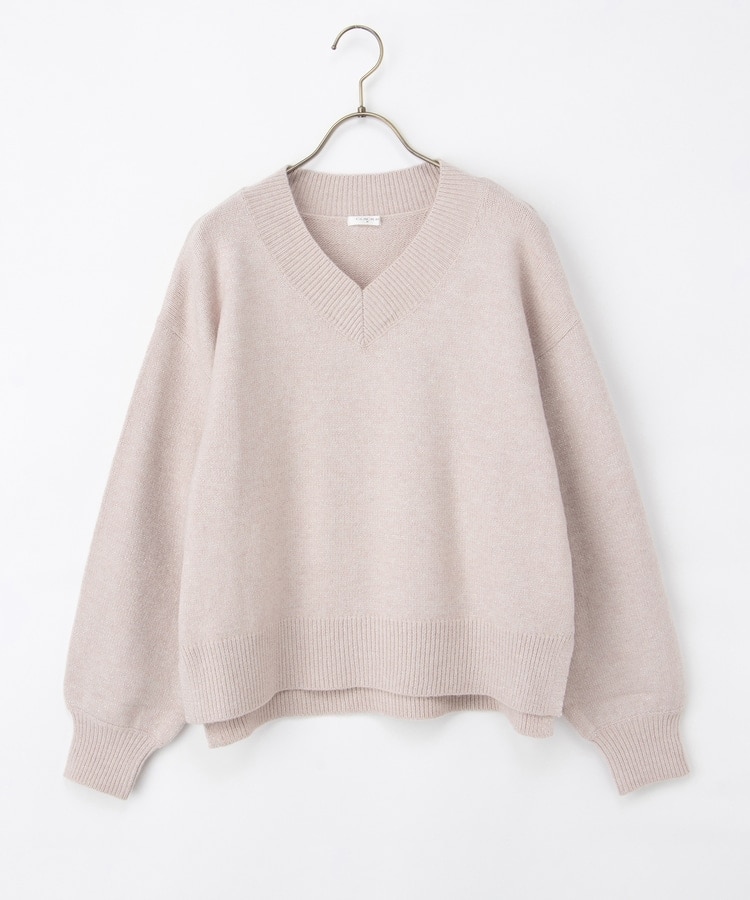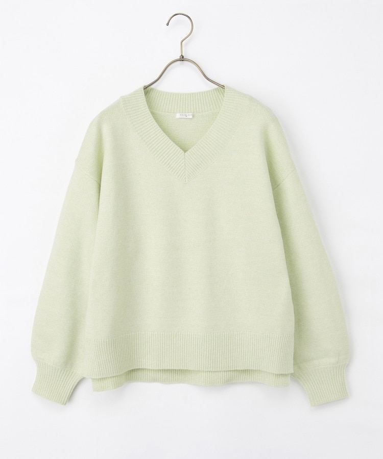顔周りをすっきり見せるVネックのシンプルデザインに、程よい光沢感のラメで華やかさをプラス。