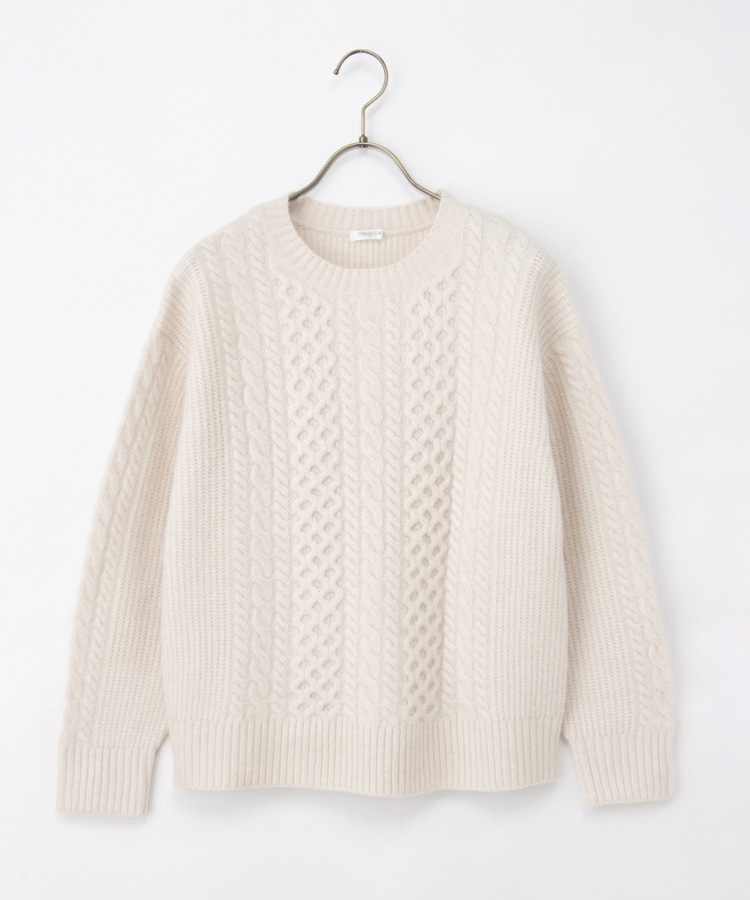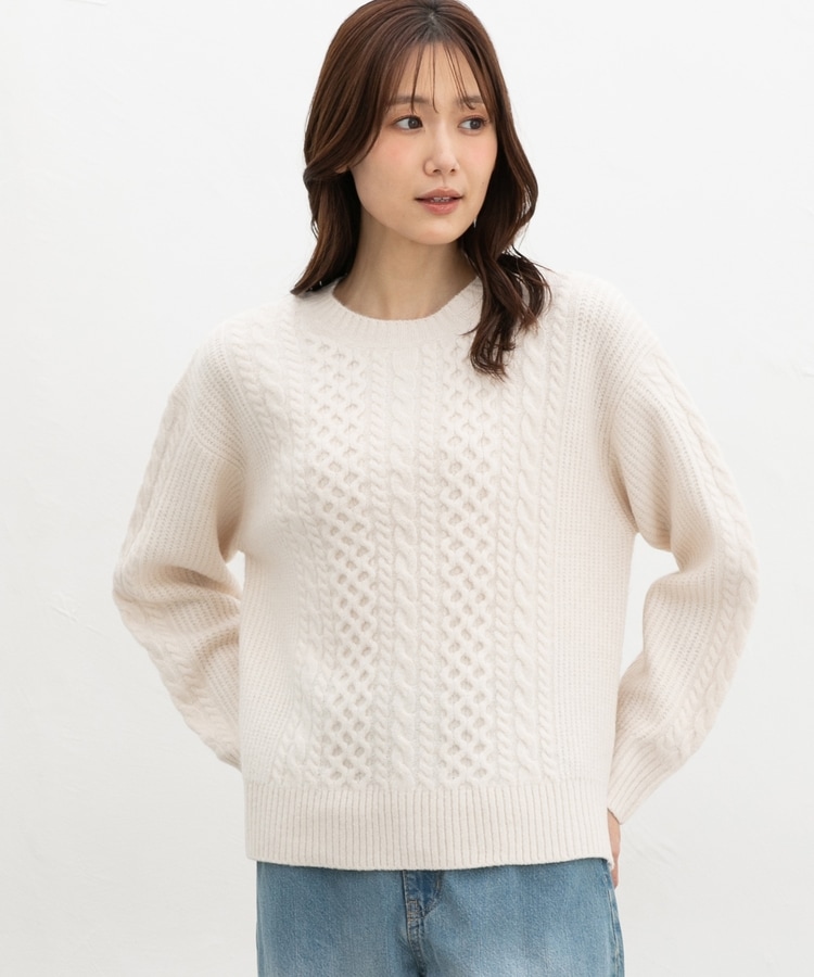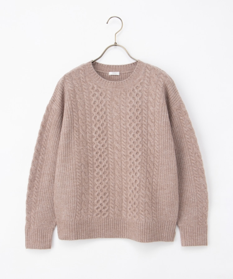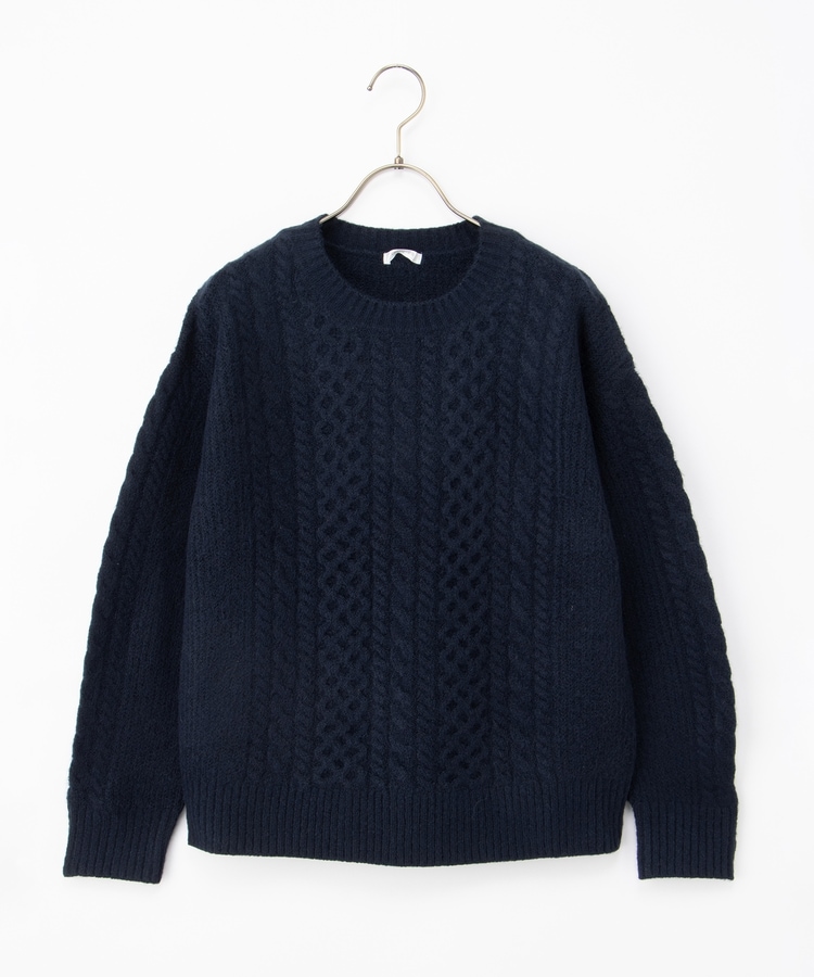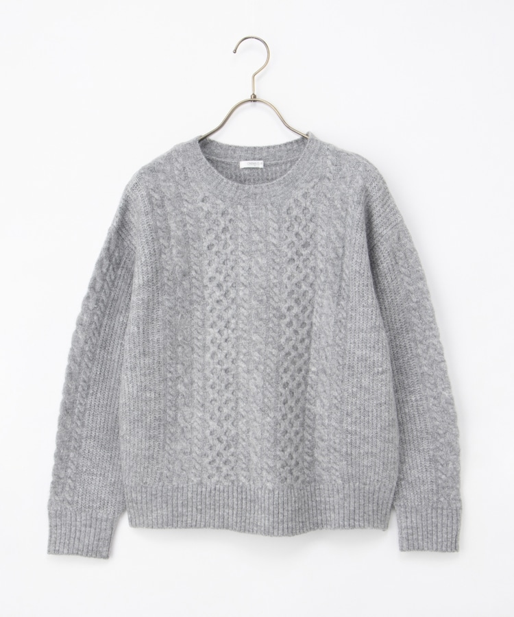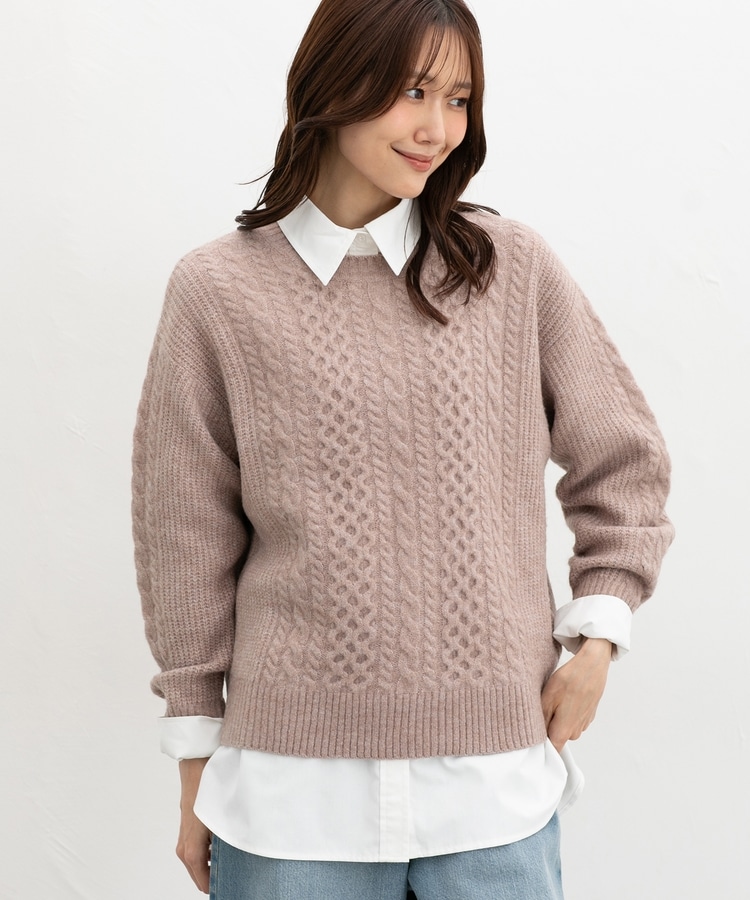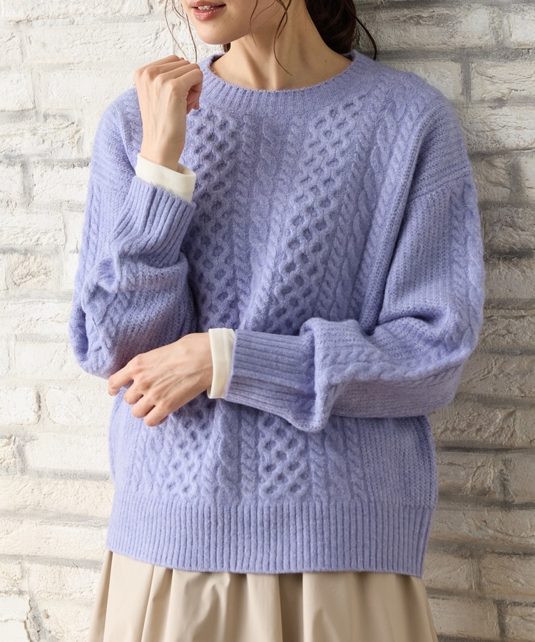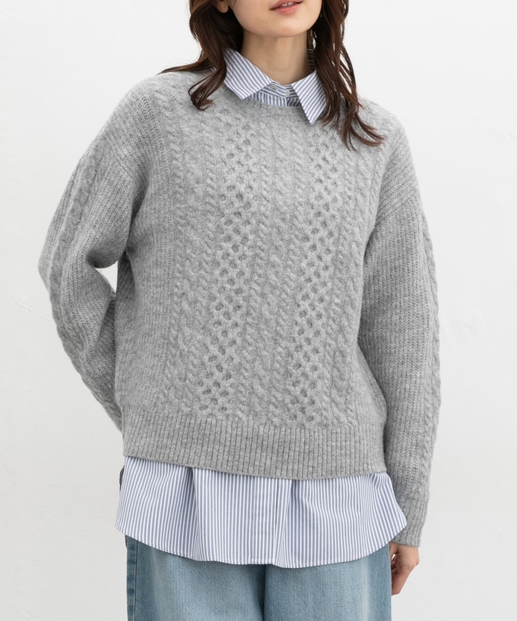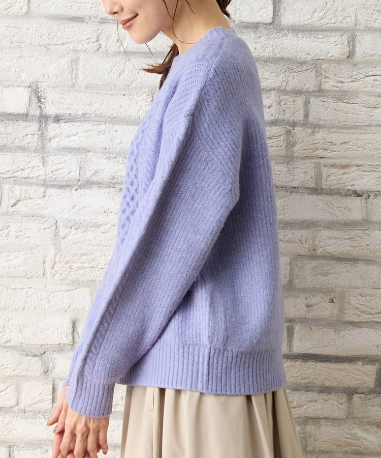 ベーシックなクルーネックに、前後で異なるケーブル&片畦編みが目を引く、大人可愛いデザイン。