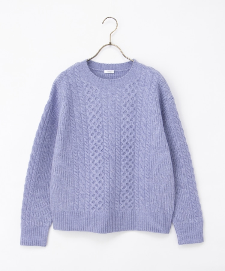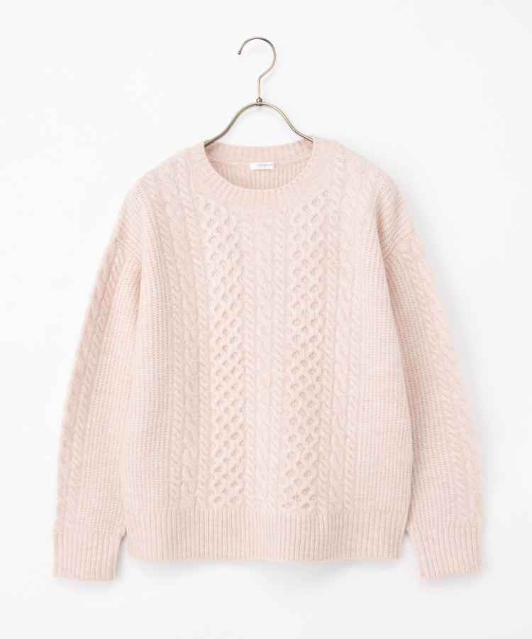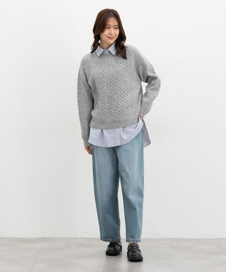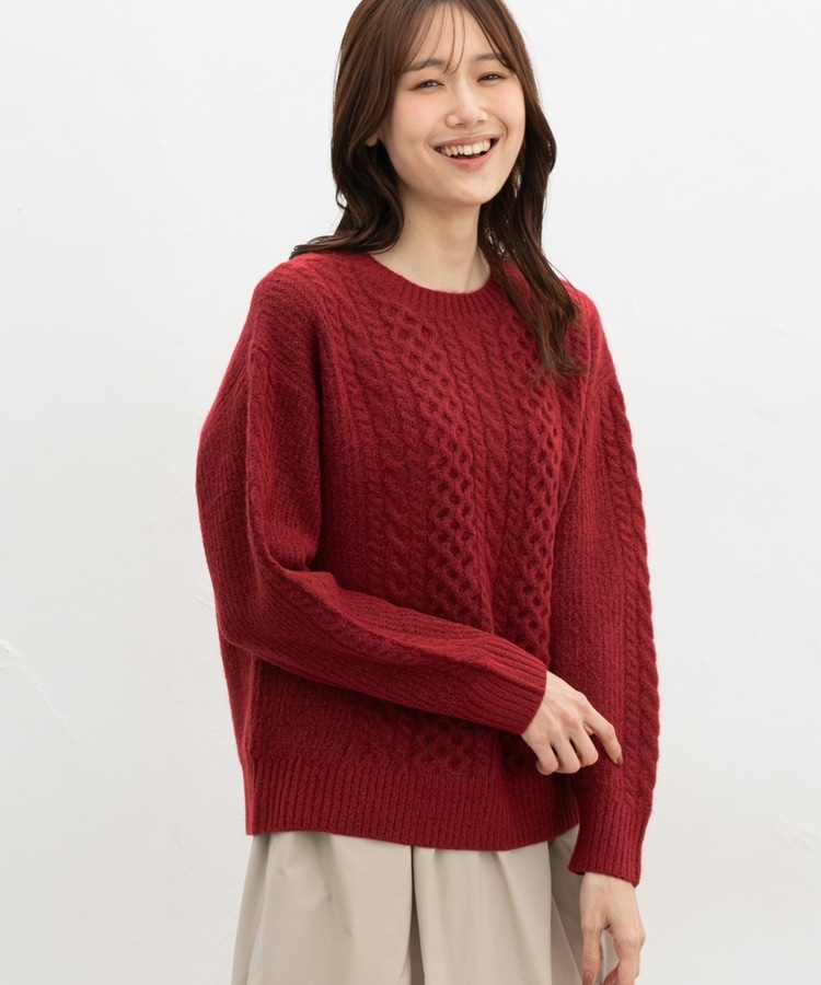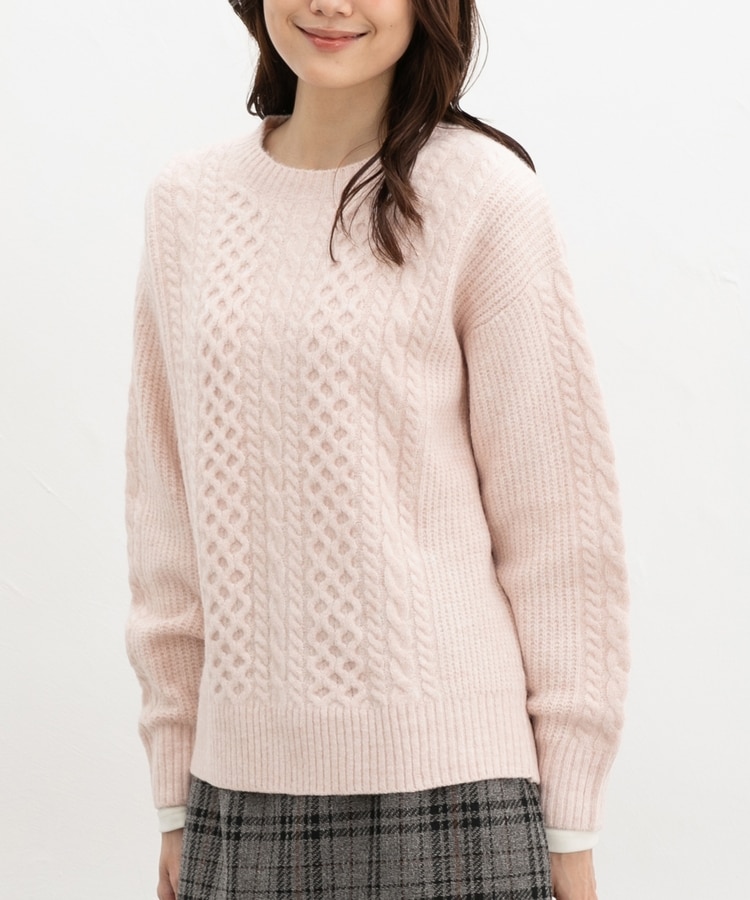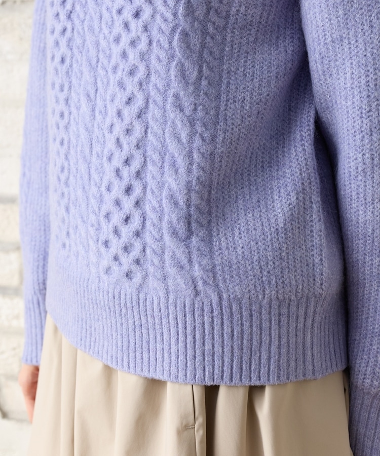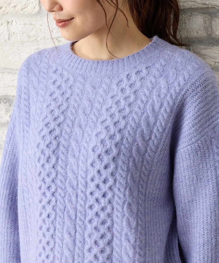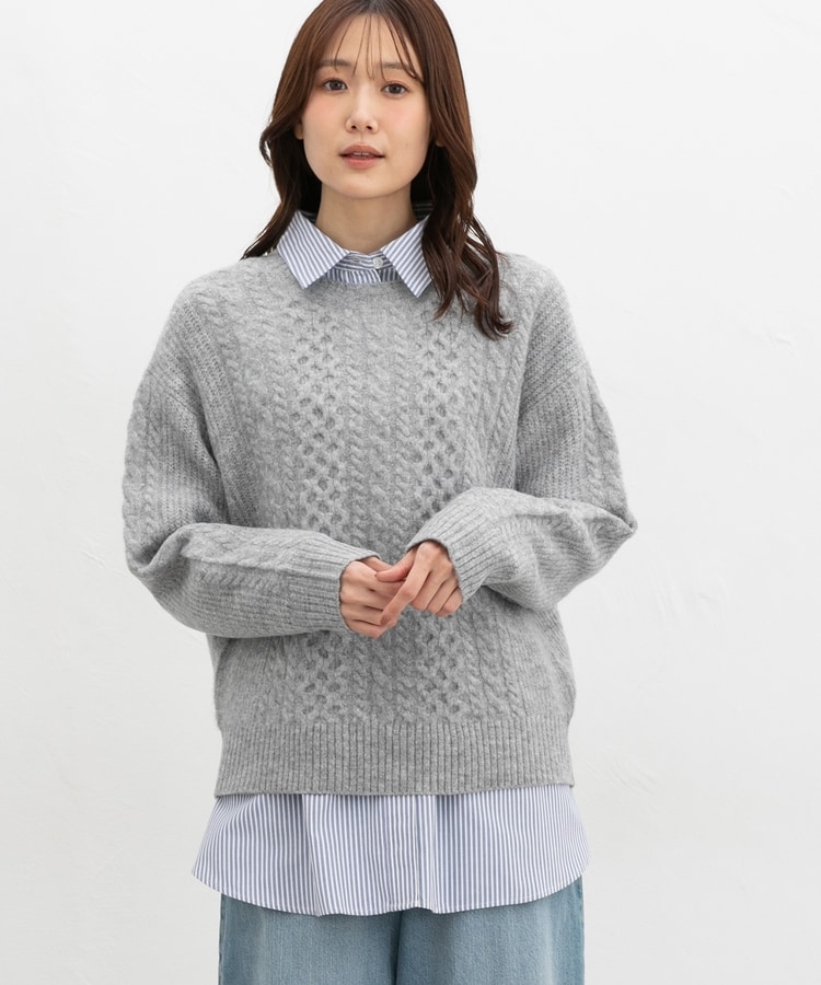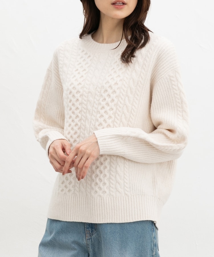 ベーシックなクルーネックに、前後で異なるケーブル&片畦編みが目を引く、大人可愛いデザイン。