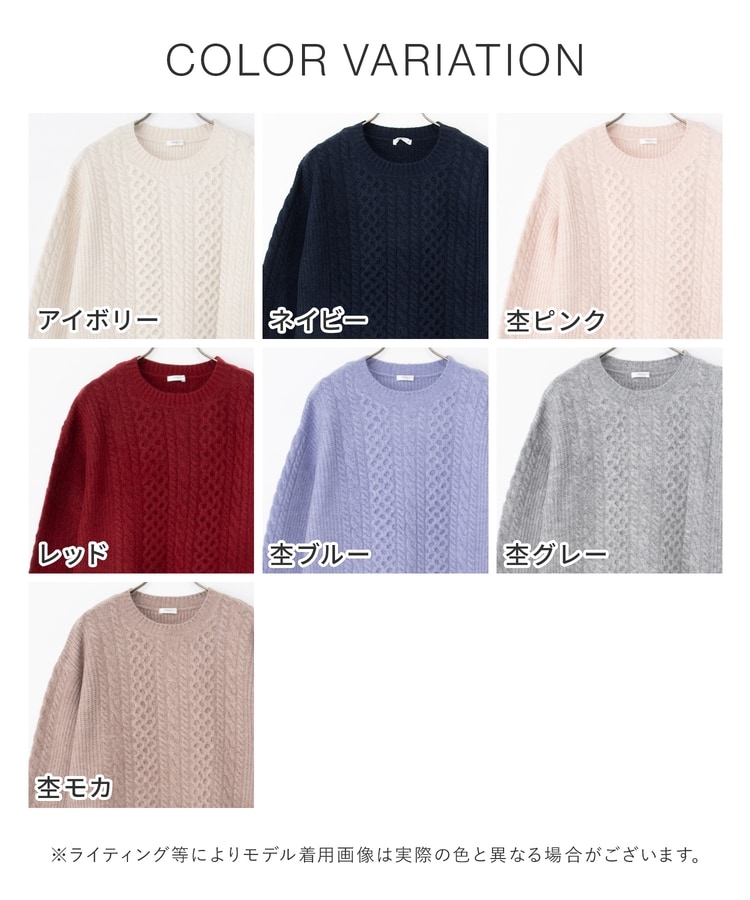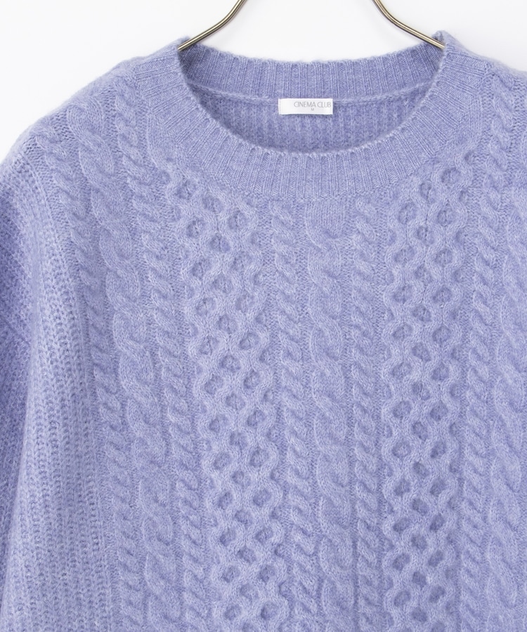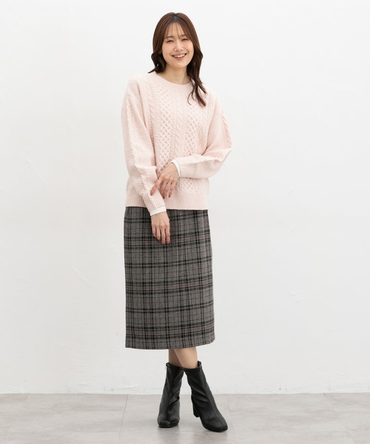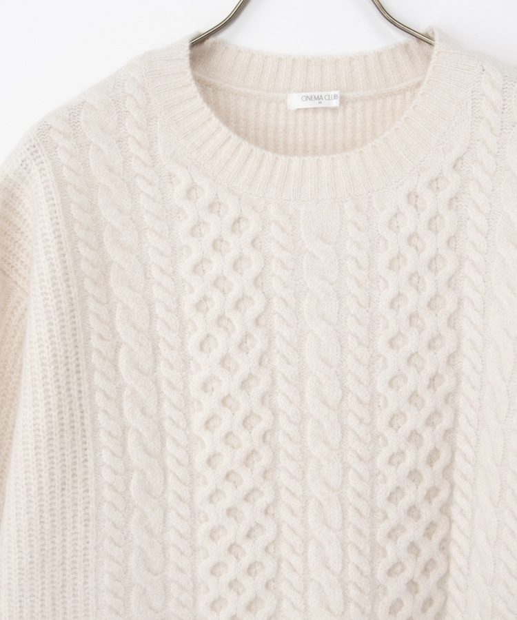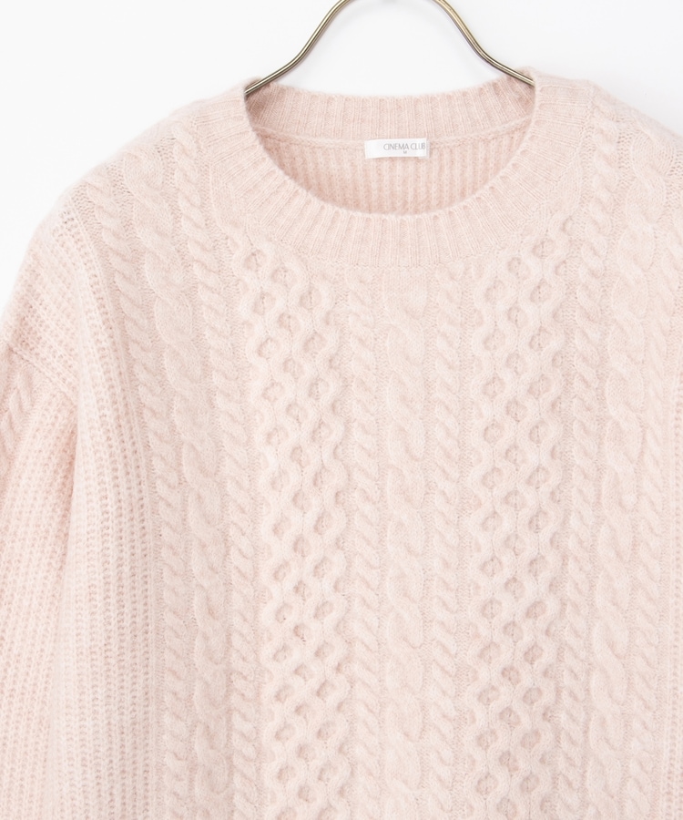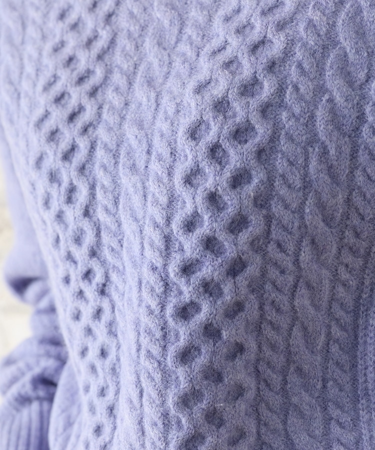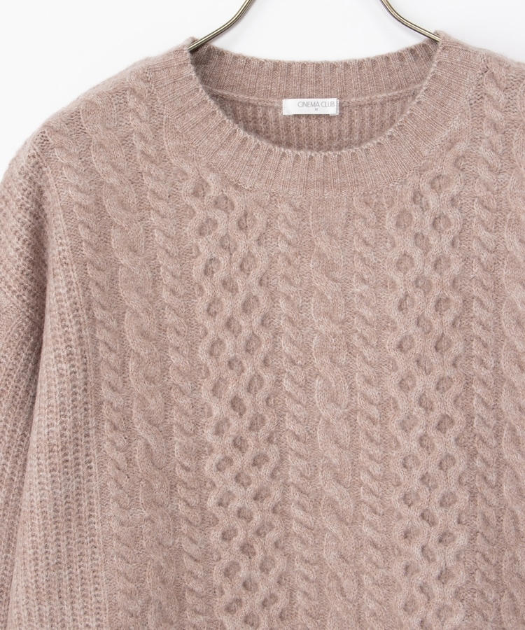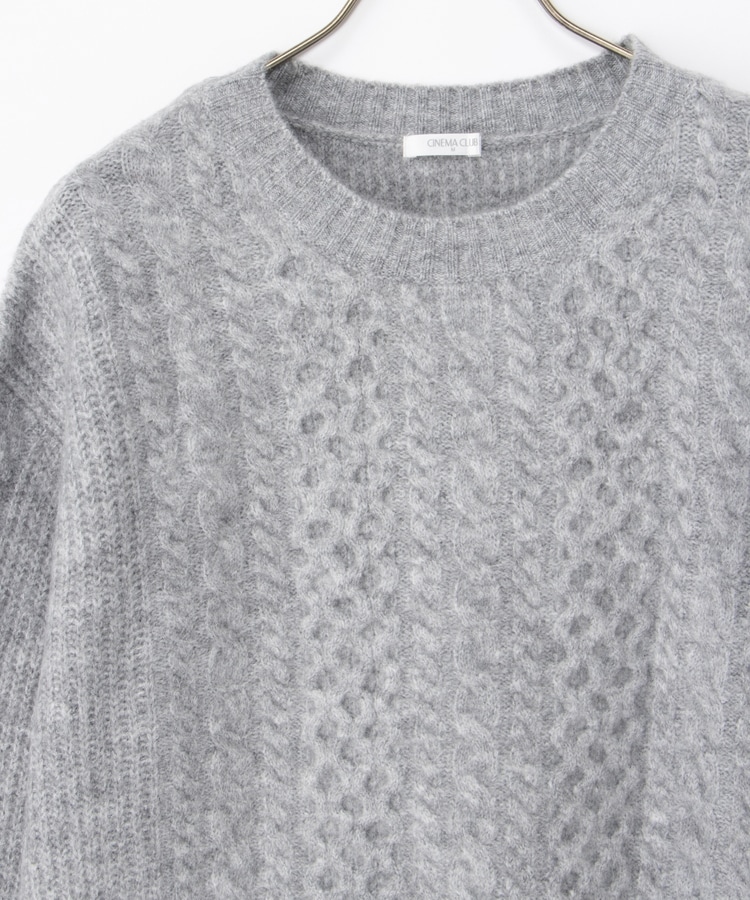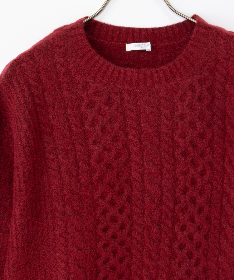 ベーシックなクルーネックに、前後で異なるケーブル&片畦編みが目を引く、大人可愛いデザイン。