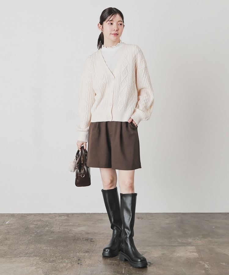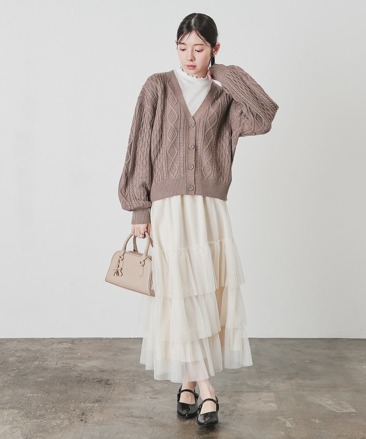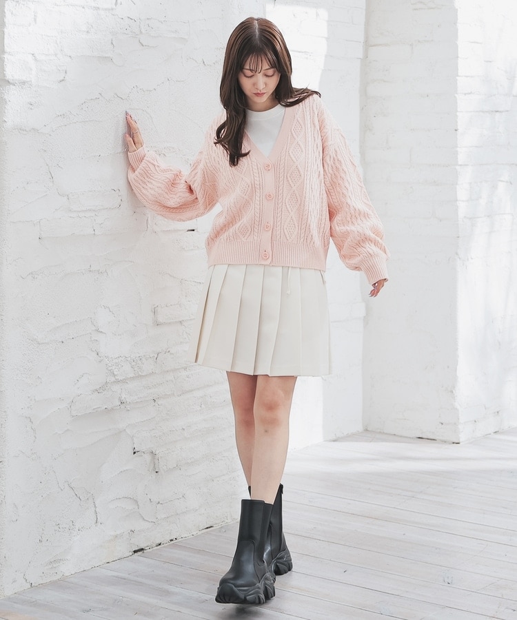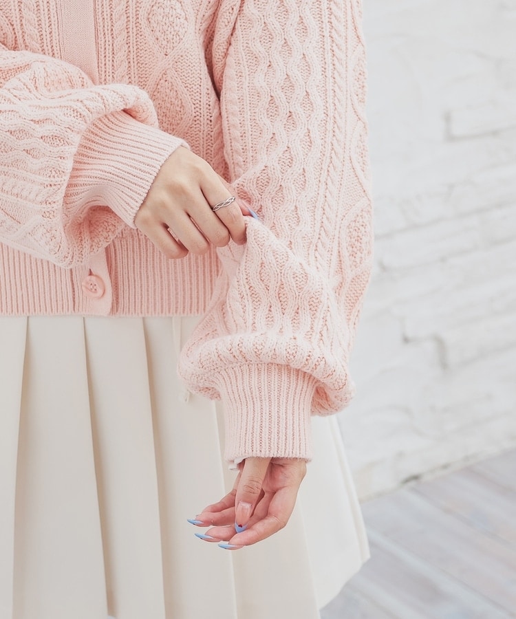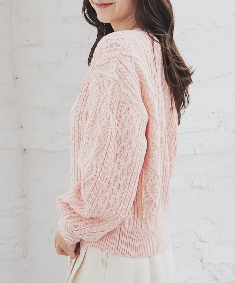 アウターを着る前の肌寒い季節にも活躍する、程よい厚みで立体感のあるケーブル編みニット素材。