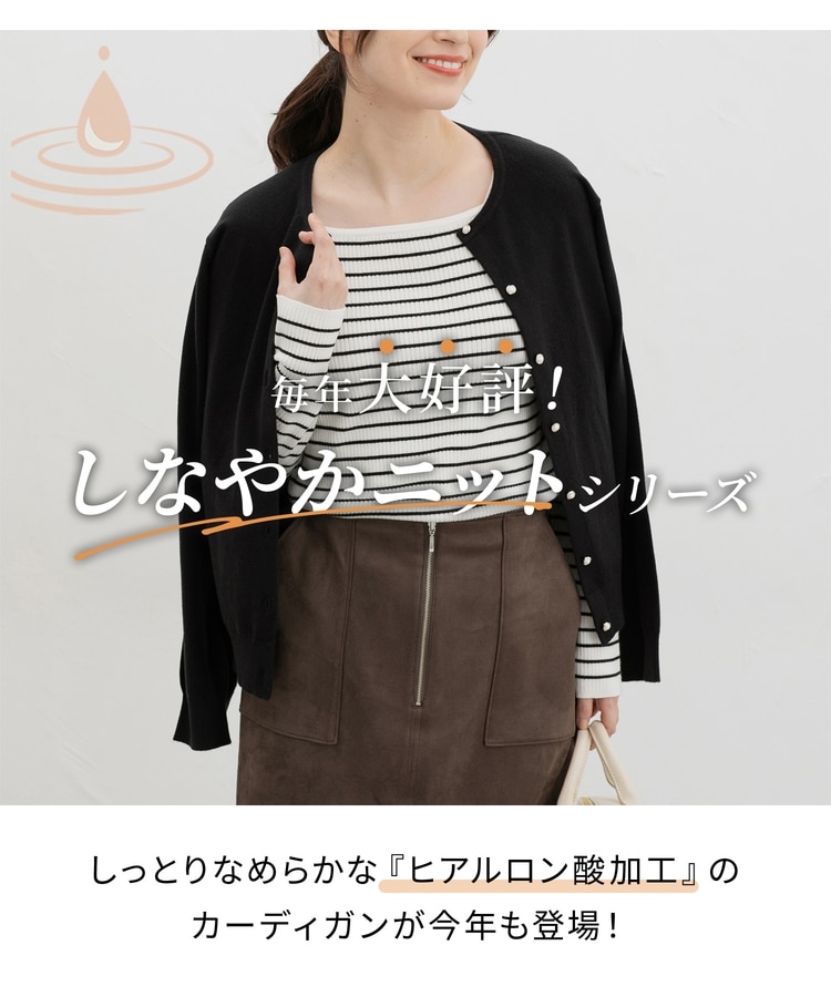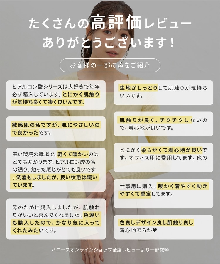 軽くてもちもちとした糸に『ヒアルロン酸加工』をプラスした、しっとりソフトな風合いの『しなやかニット』素材。