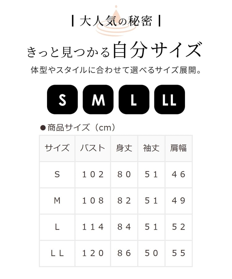 | サイズ | バスト | 身丈 | 袖丈 | 肩幅 |