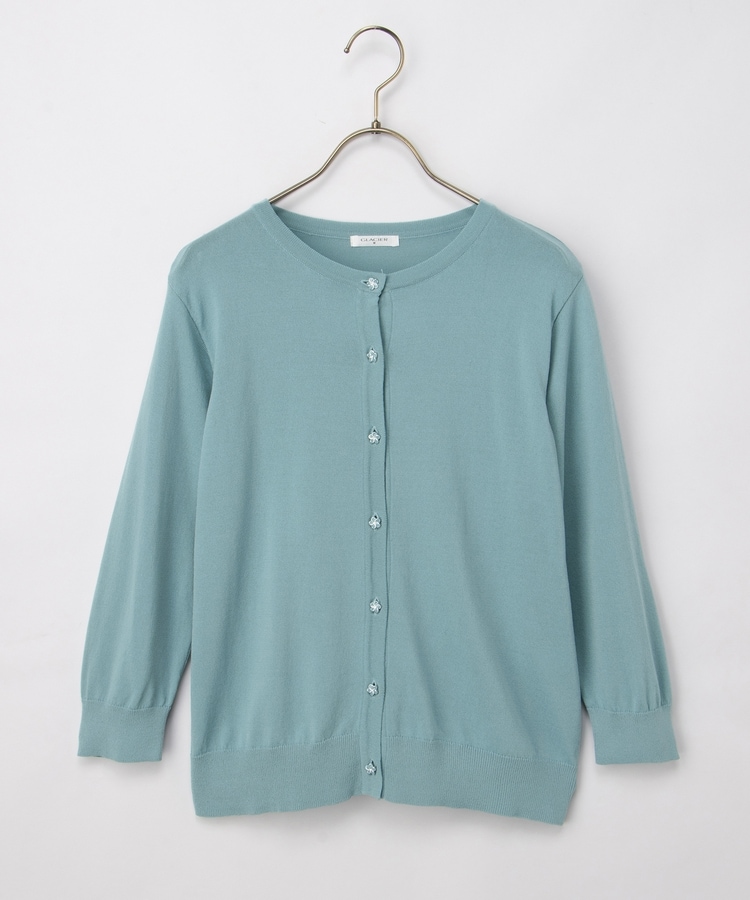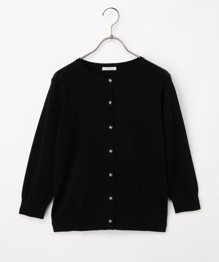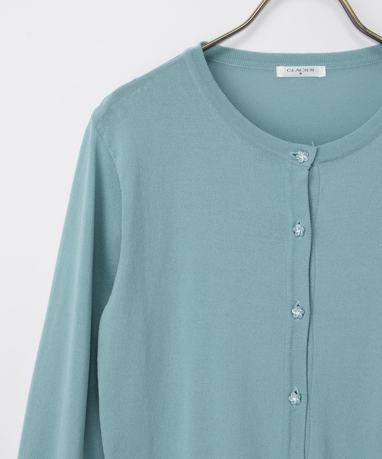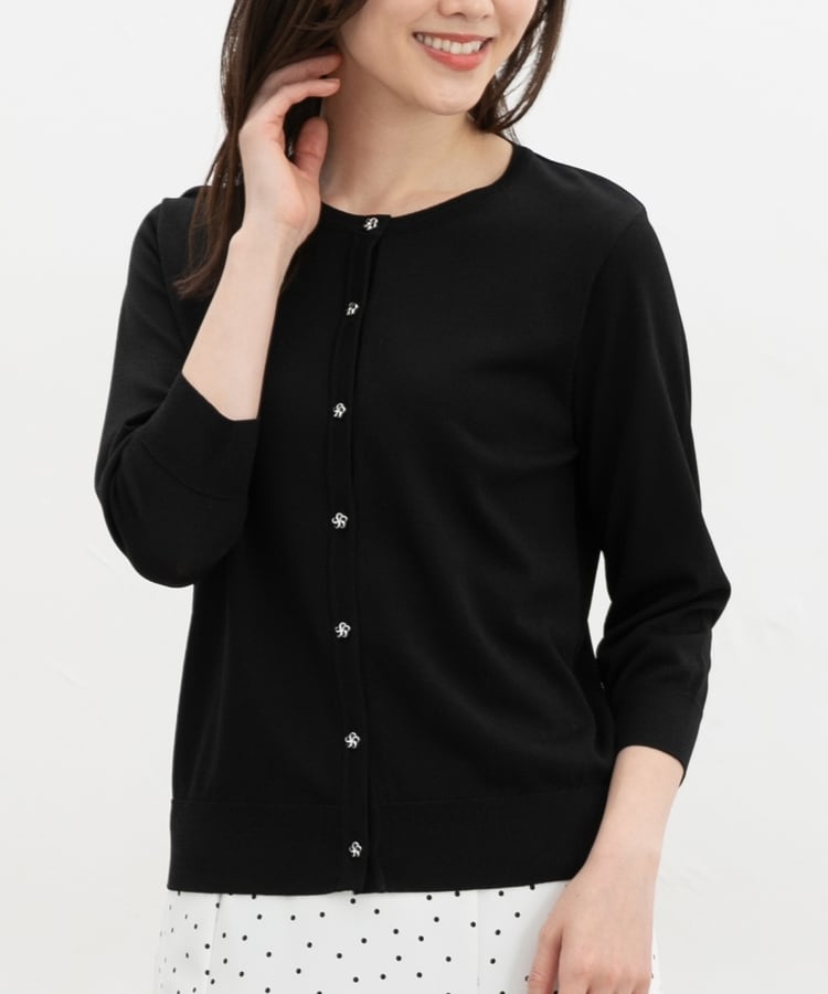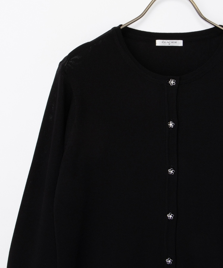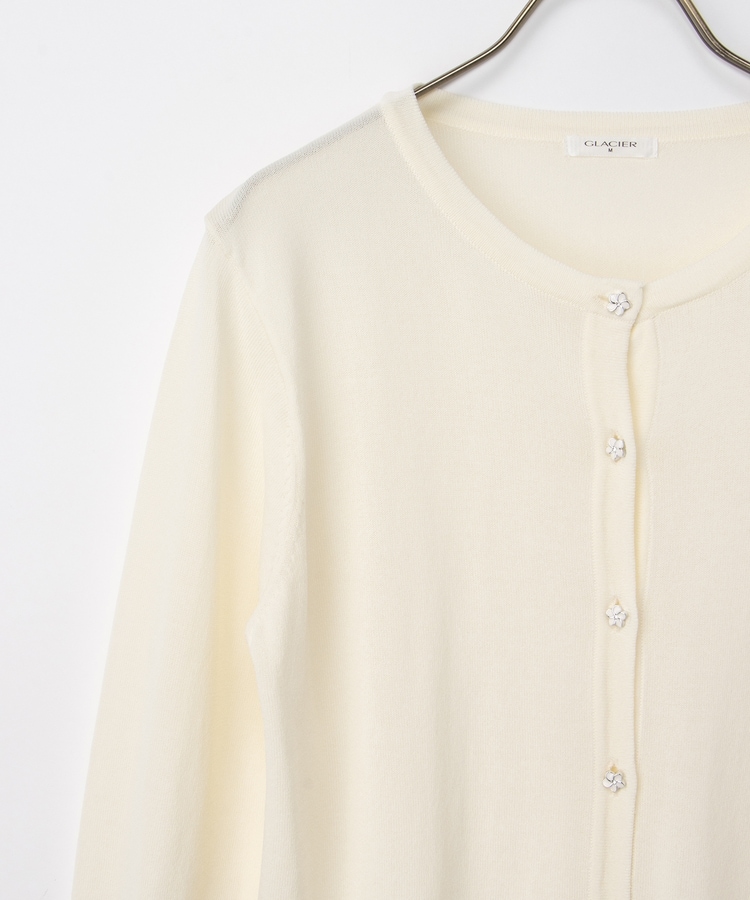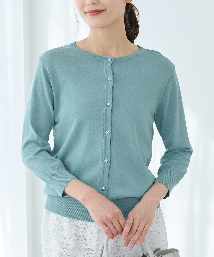 どんなコーデにも合わせやすいクルーネックのシンプルデザインに、フラワーボタンがフェミニンなアクセント。
