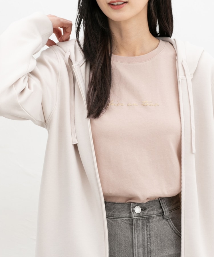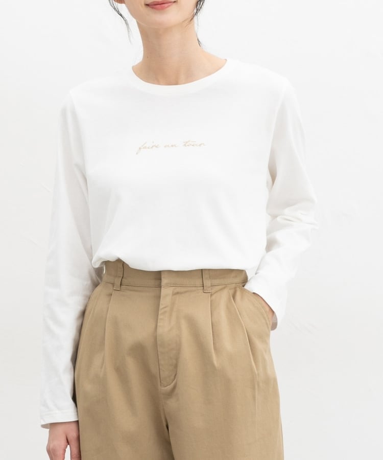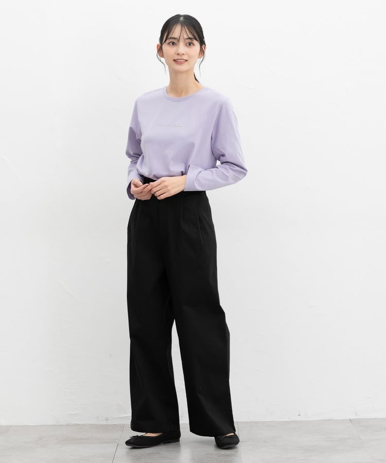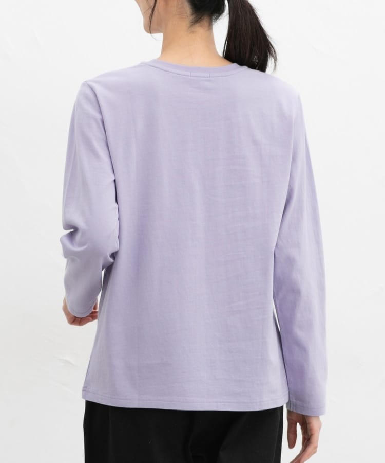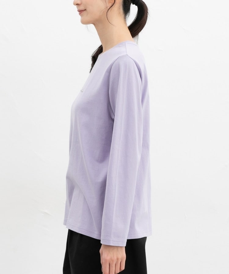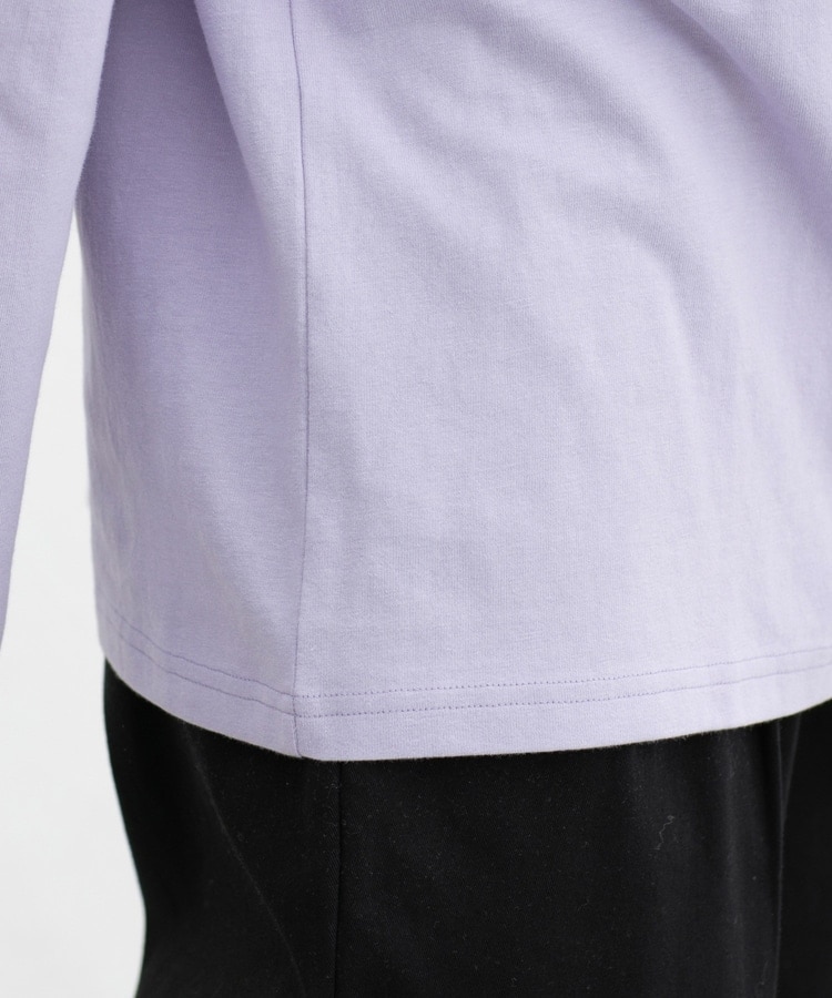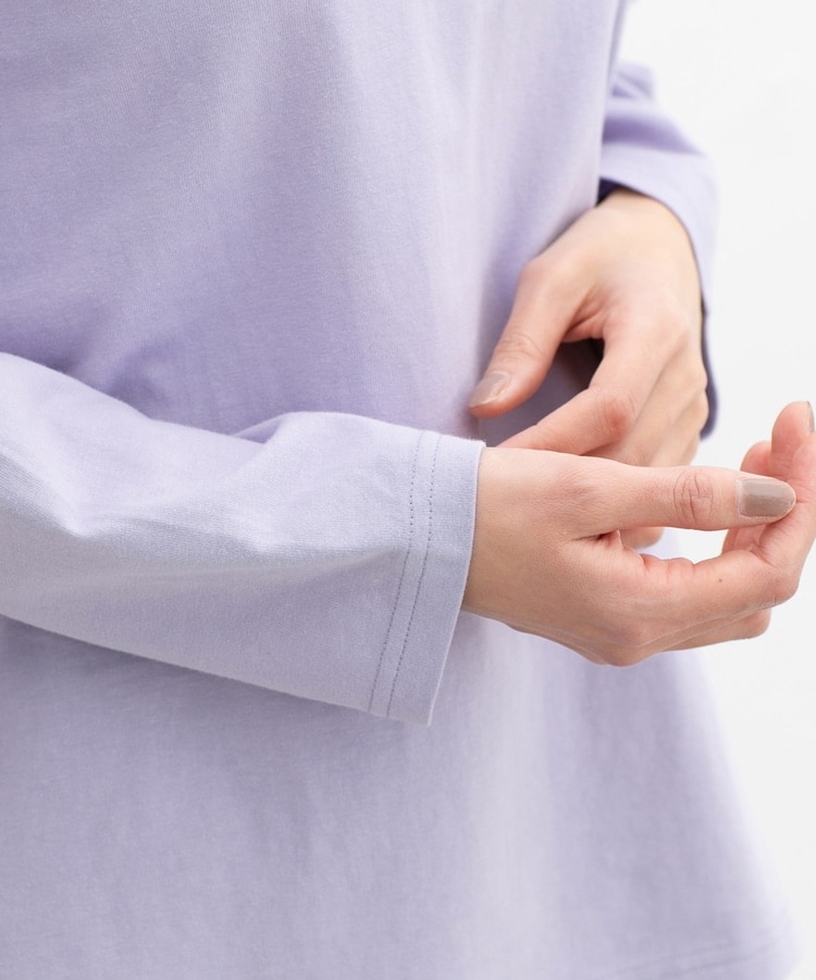 ベーシックなクルーネックで、ゆったりめの幅と腰回りが隠れる丈感。