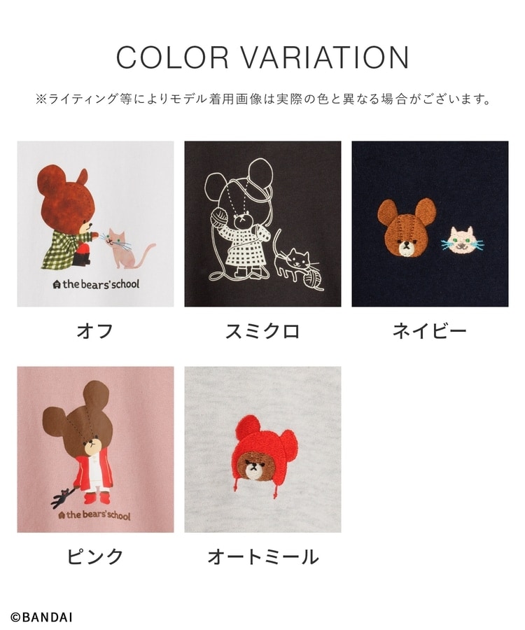 絵本シリーズ「くまのがっこう」のジャッキーやねこさん、チャッキーたちのワンポイント刺繍やプリントが可愛らしいデザイン。