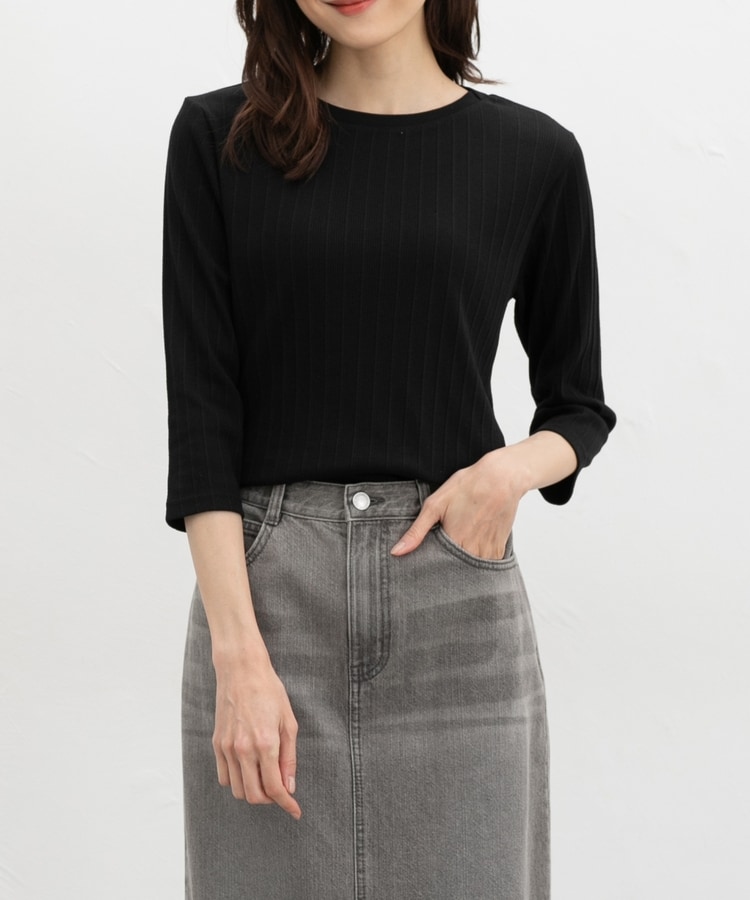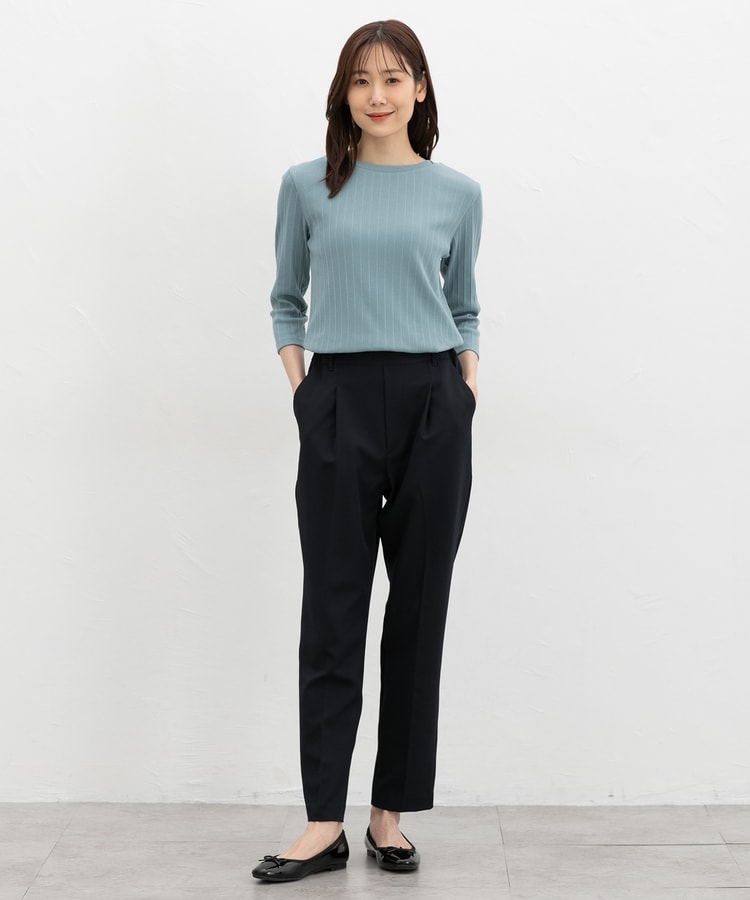 腰にかかる丈感の体にフィットするシルエットと縦目のラインで細見え効果も◎
