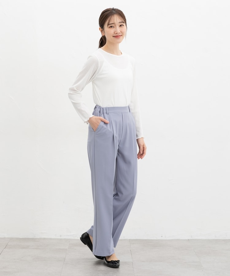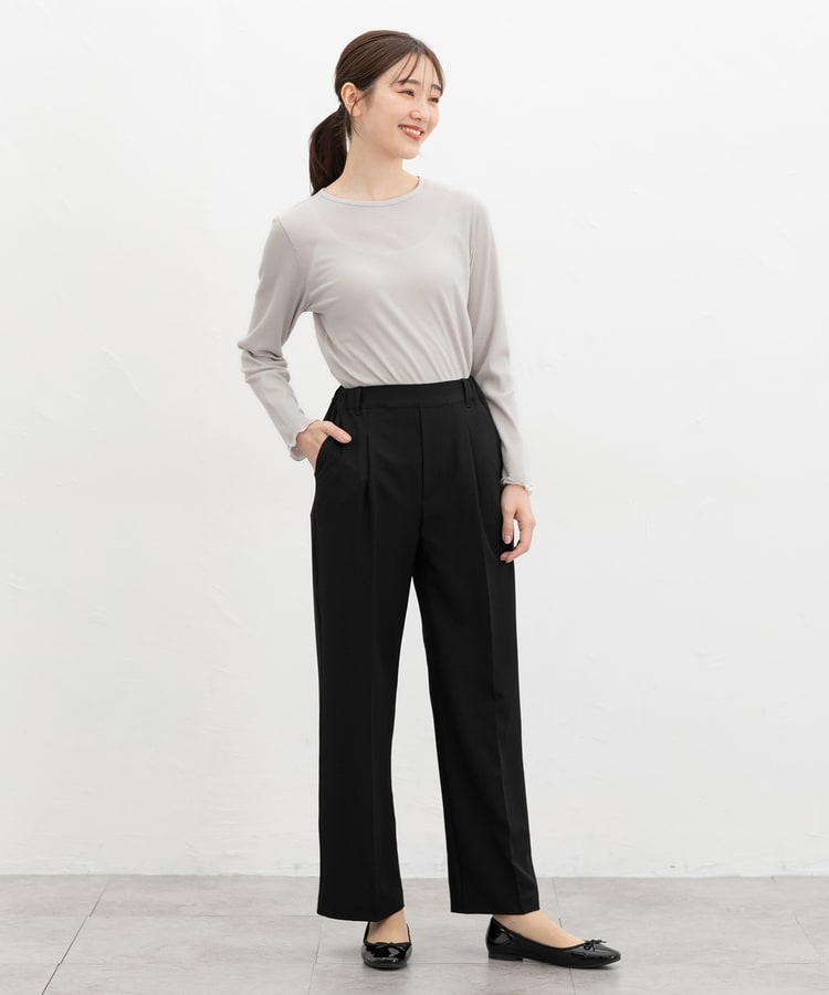 腰にかかる丈感のすっきりめシルエットと縦目のラインで細見え効果も◎