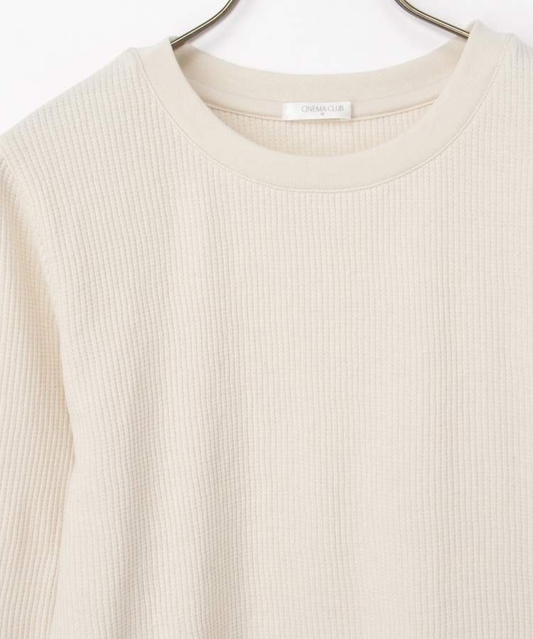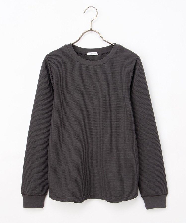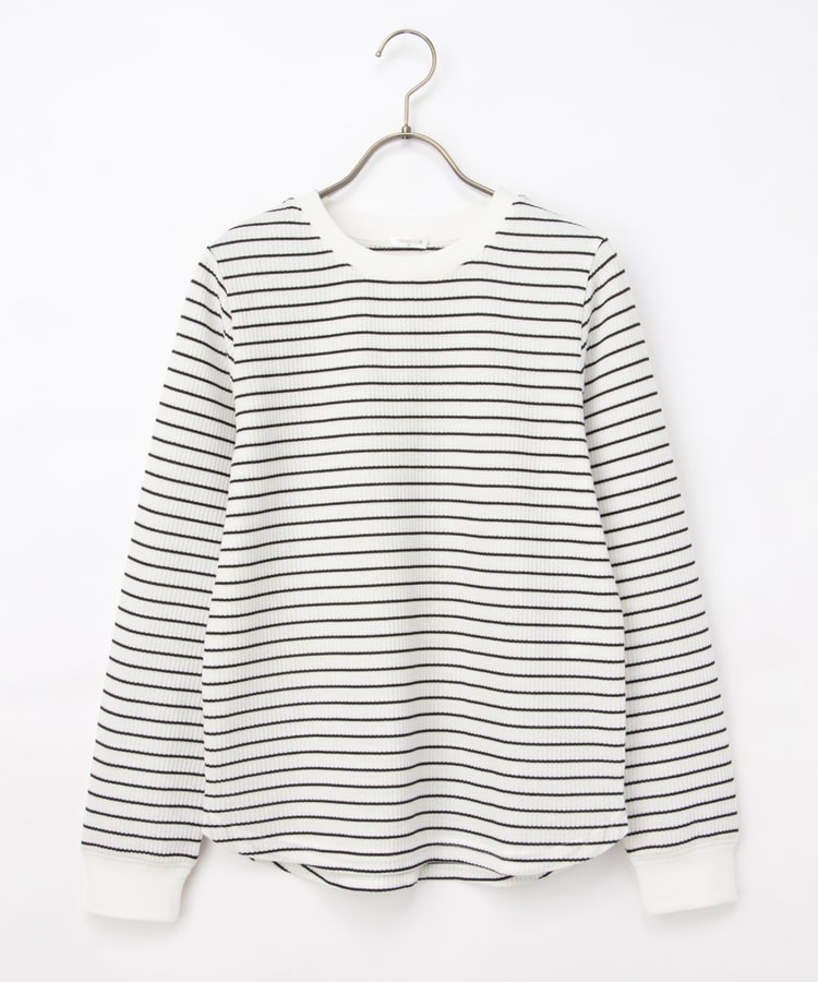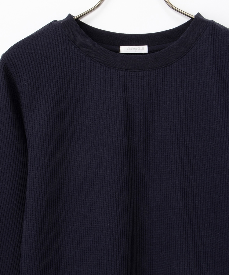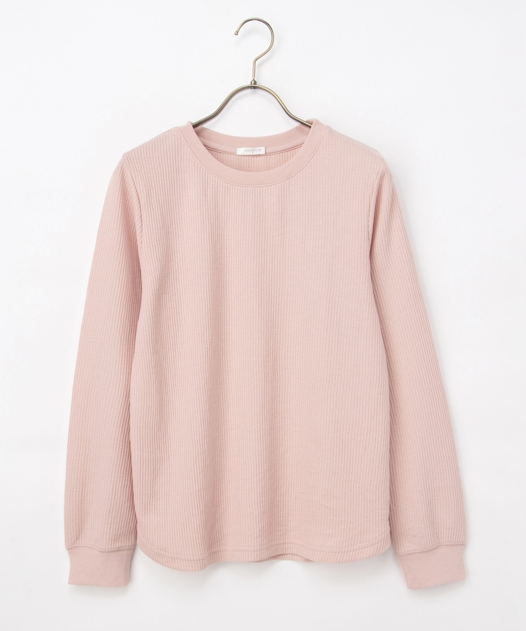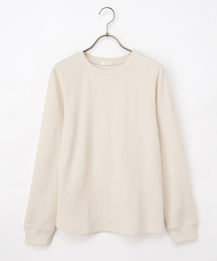 優しげなクルーネックと控えめなラウンド裾がフェミニンなデザイン。