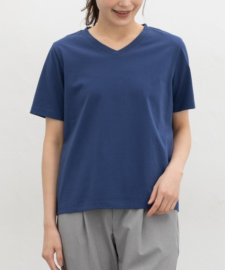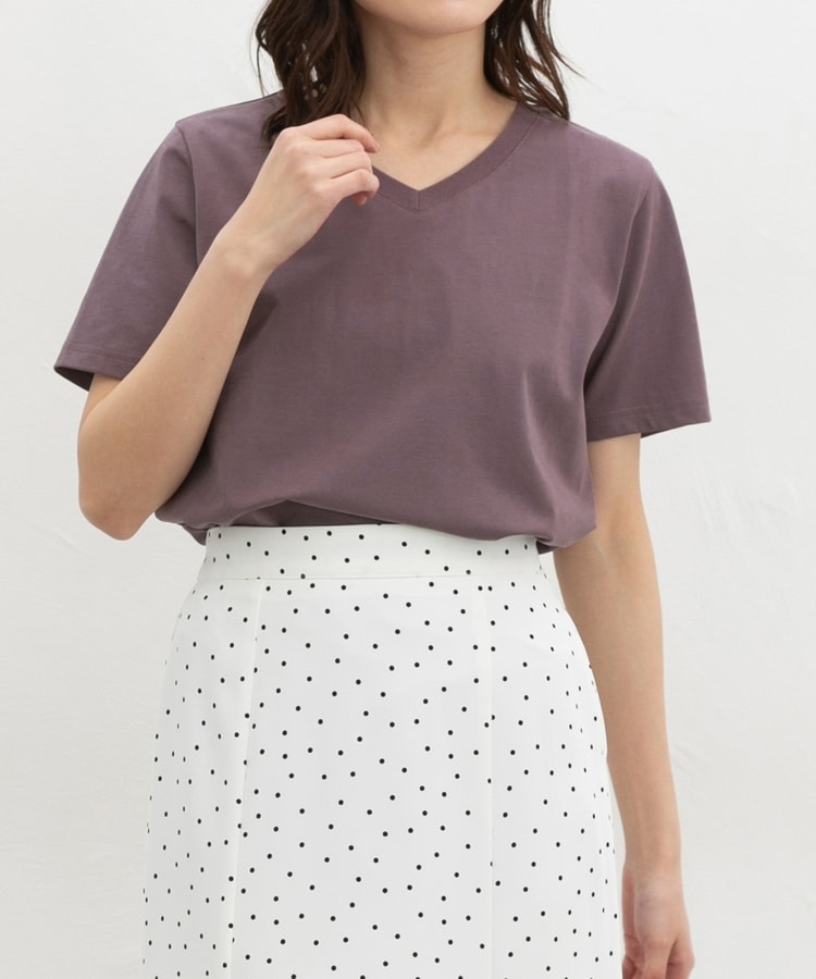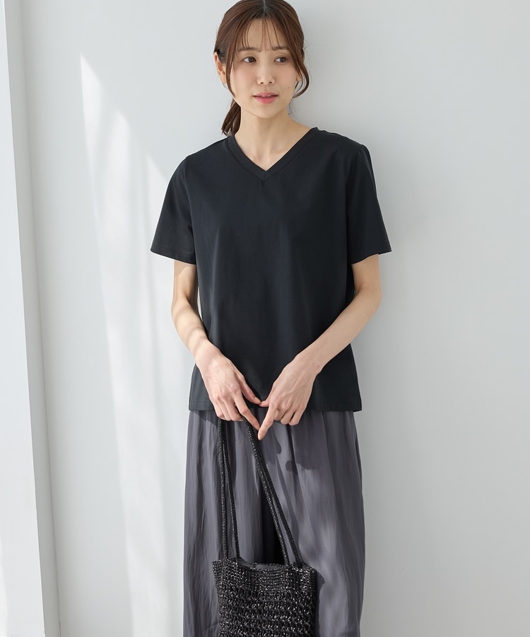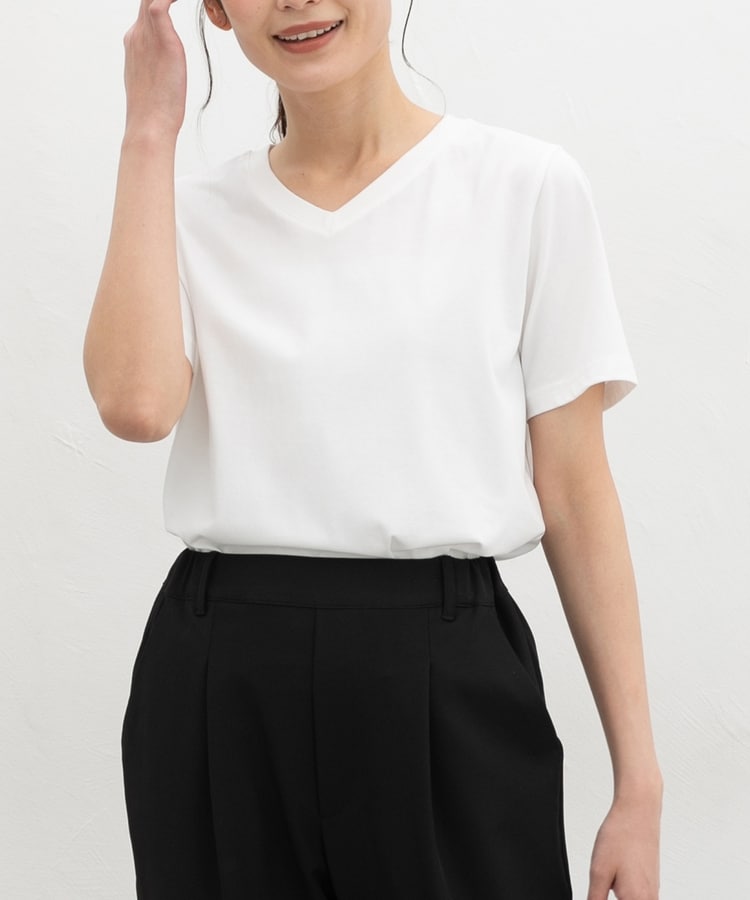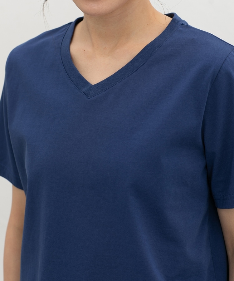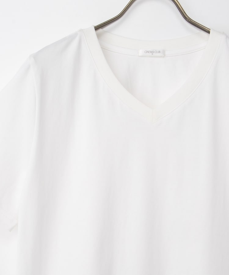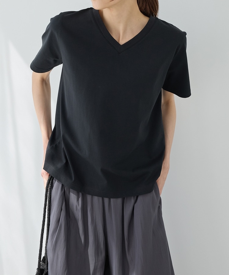 デコルテをすっきり見せるVネックのシンプルデザイン。