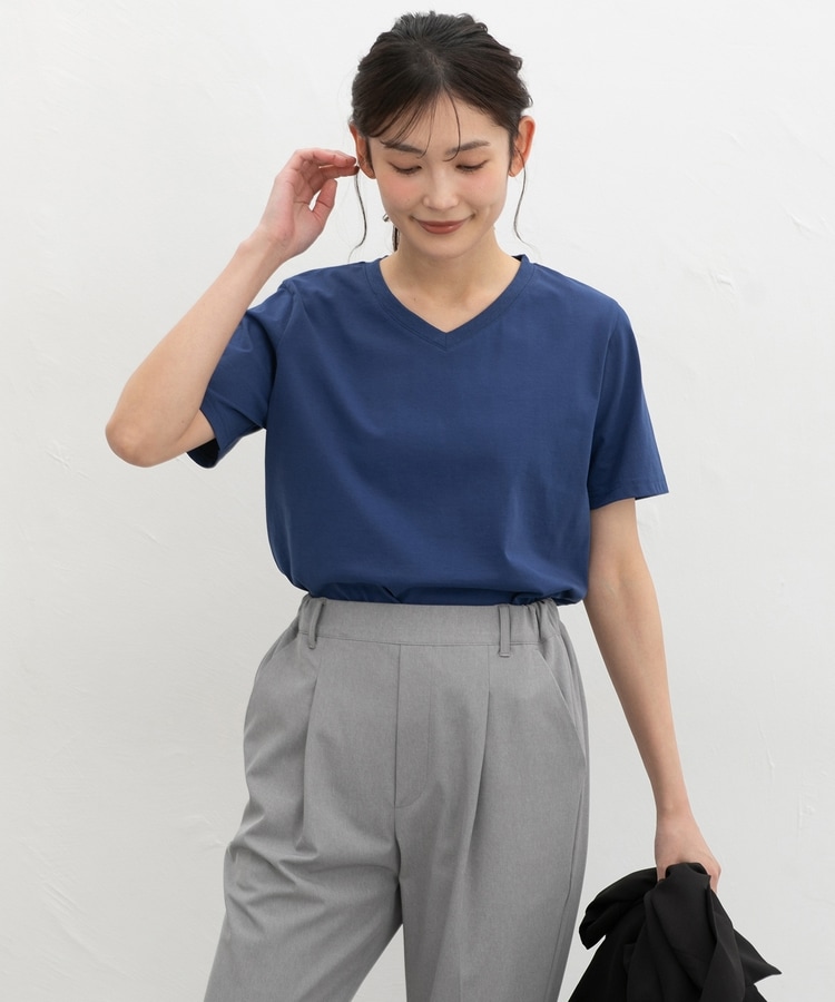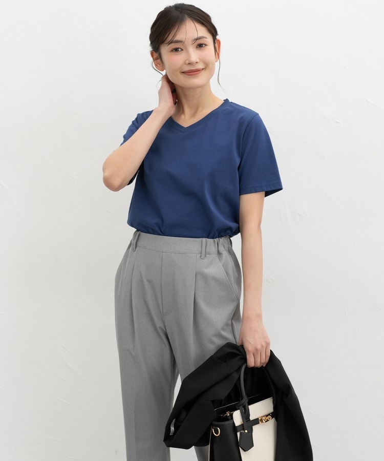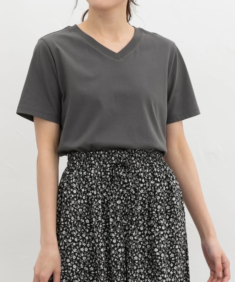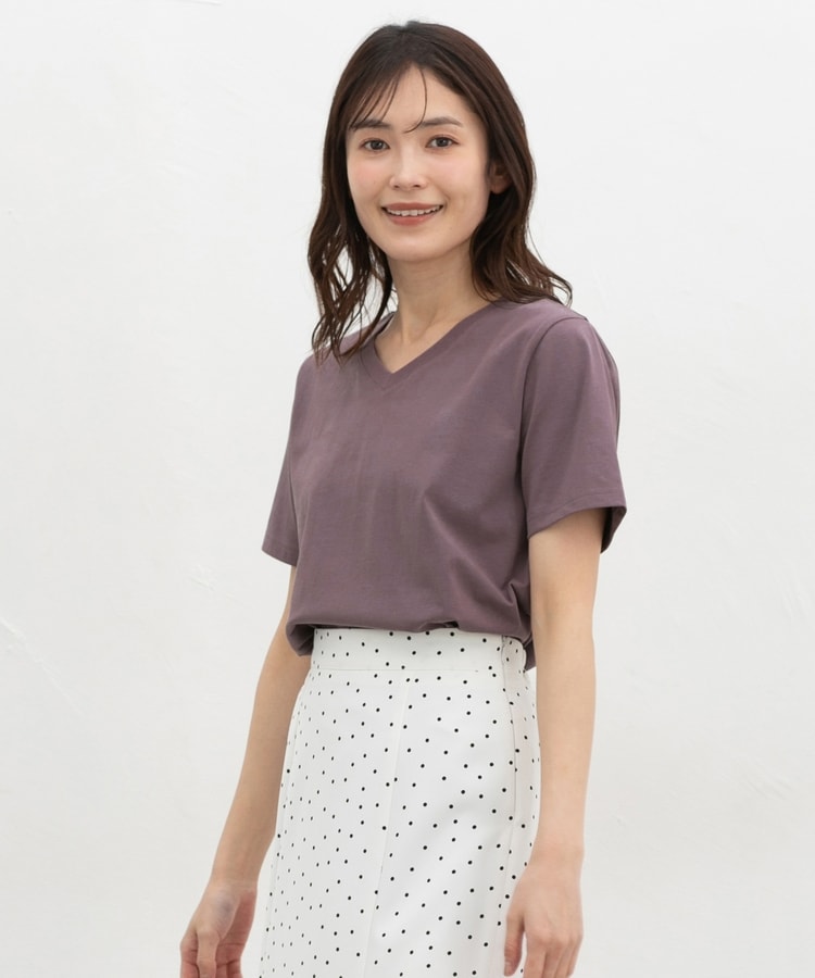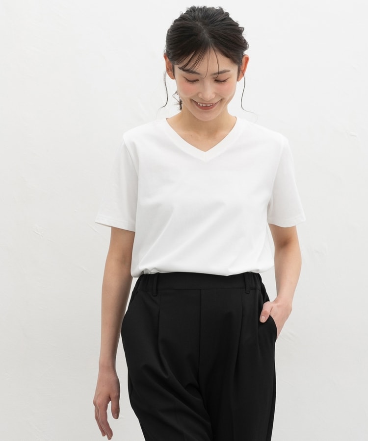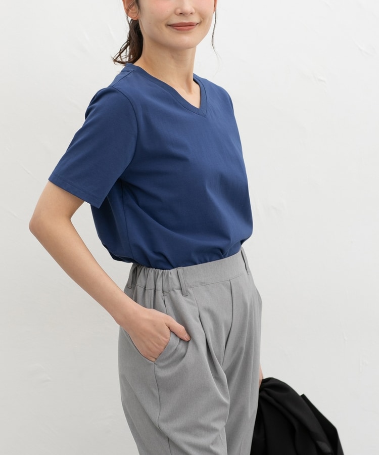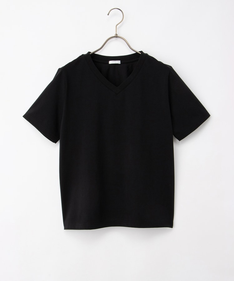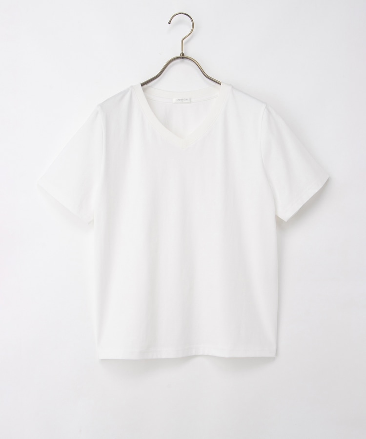 デコルテをすっきり見せるVネックのシンプルデザイン。