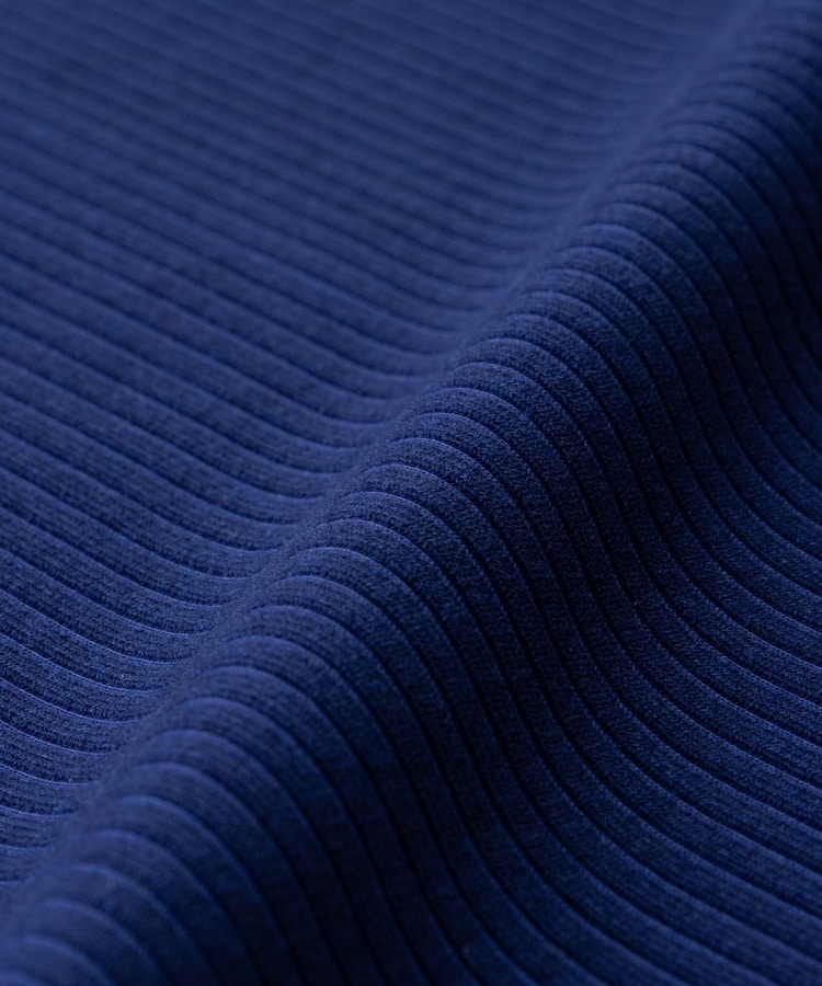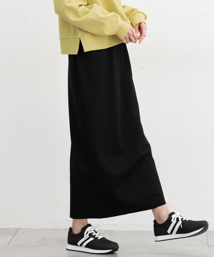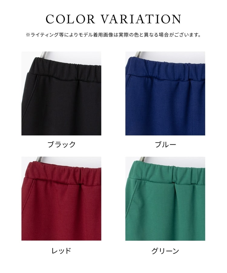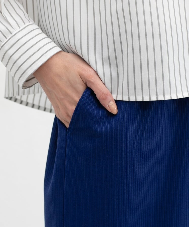 ストレッチの利いたレーヨン混のリブ素材とウエストゴムで、ストレスフリーなはき心地。