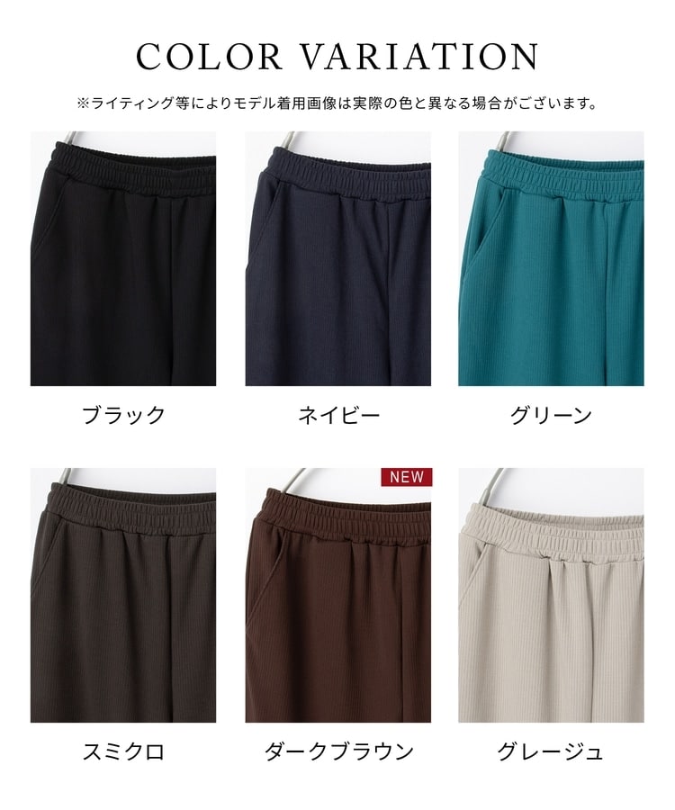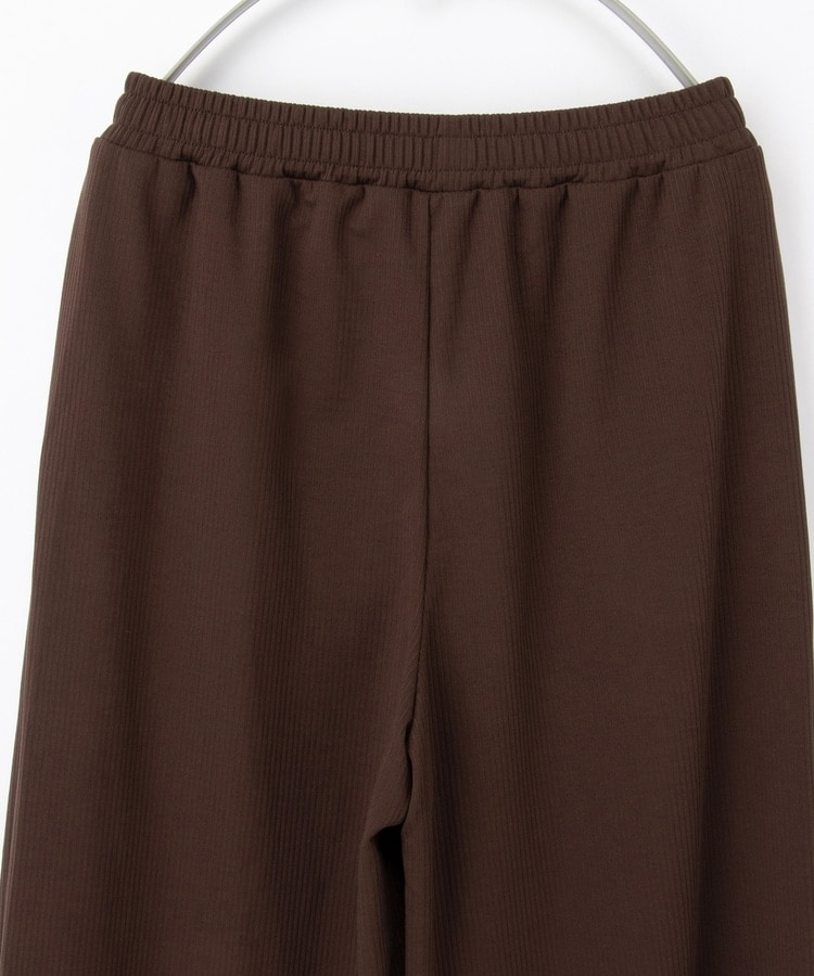 ストレッチの利いたレーヨン混のリブ素材とウエストゴムで、ストレスフリーなはき心地。