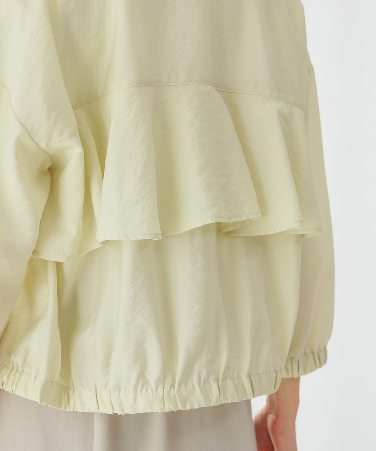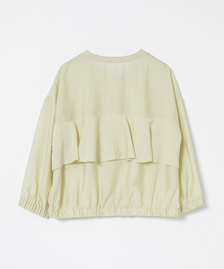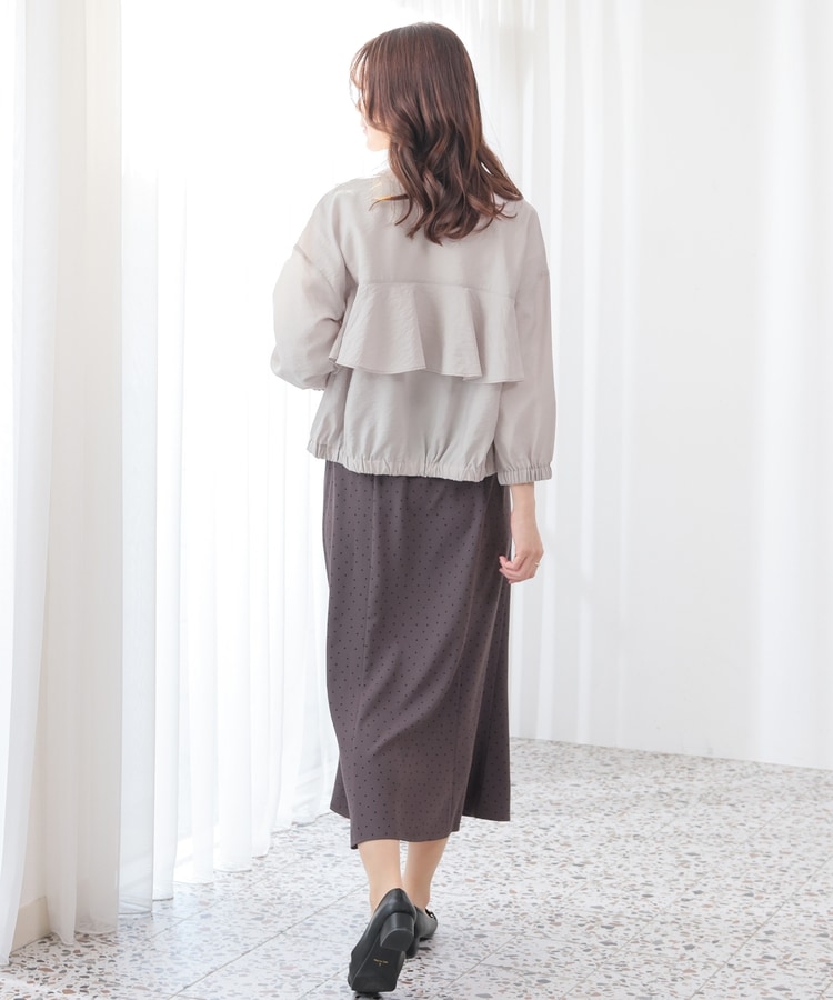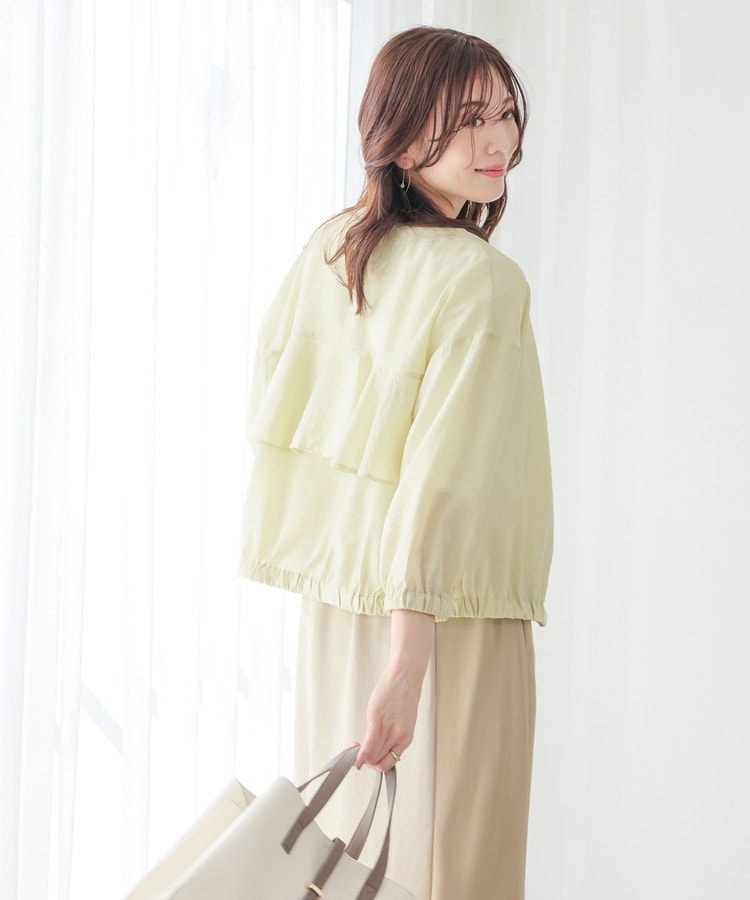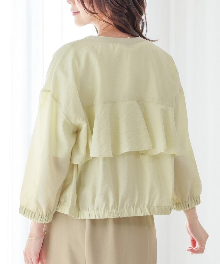 程よい透け感のシンプルデザインに、バックのフリルで洒落感をプラスし、大人な抜け感と上品さを演出。