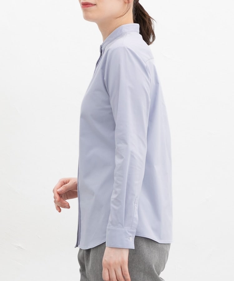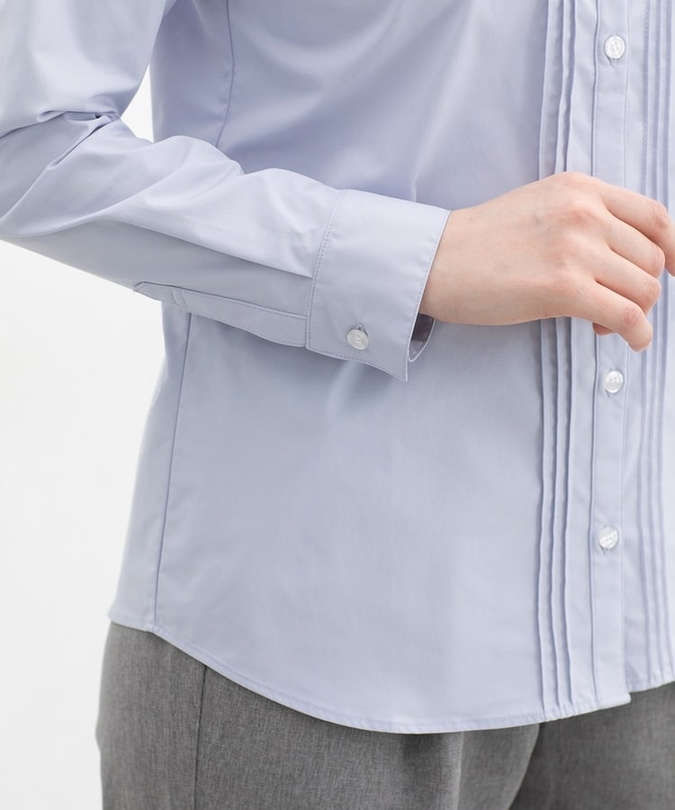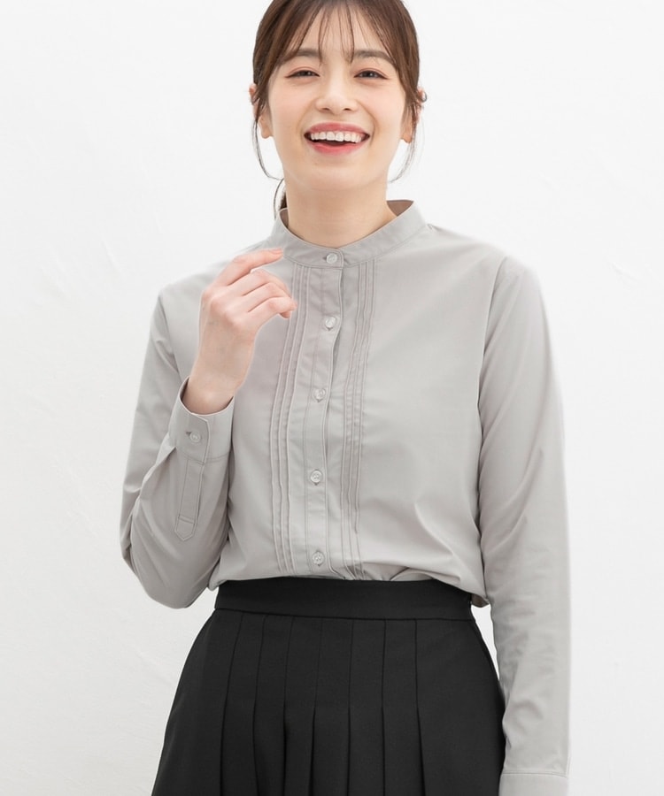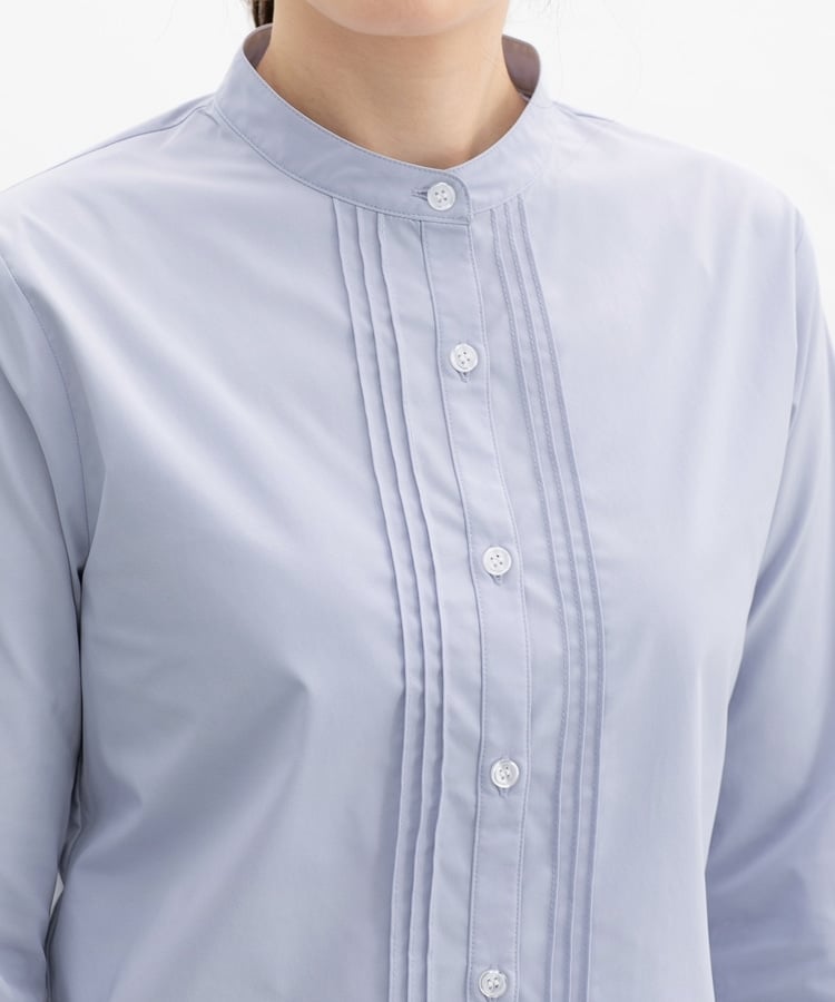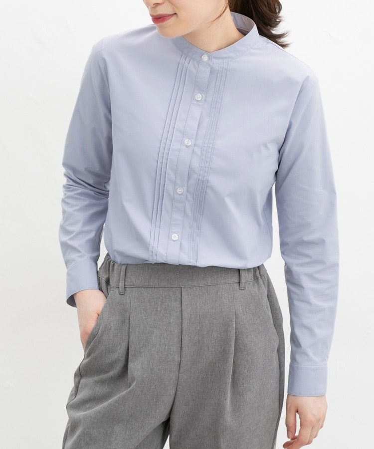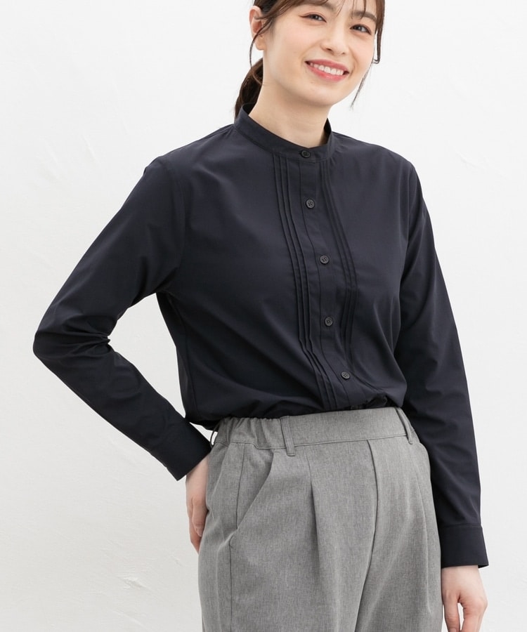 程よい抜け感のスタンドカラーと、フロントのピンタックが上品なデザイン。