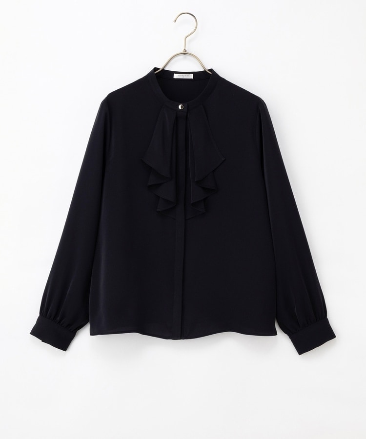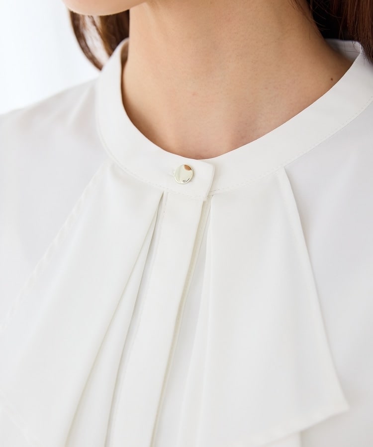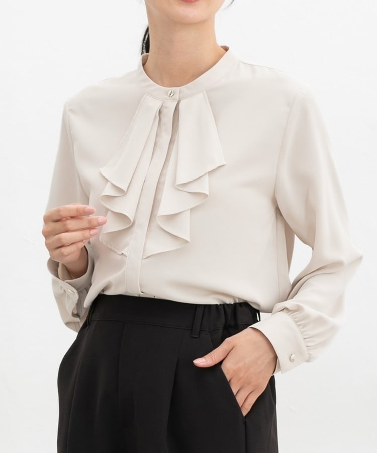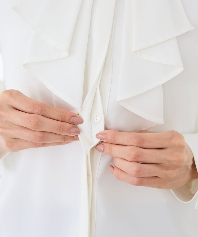 流れるようなドレープのラッフルフリルに、さりげないゴールドボタンがアクセント。