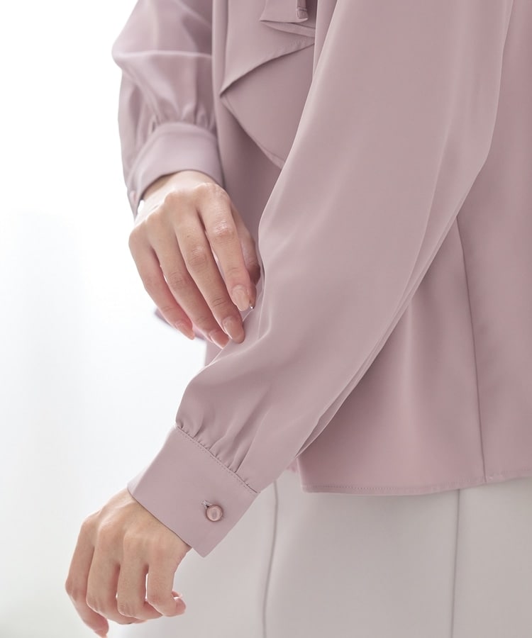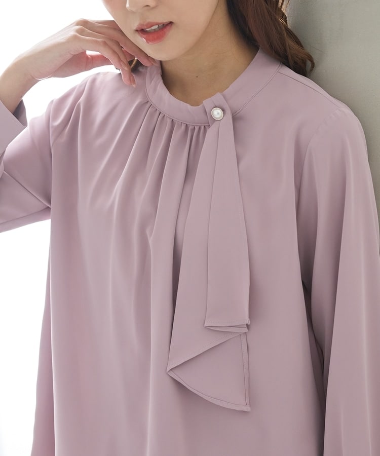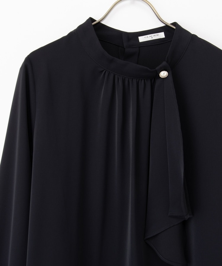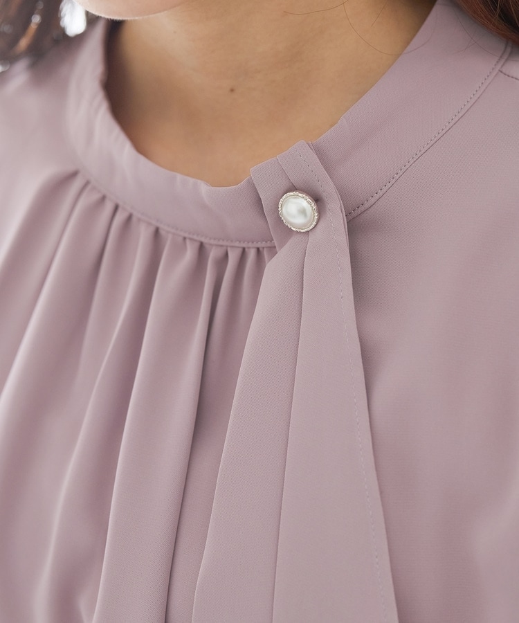 リボンを結ぶ必要のないアシンメトリーのボウタイに、パール風ボタンを飾った華やかで上品なデザイン。