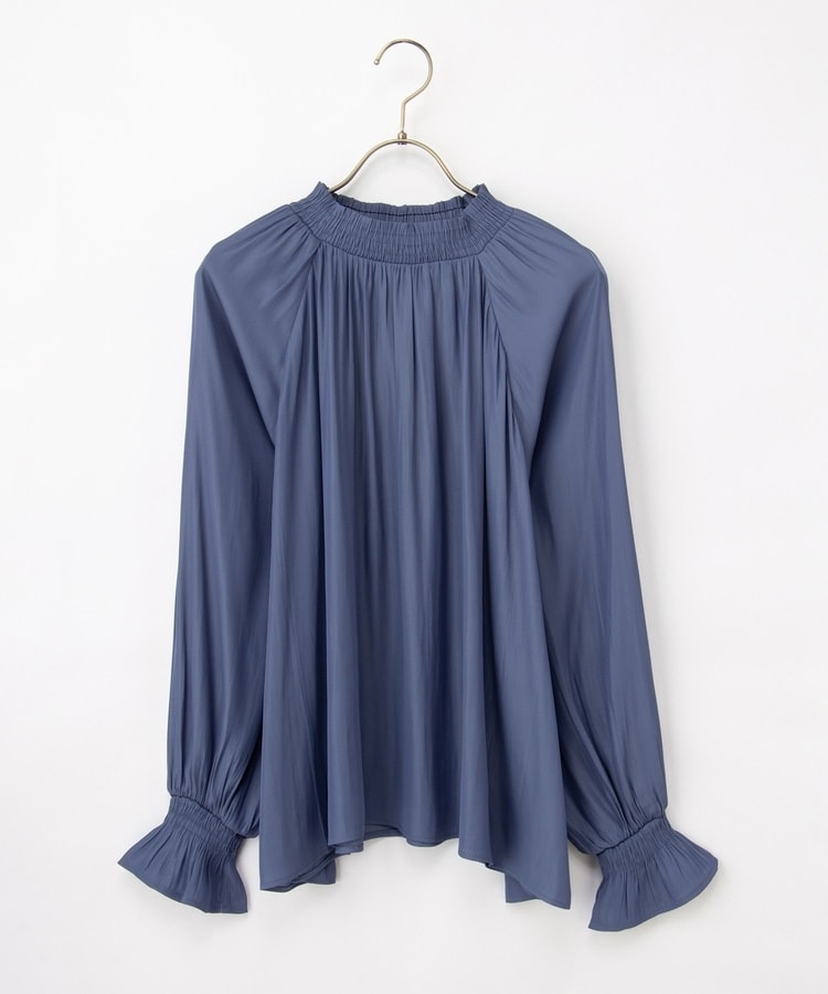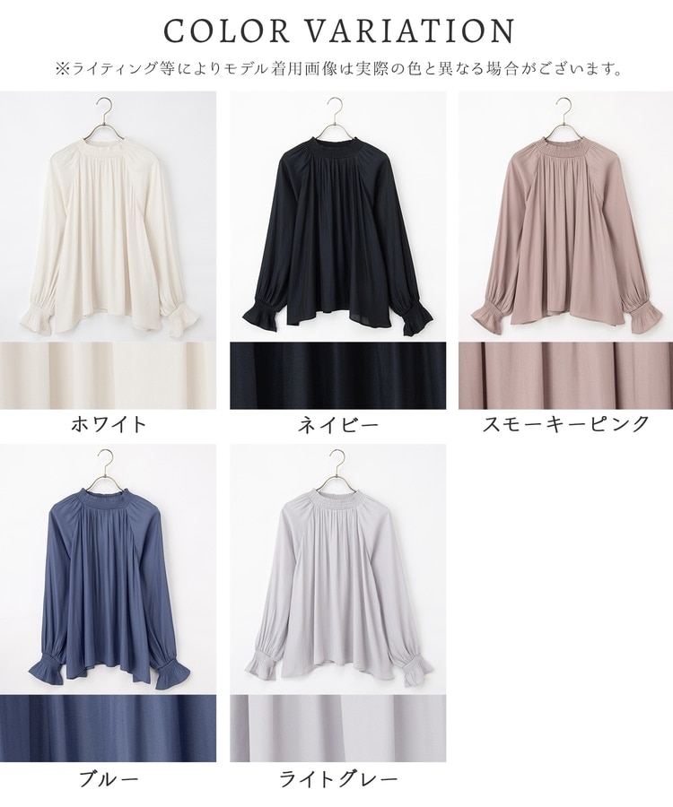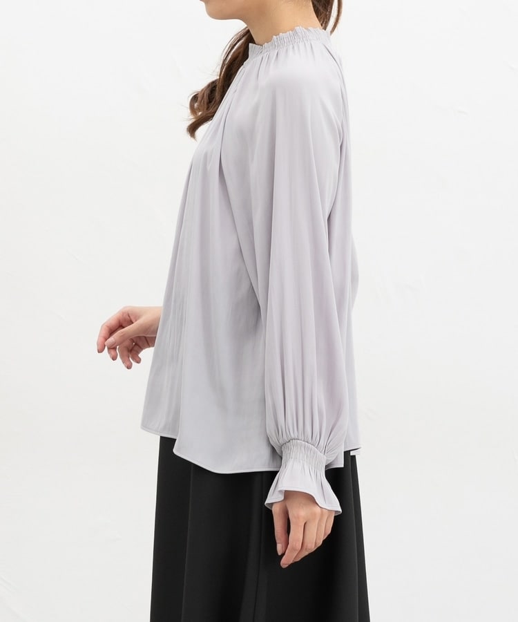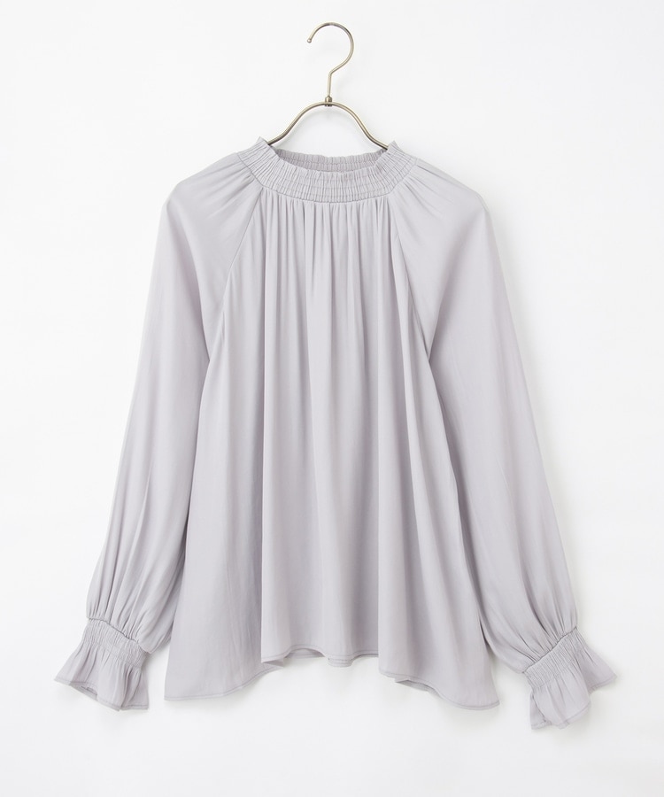 衿と袖口のゴムシャーリングでほんのりクラシカルな雰囲気のデザイン。