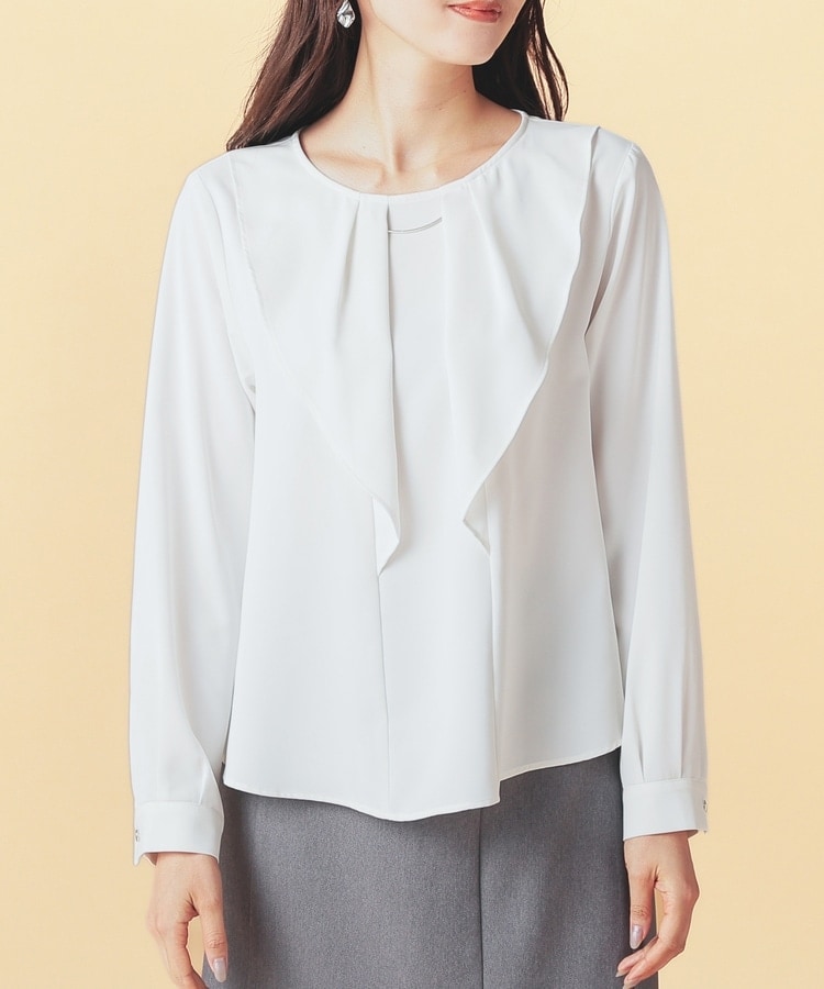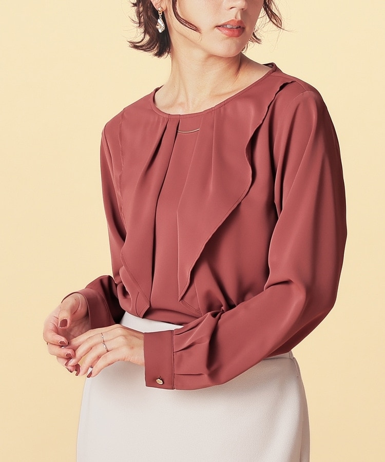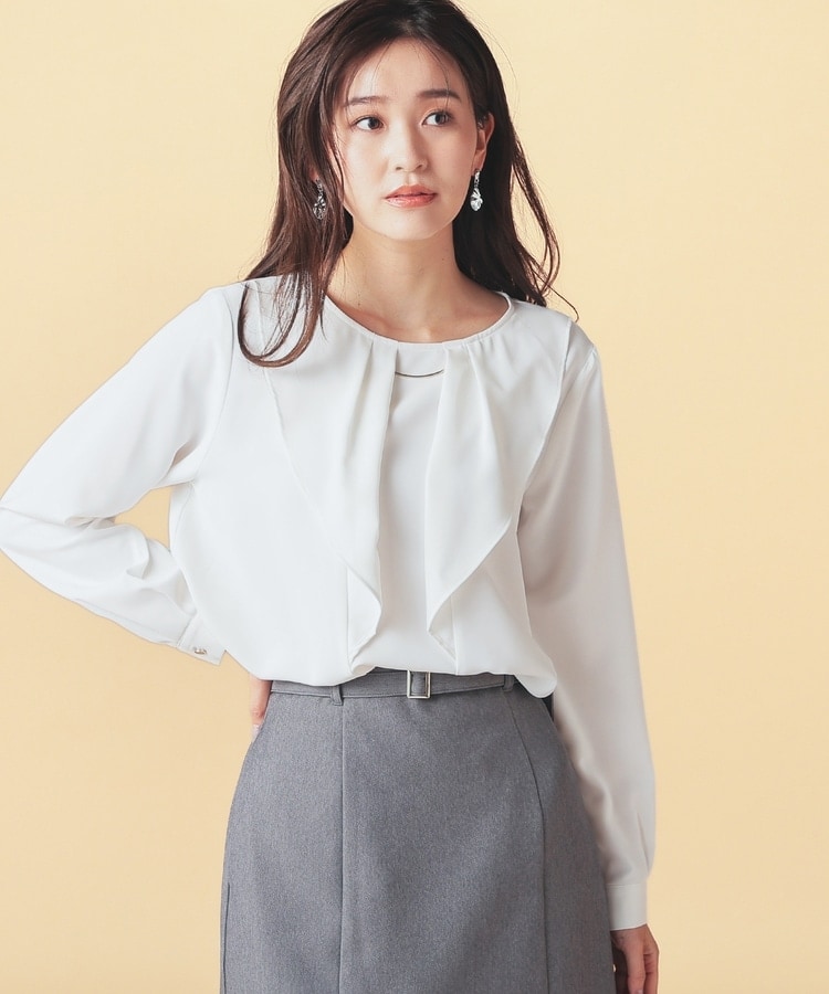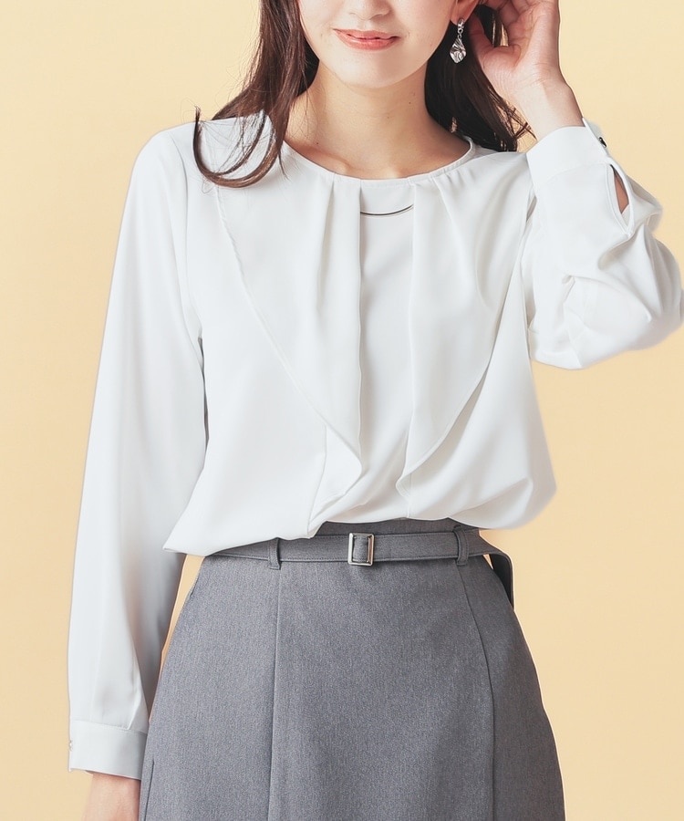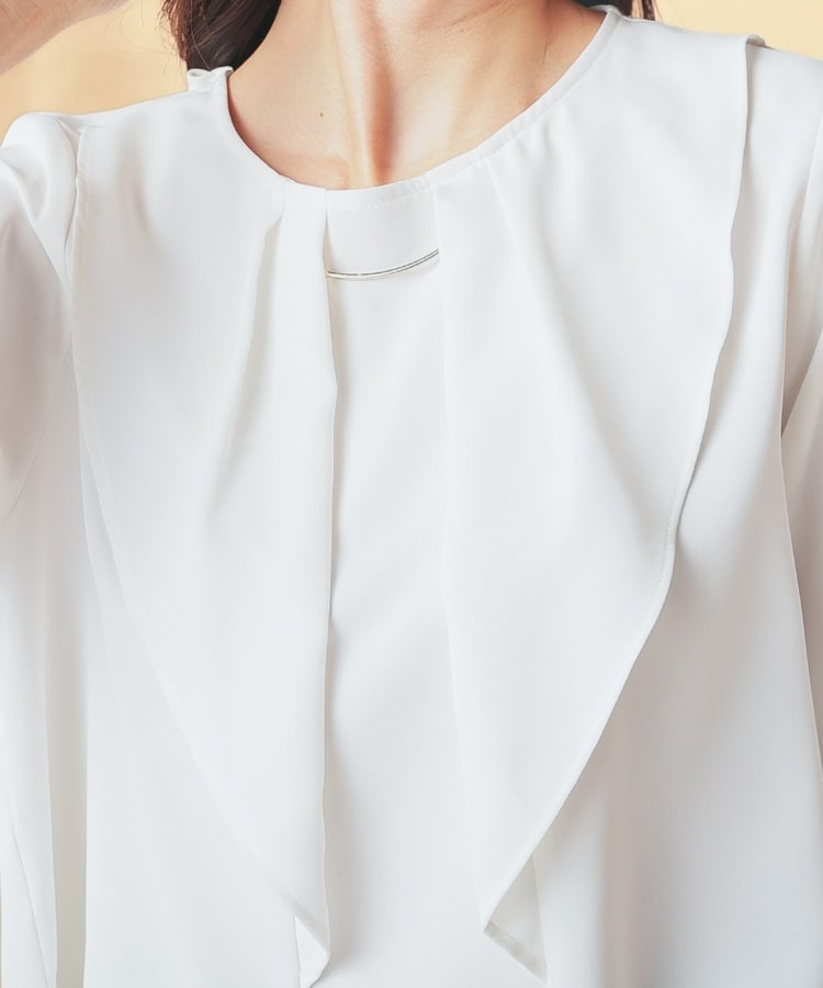 顔回りに華やかさをプラスしてくれるラッフルフリルに、シーンや気分に合わせて取り外しできるメタルパーツのアクセサリーがさりげないアクセント。
