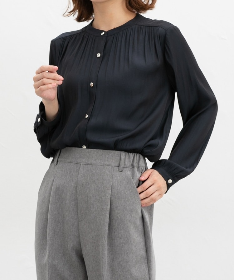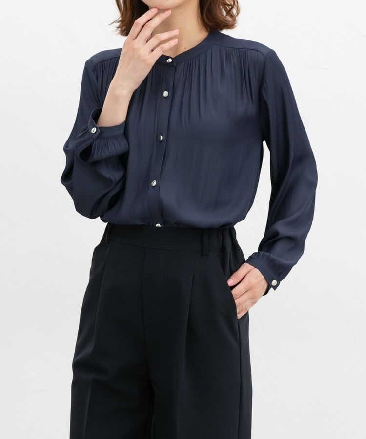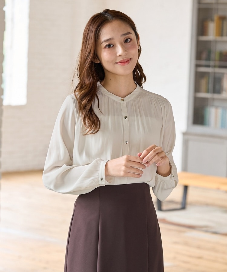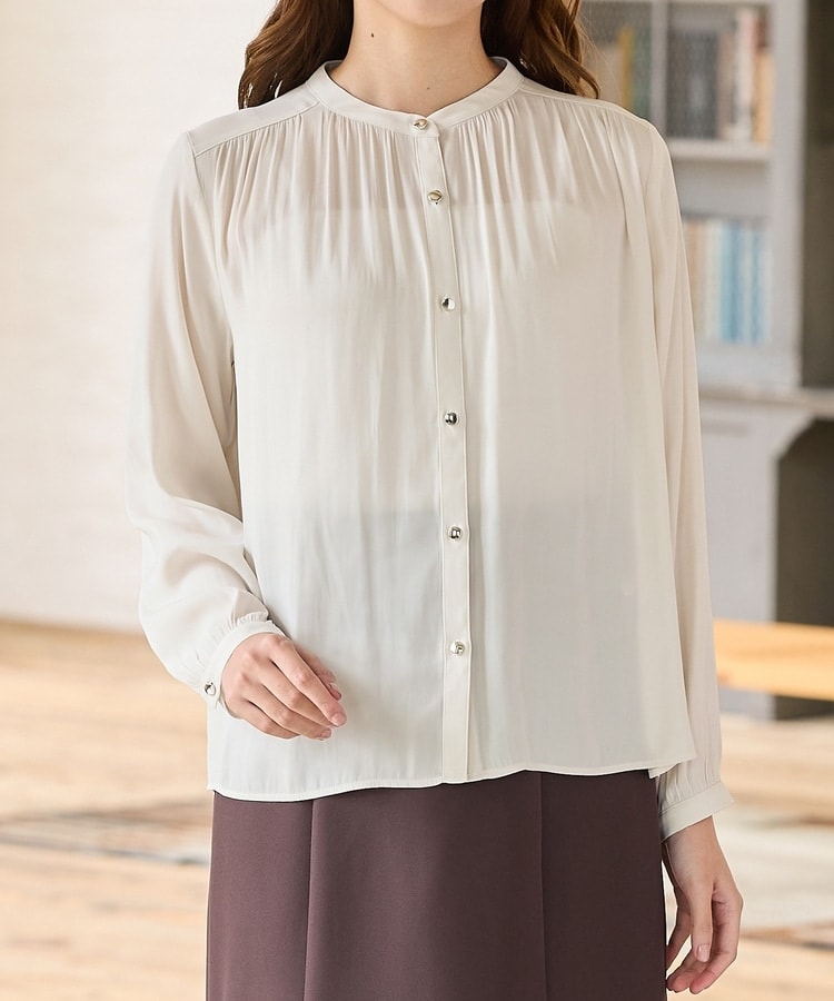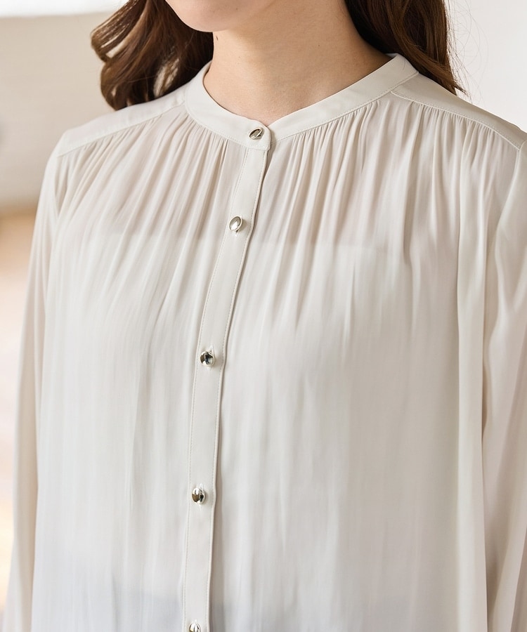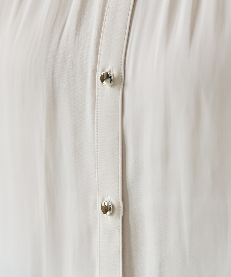 首元をすっきり見せるバンドカラーに、ゴールドボタンがさりげなく華やかなアクセント。