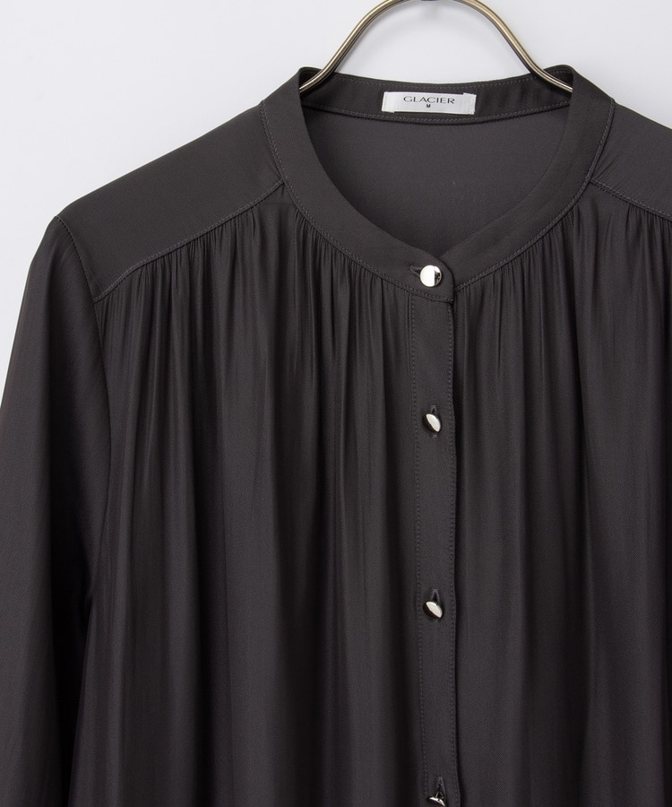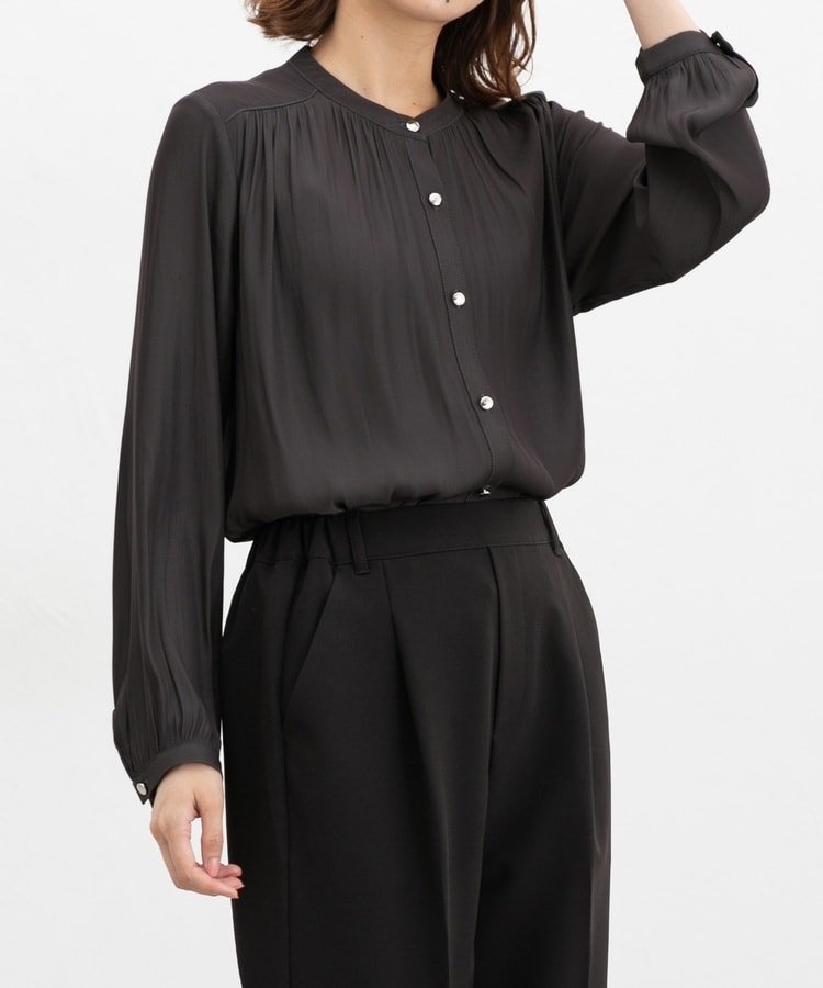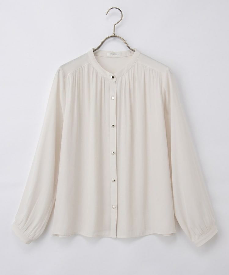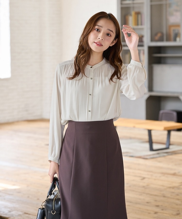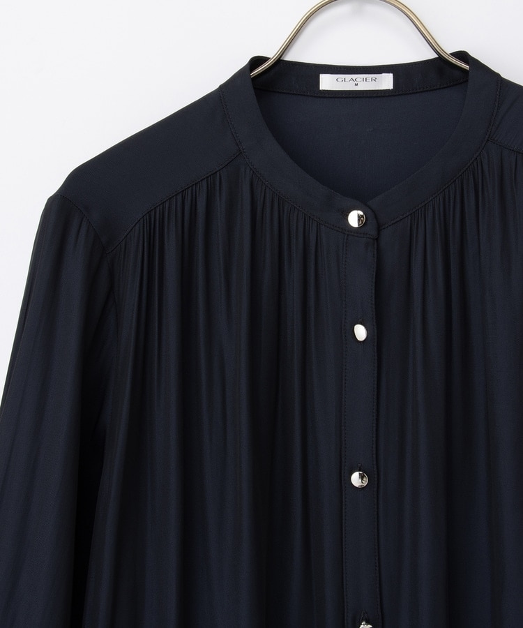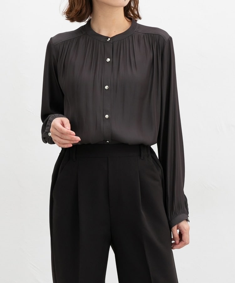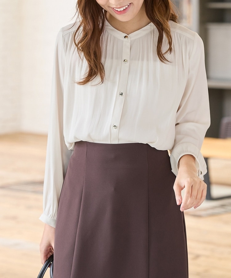 首元をすっきり見せるバンドカラーに、ゴールドボタンがさりげなく華やかなアクセント。