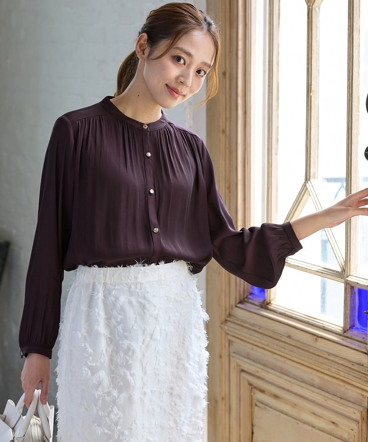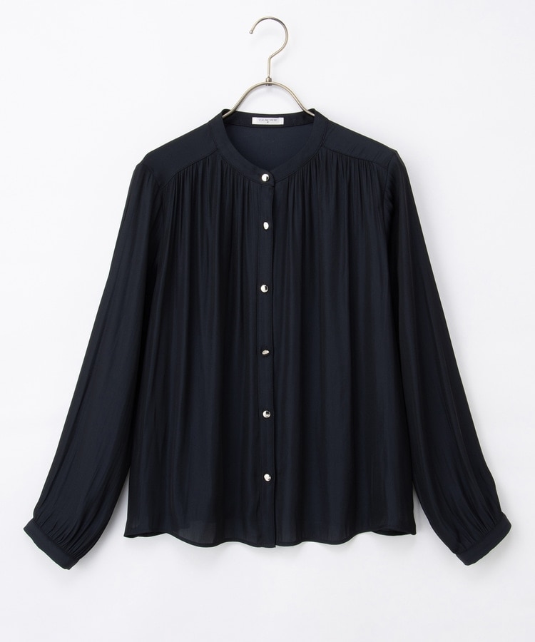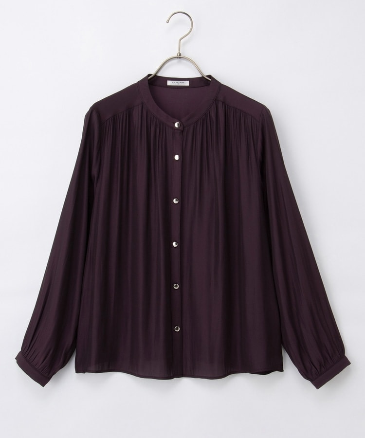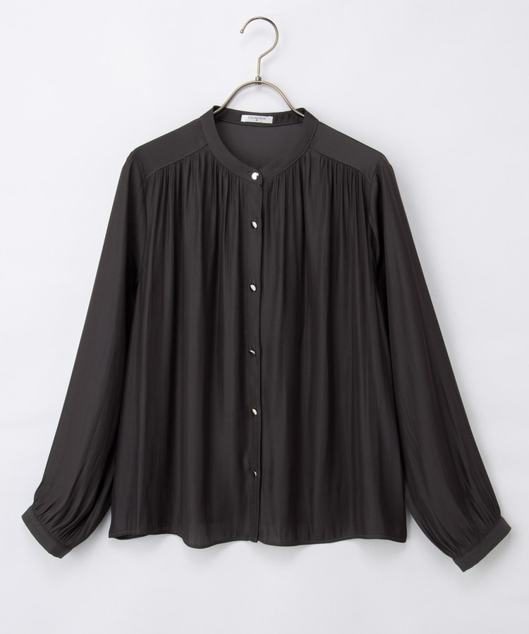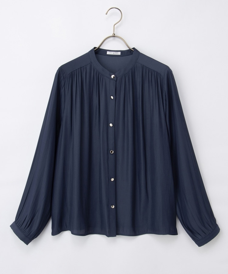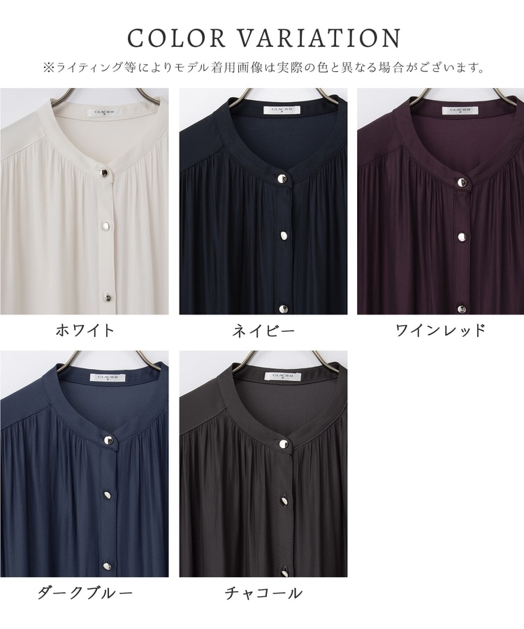 首元をすっきり見せるバンドカラーに、ゴールドボタンがさりげなく華やかなアクセント。