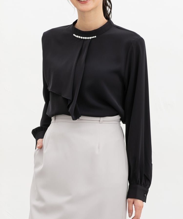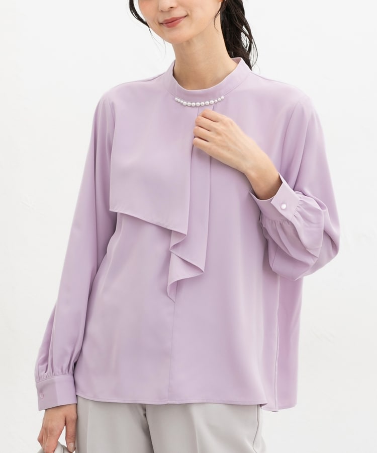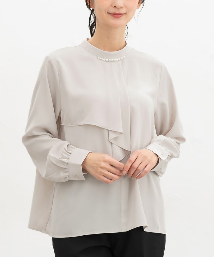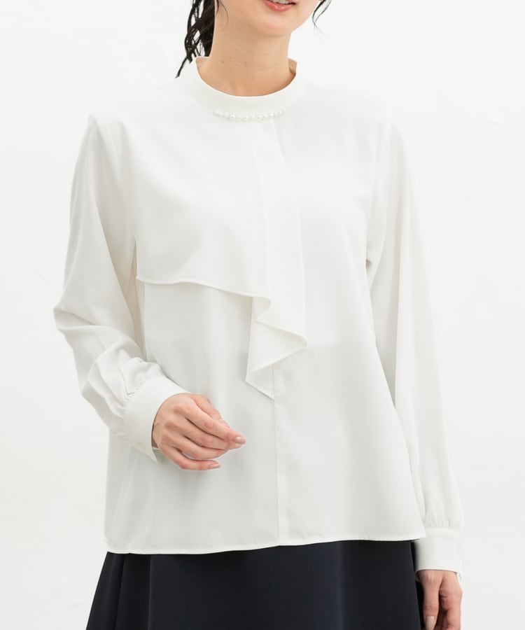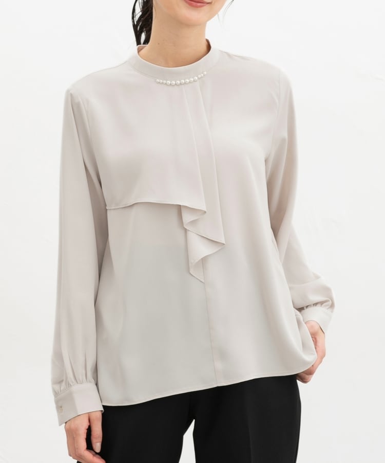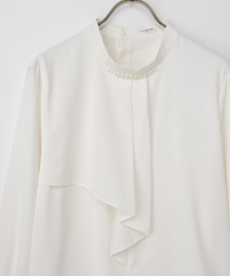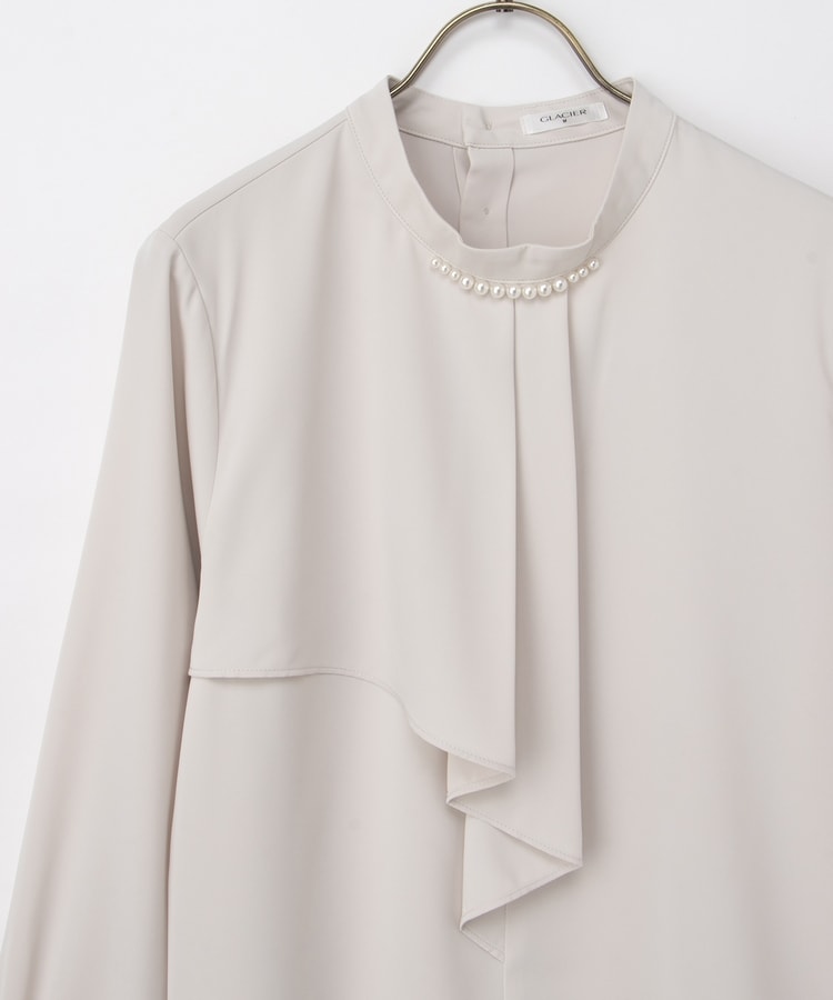 衿元のパール風ビーズがさりげなく華やかで上品な印象をプラス。