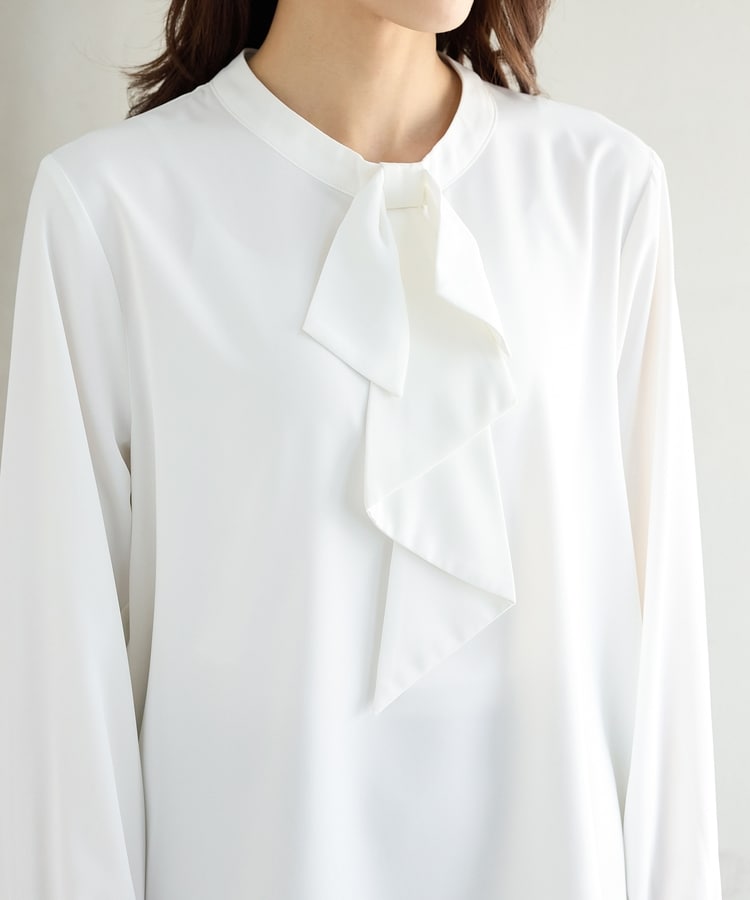 流れるようなドレープのラッフルフリルに、結び直す必要のないリボンを付けた華やかなデザイン。