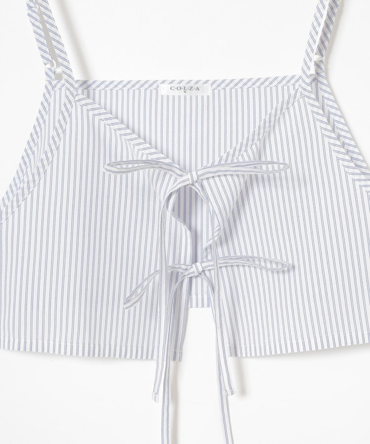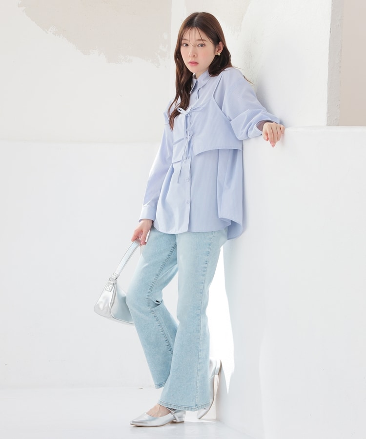 ベーシックなレギュラーカラーのシャツに、さっと重ねるだけでトレンド感がアップするキュートなダブルリボンのビスチェが付いたセット。